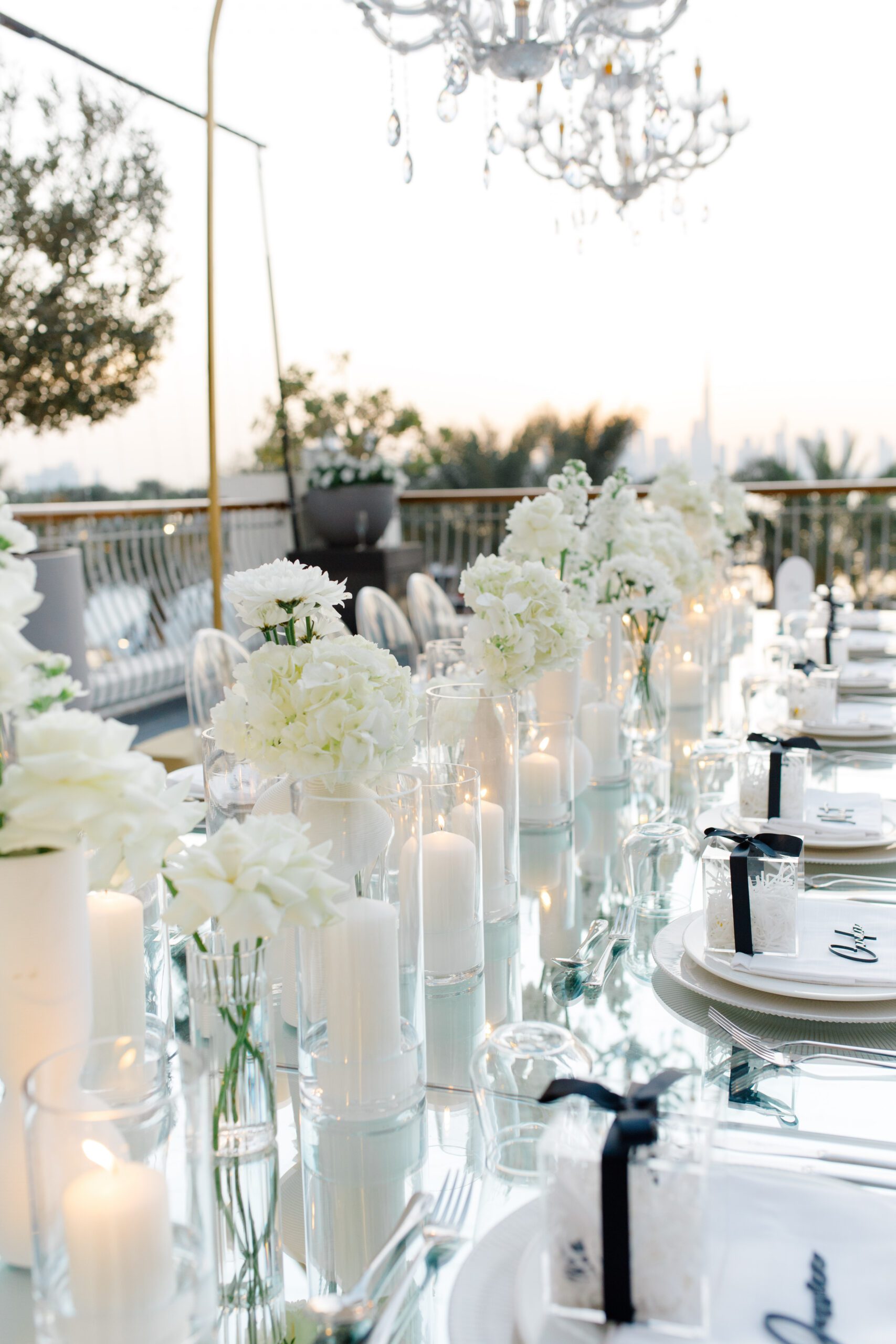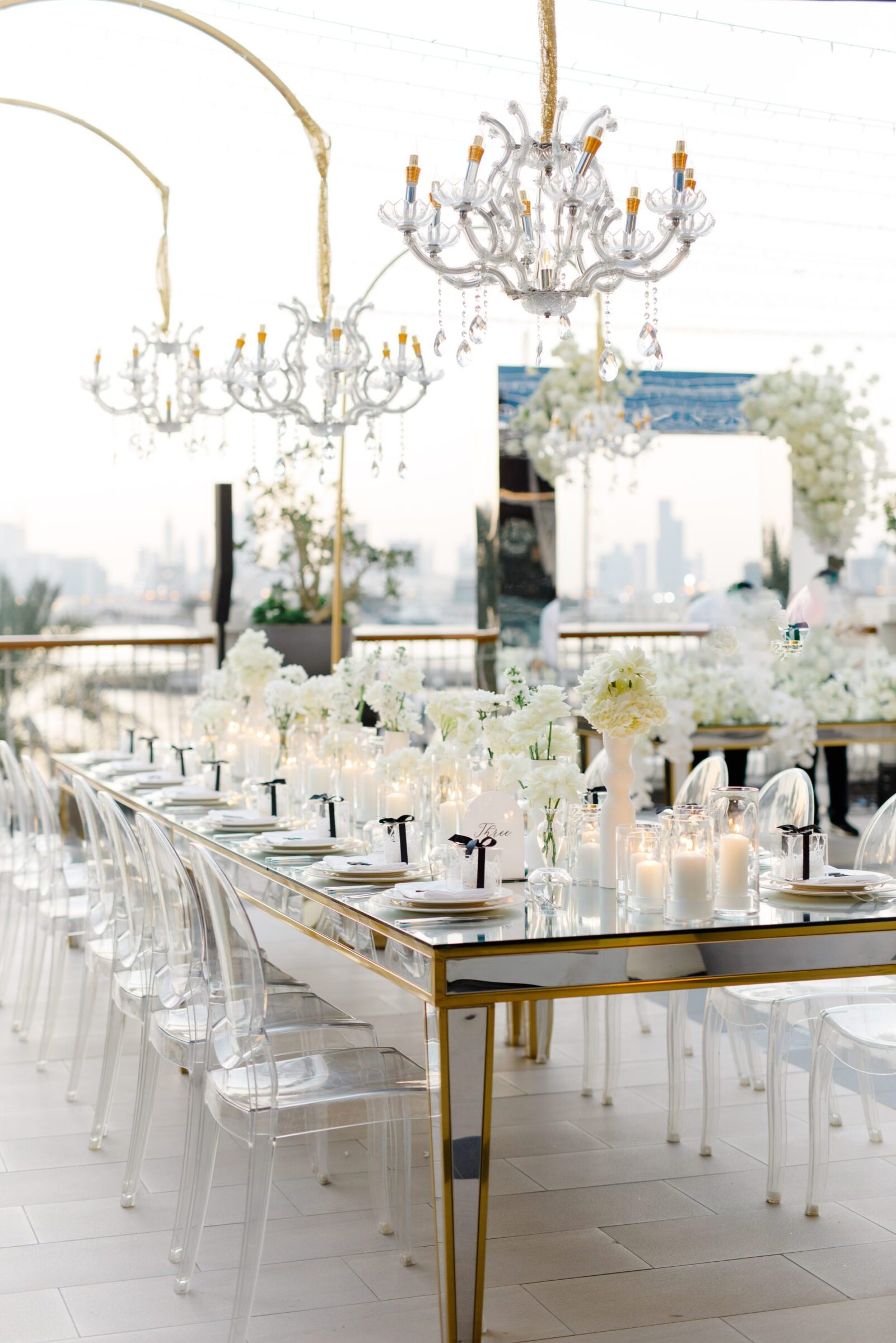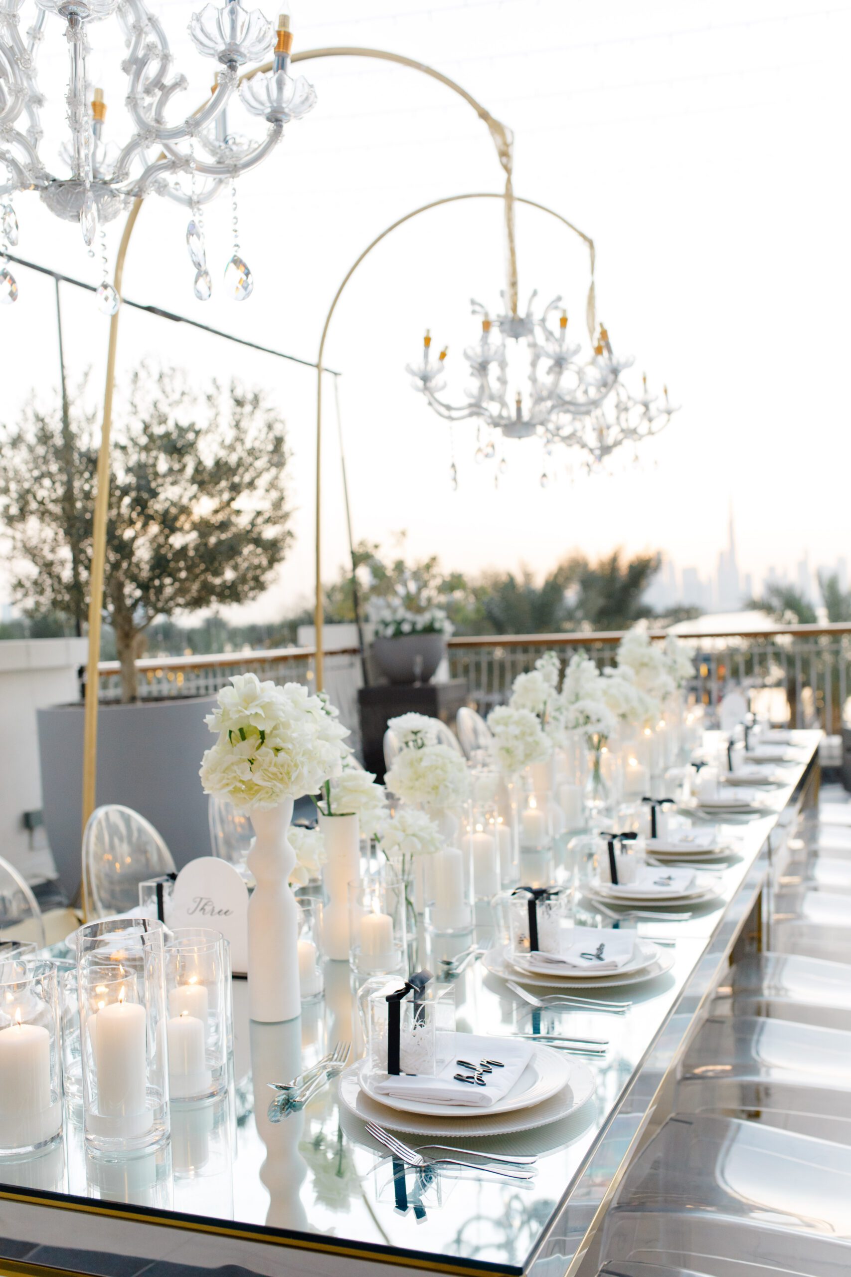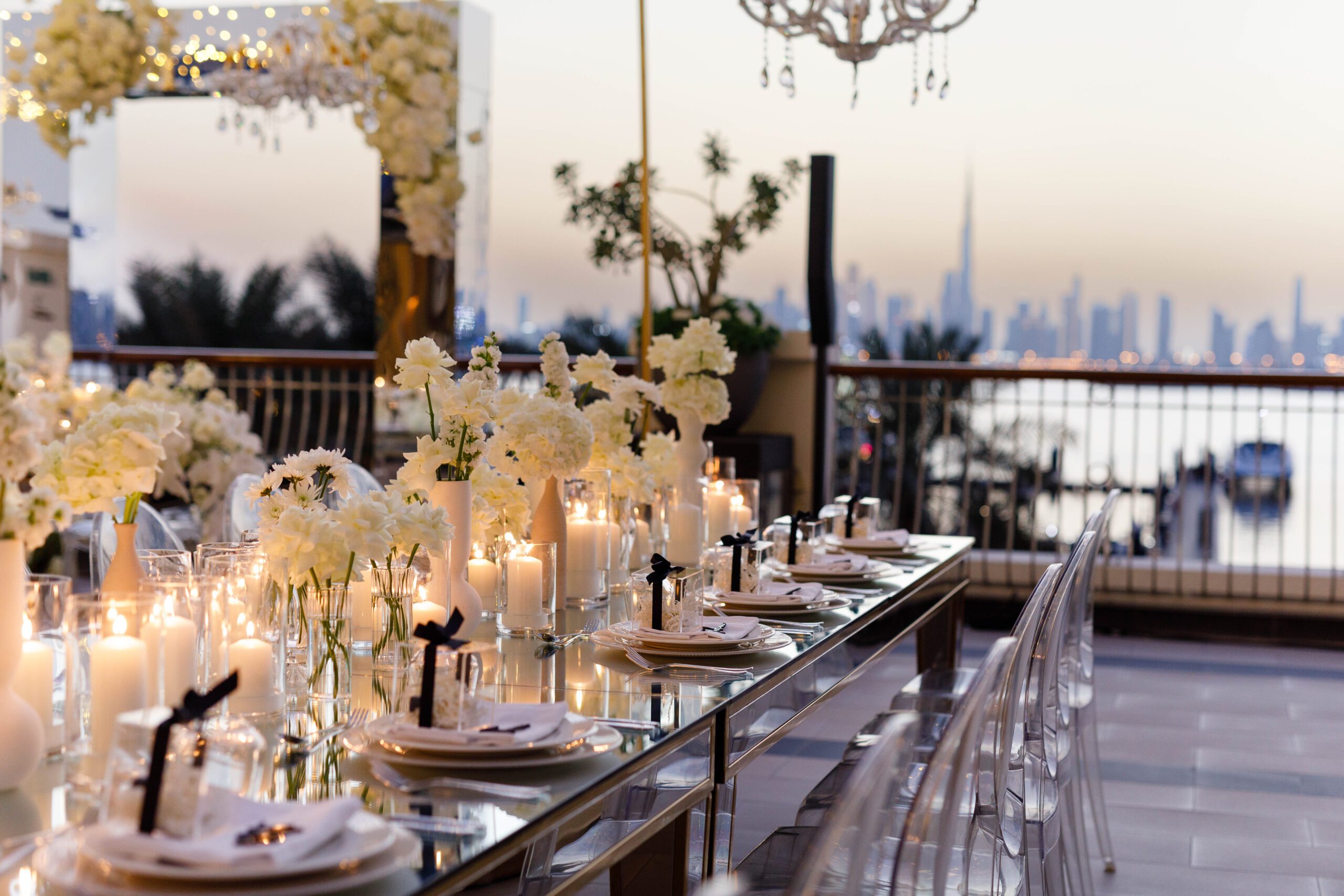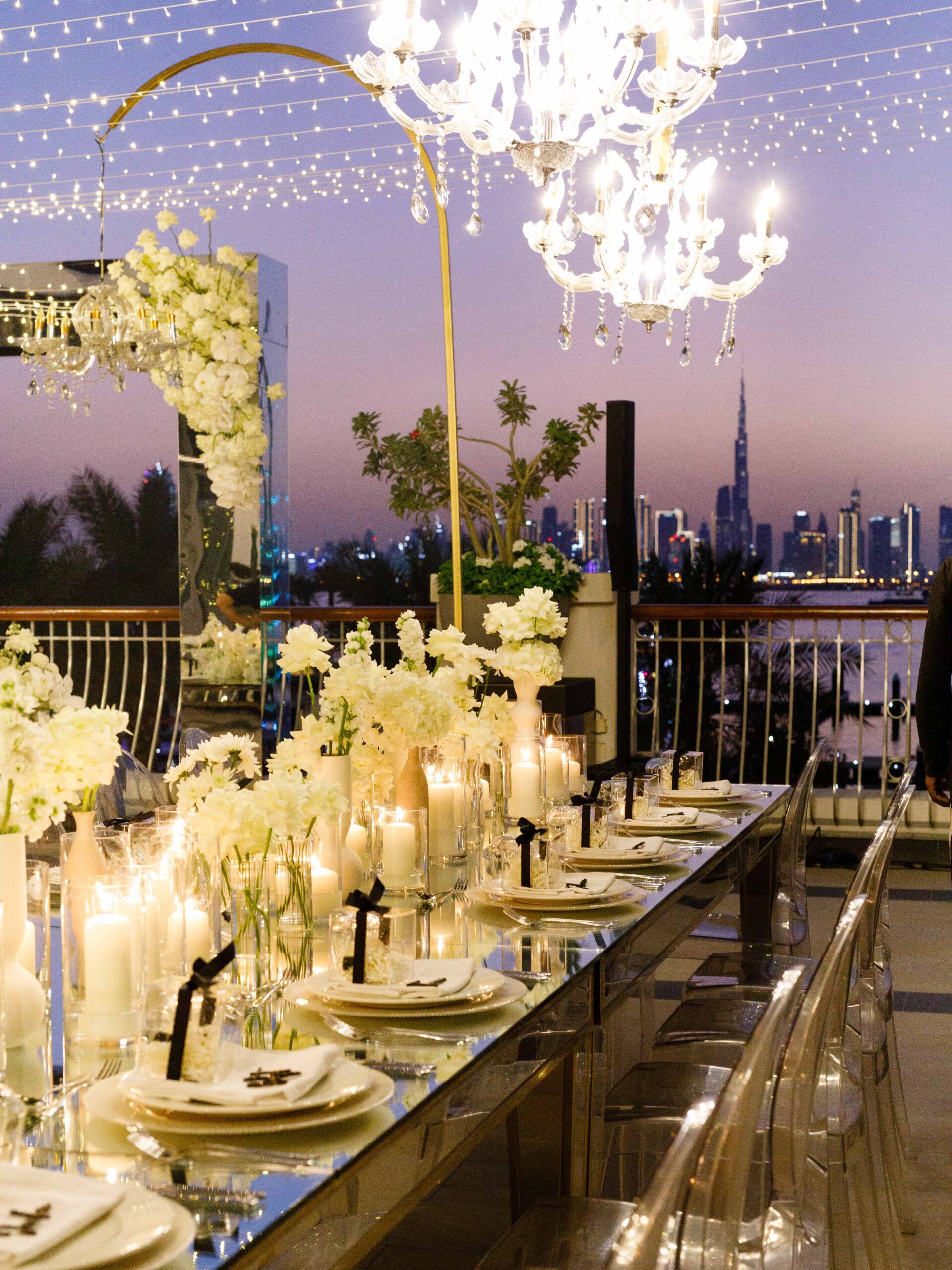 On the terrace of Vida Creek Hotel, overlooking the Dubai skyline, this destination wedding brought sleek sophistication to life. With mirror tables, crystal chandeliers, and all-white florals accented by touches of black, the design was minimal yet striking. The sunset ceremony seamlessly transformed into a chic evening reception, as the couple celebrated their love with an unforgettable view - having journeyed all the way from the UK to say 'I do' in Dubai with their friends and family.