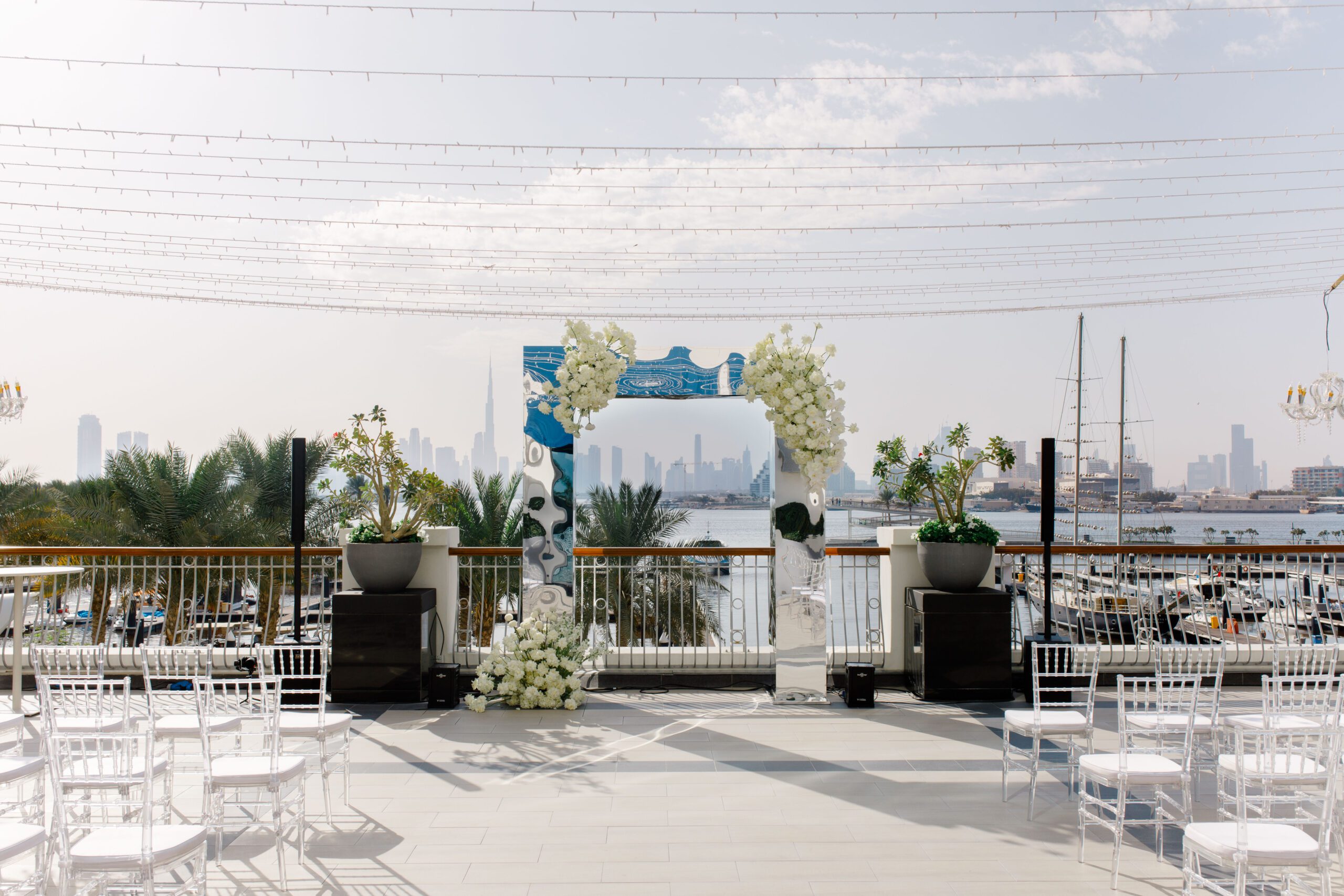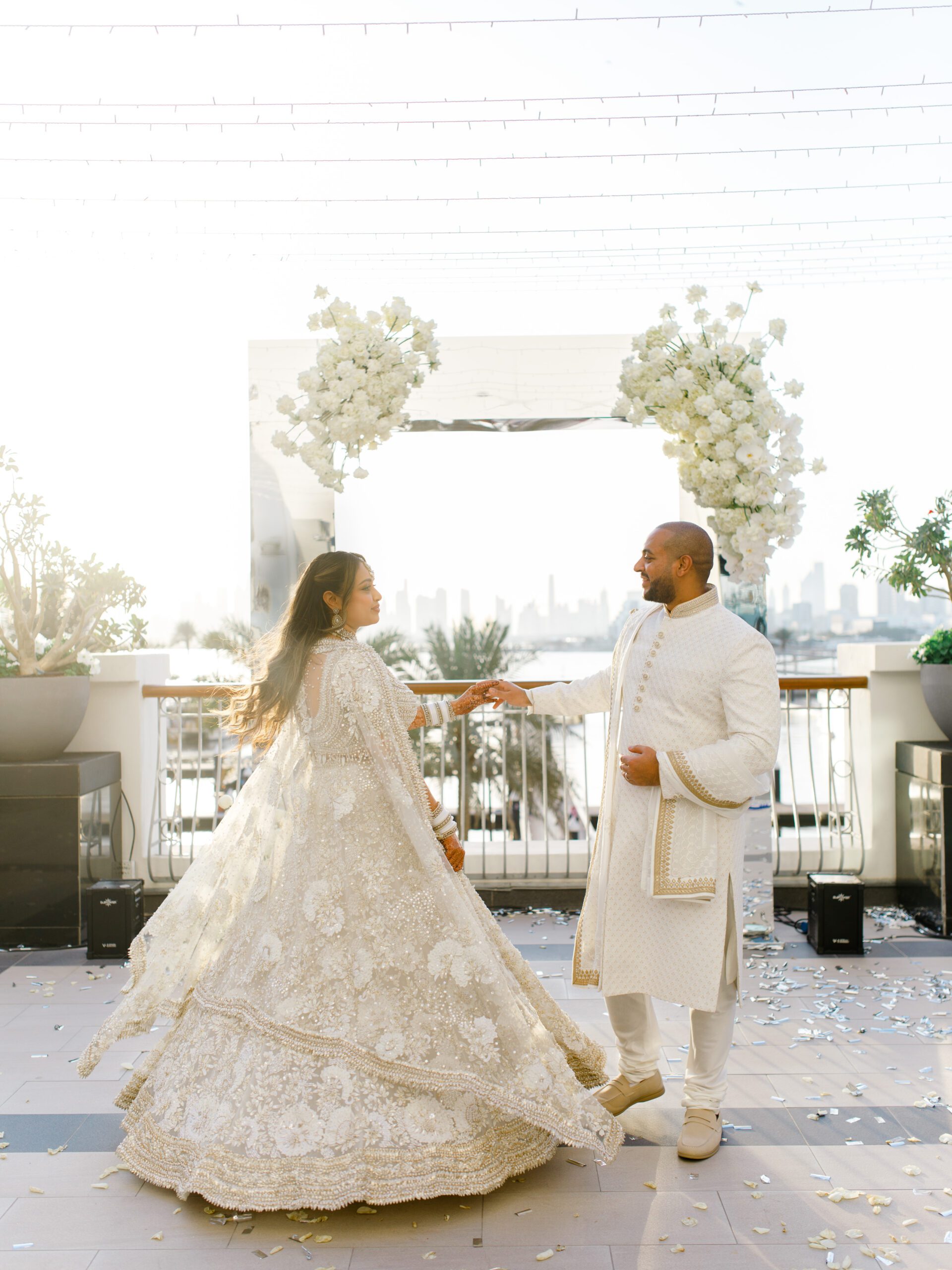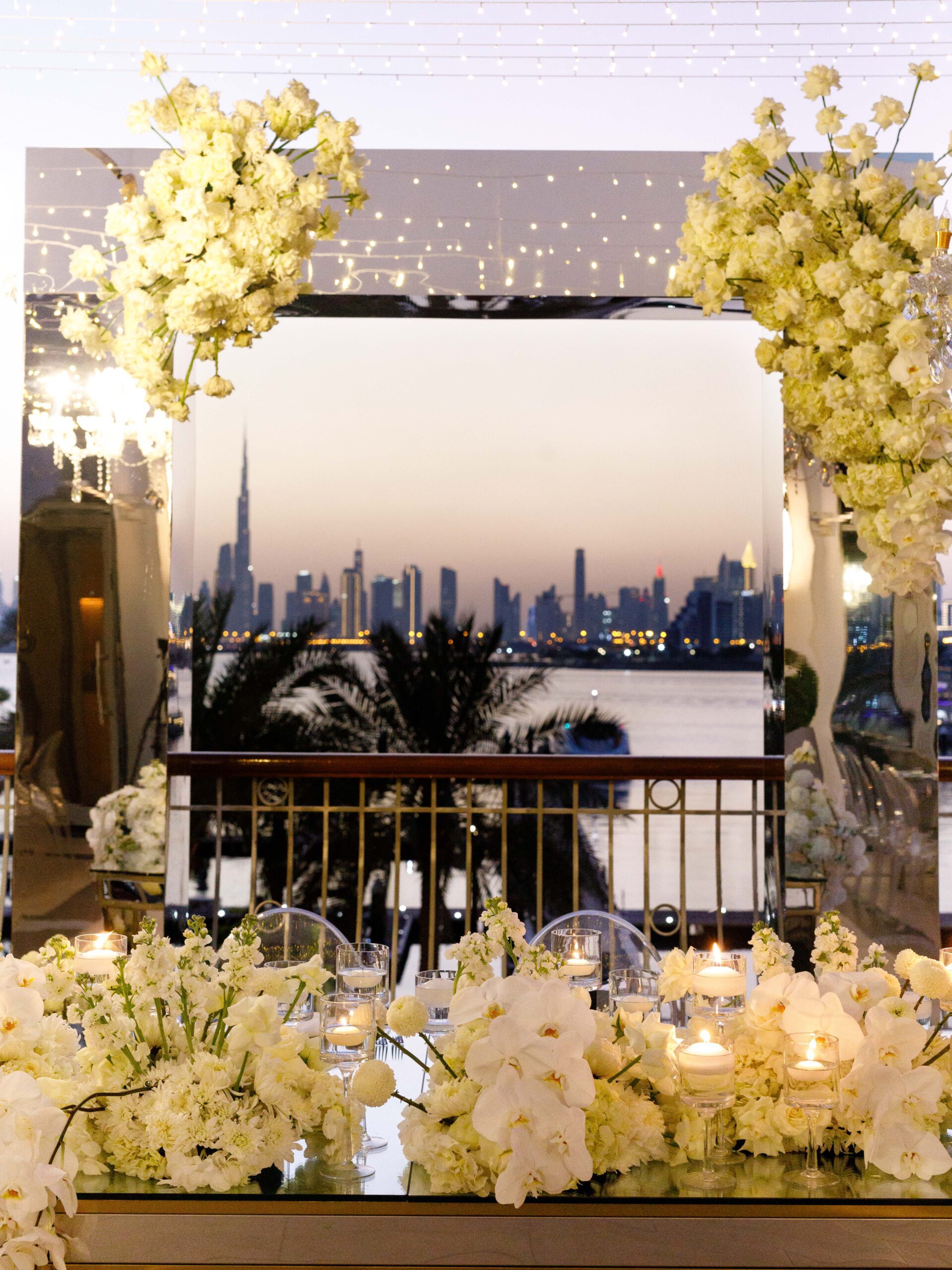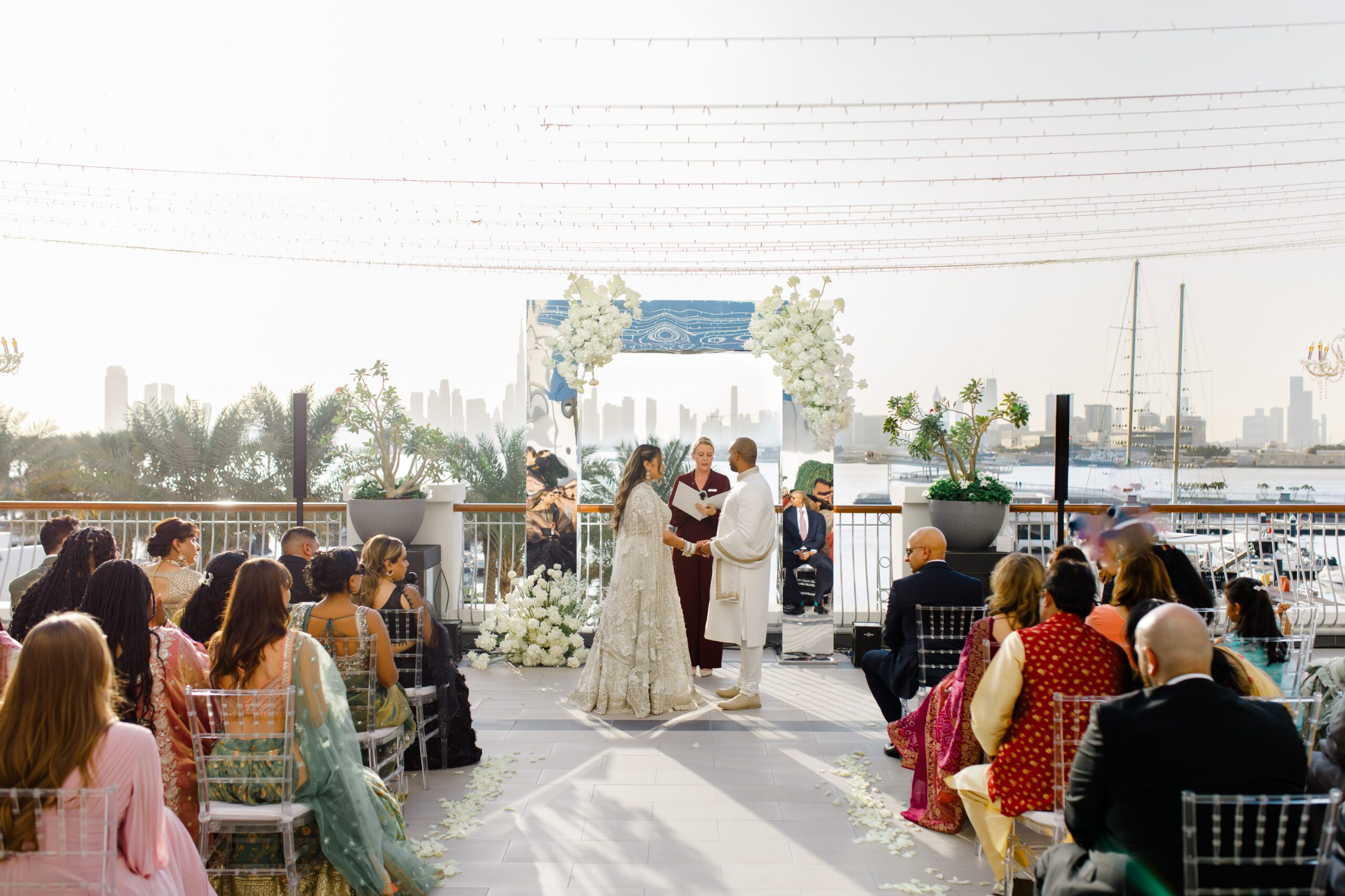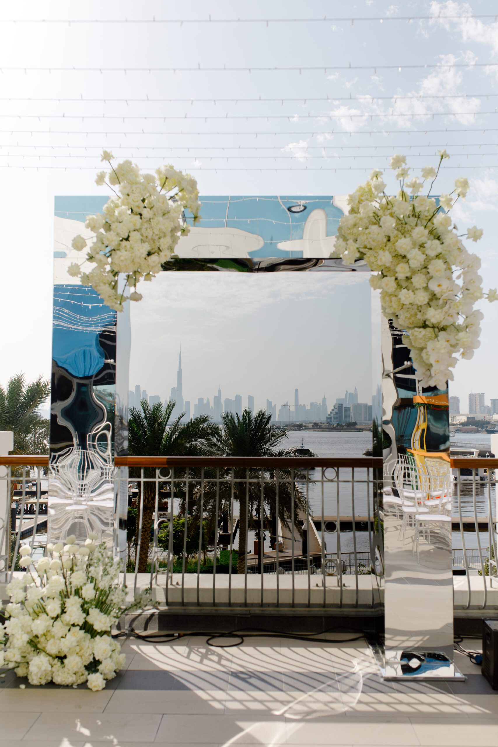 On the terrace of Vida Creek Hotel, overlooking the Dubai skyline, this destination wedding brought sleek sophistication to life. With mirror tables, crystal chandeliers, and all-white florals accented by touches of black, the design was minimal yet striking. The sunset ceremony seamlessly transformed into a chic evening reception, as the couple celebrated their love with an unforgettable view - having journeyed all the way from the UK to say 'I do' in Dubai with their friends and family.