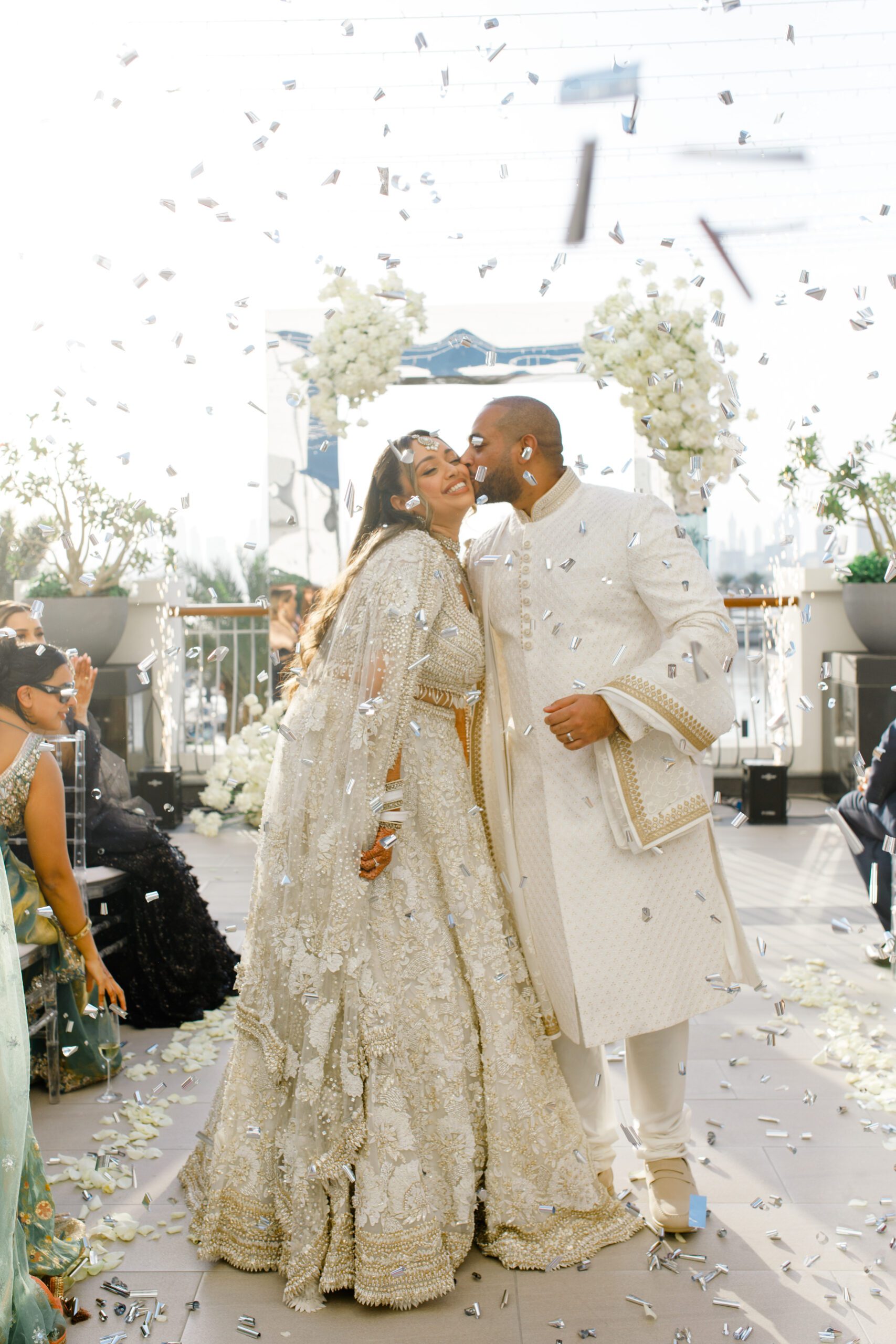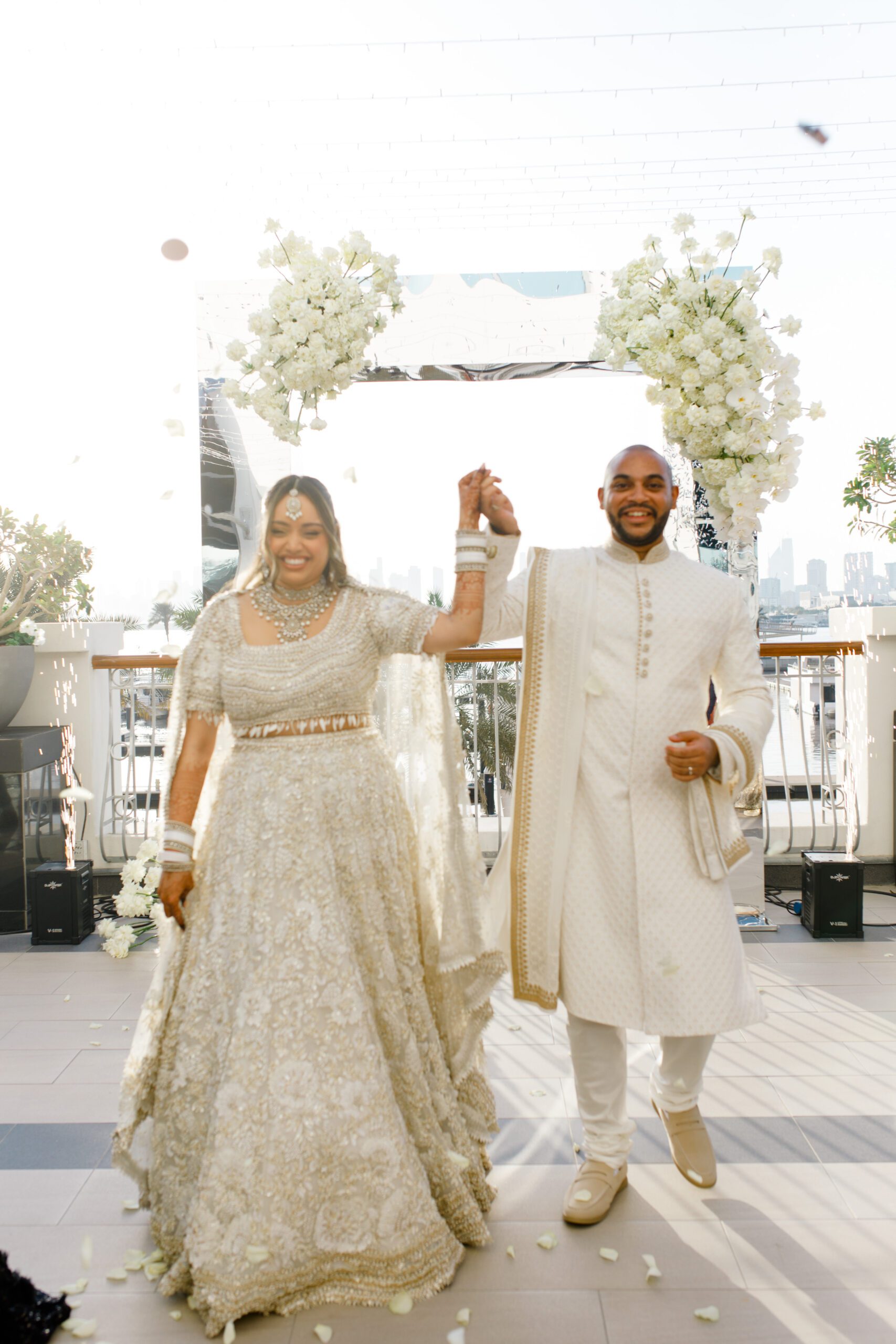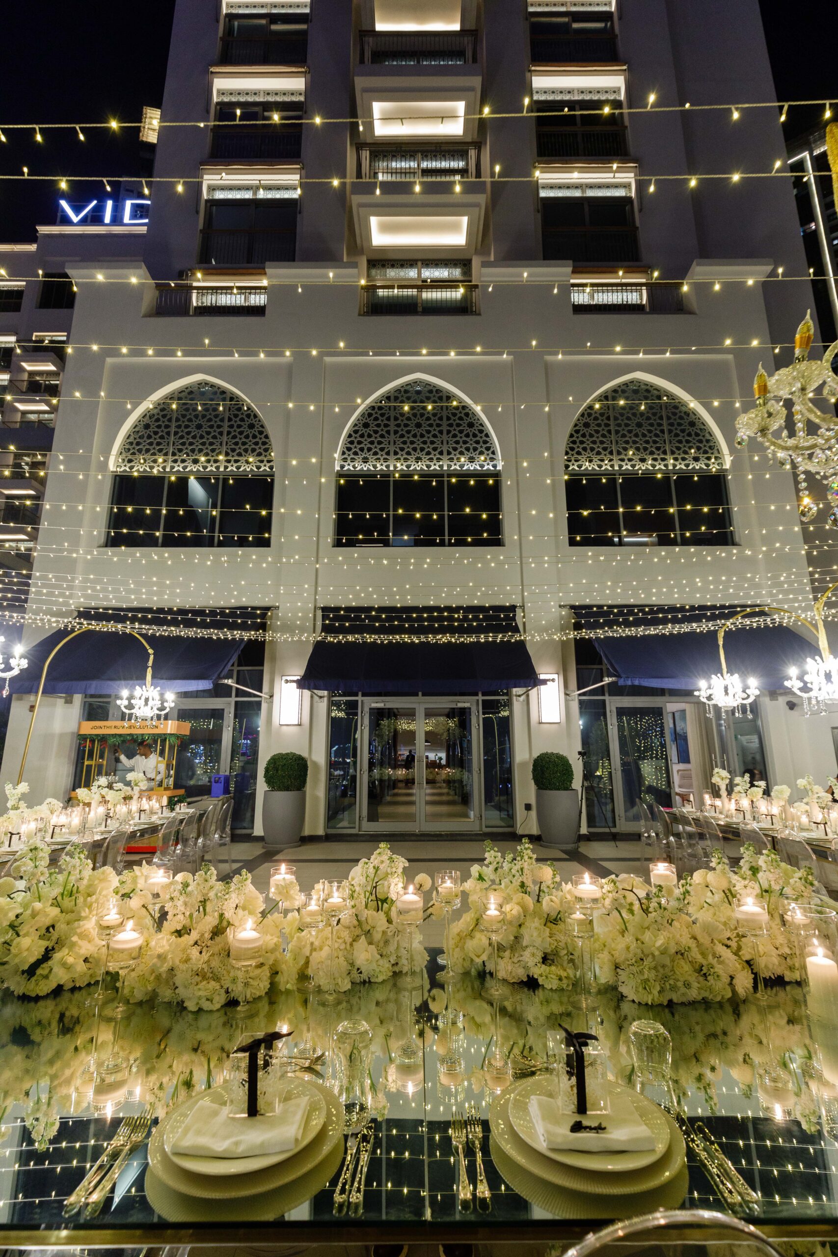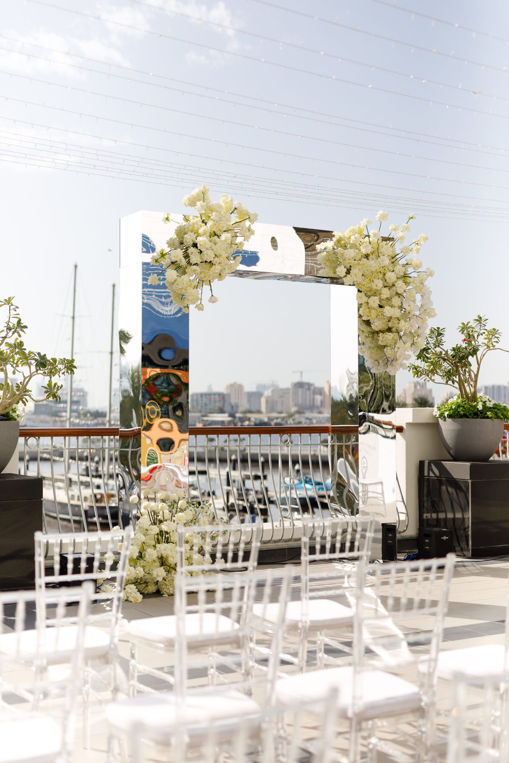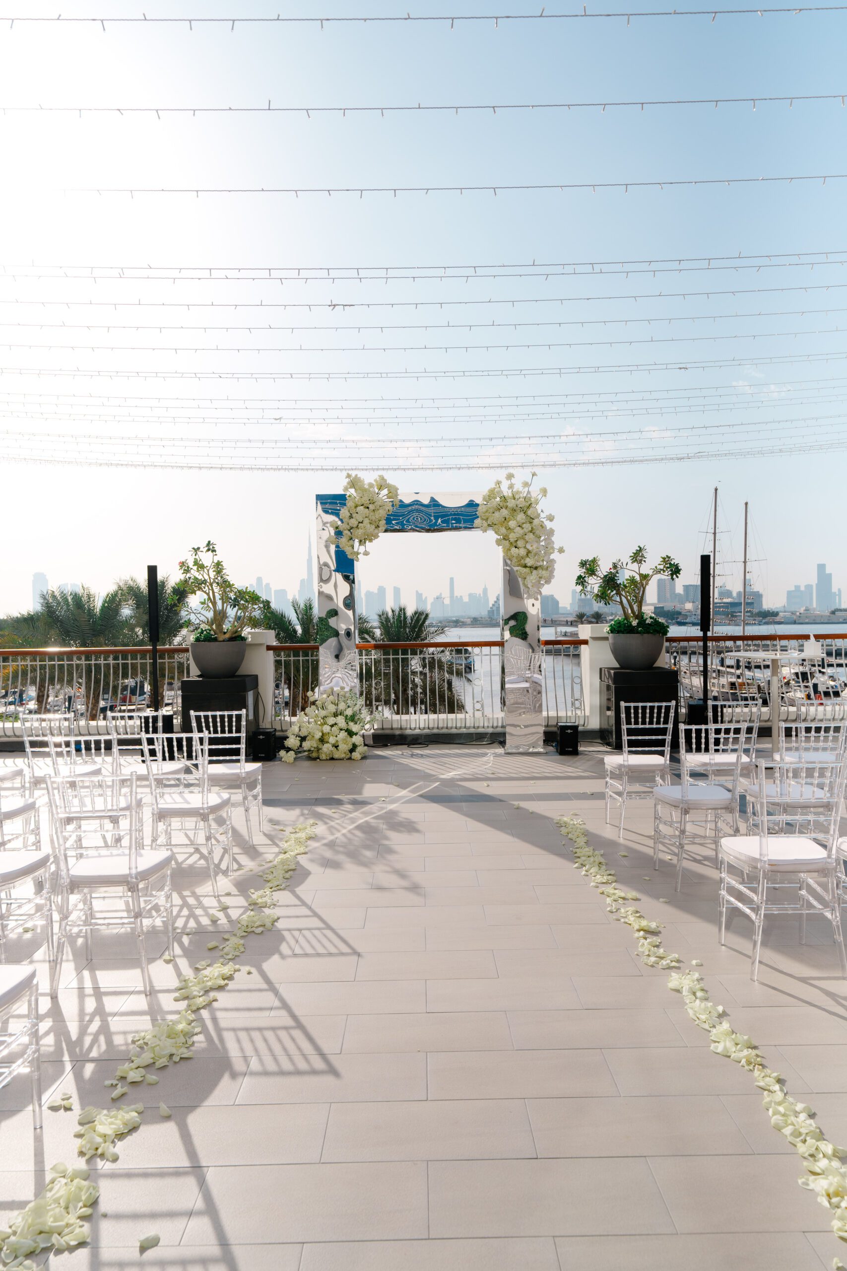 On the terrace of Vida Creek Hotel, overlooking the Dubai skyline, this destination wedding brought sleek sophistication to life. With mirror tables, crystal chandeliers, and all-white florals accented by touches of black, the design was minimal yet striking. The sunset ceremony seamlessly transformed into a chic evening reception, as the couple celebrated their love with an unforgettable view - having journeyed all the way from the UK to say 'I do' in Dubai with their friends and family.