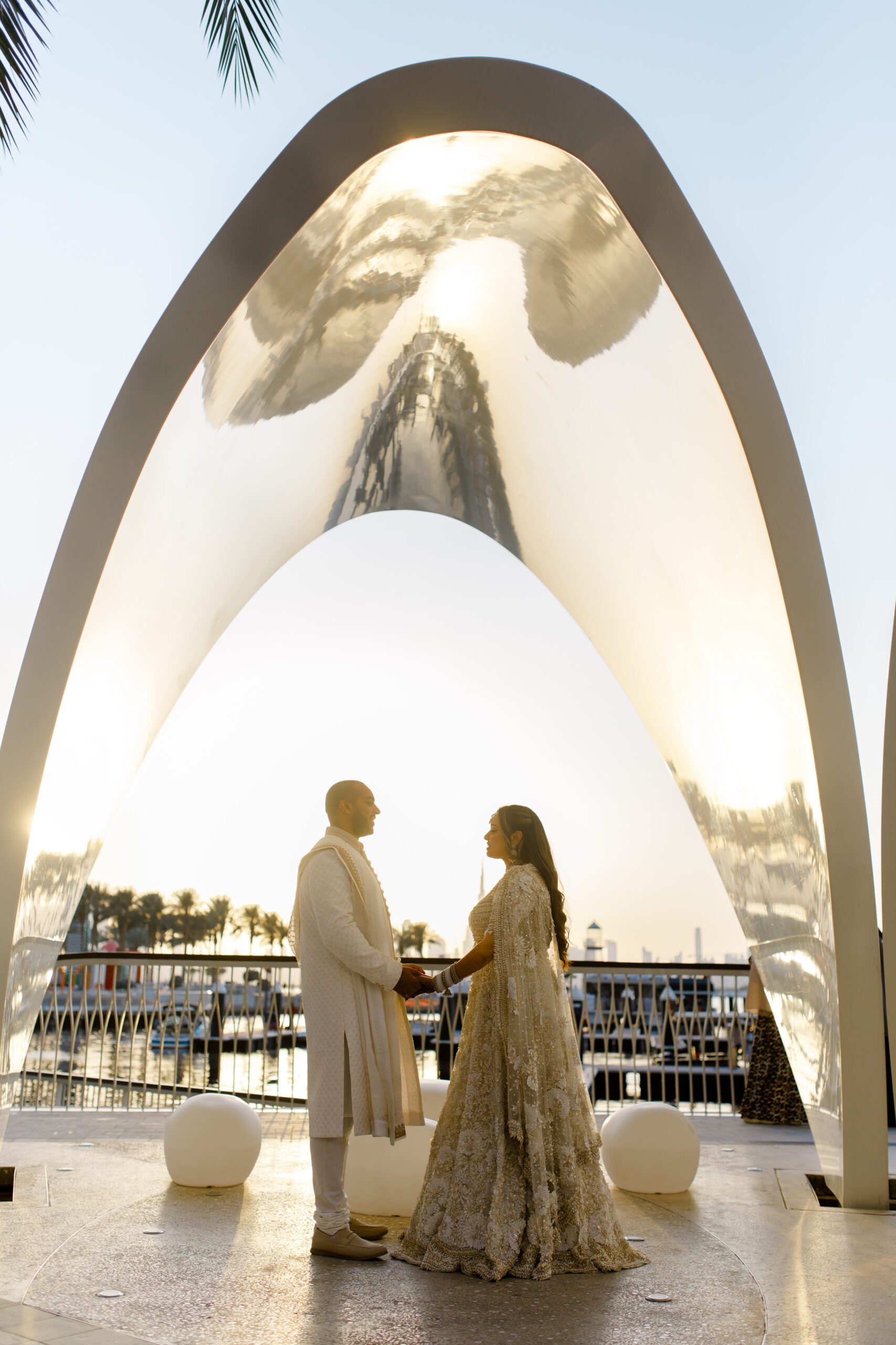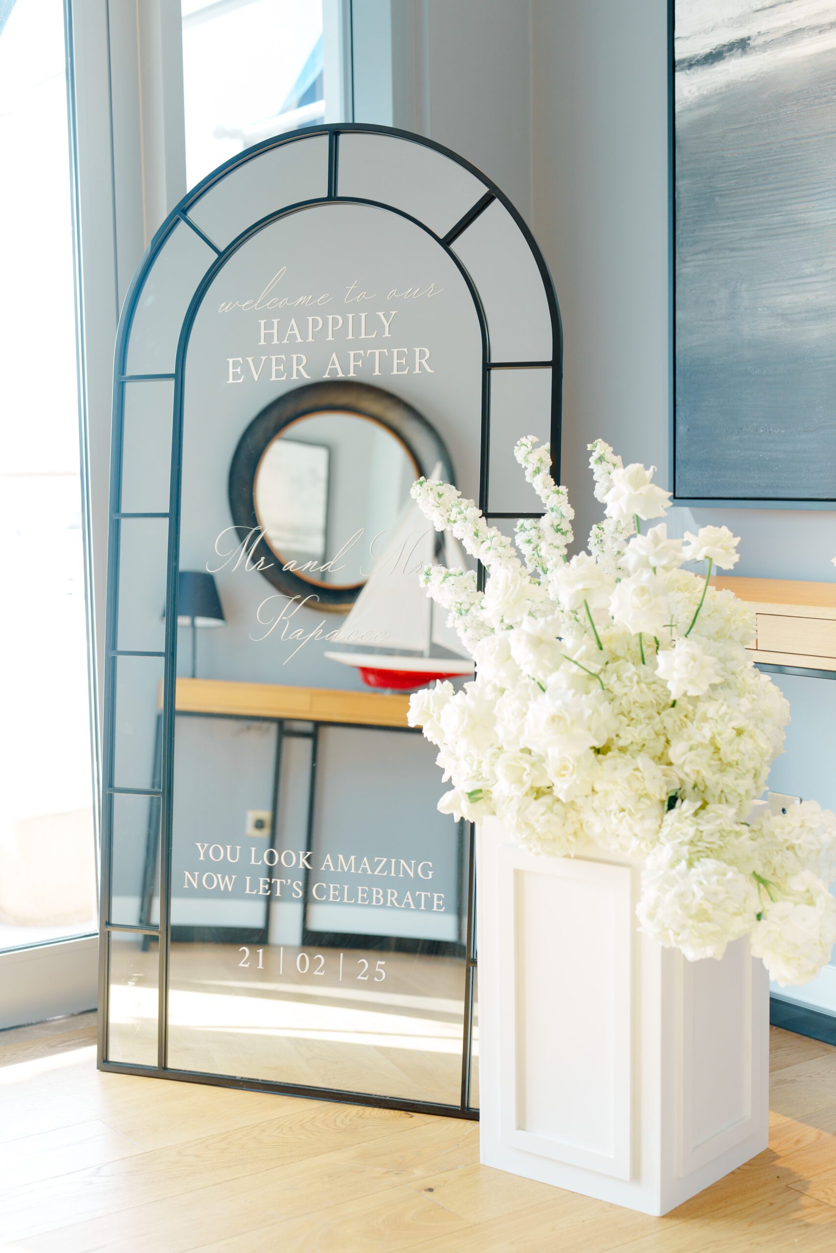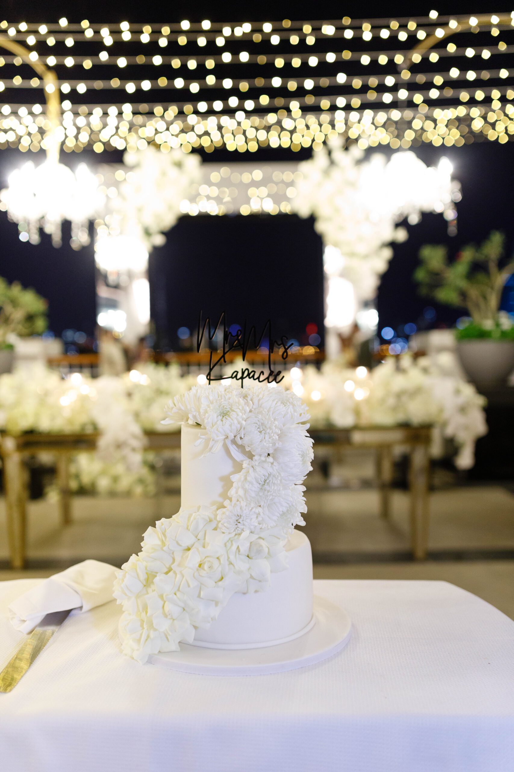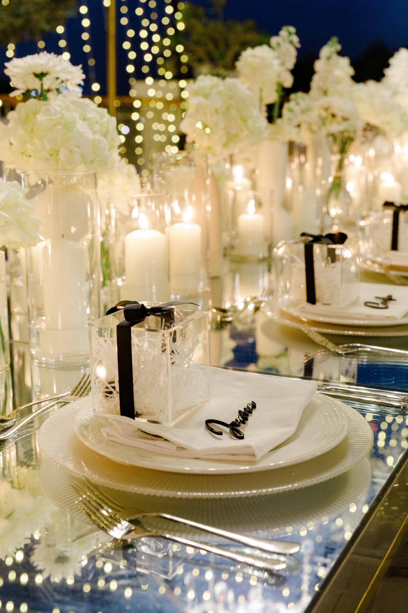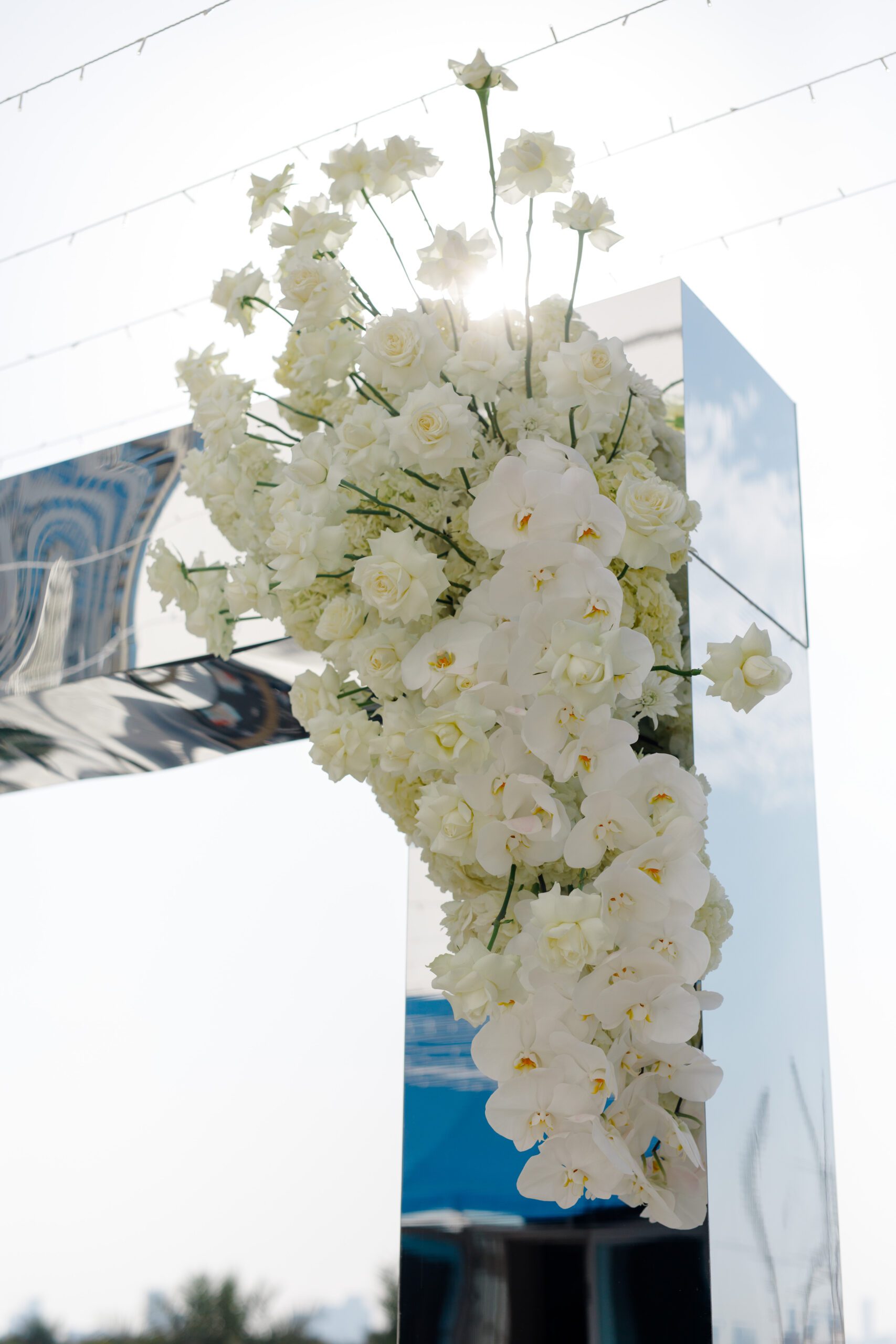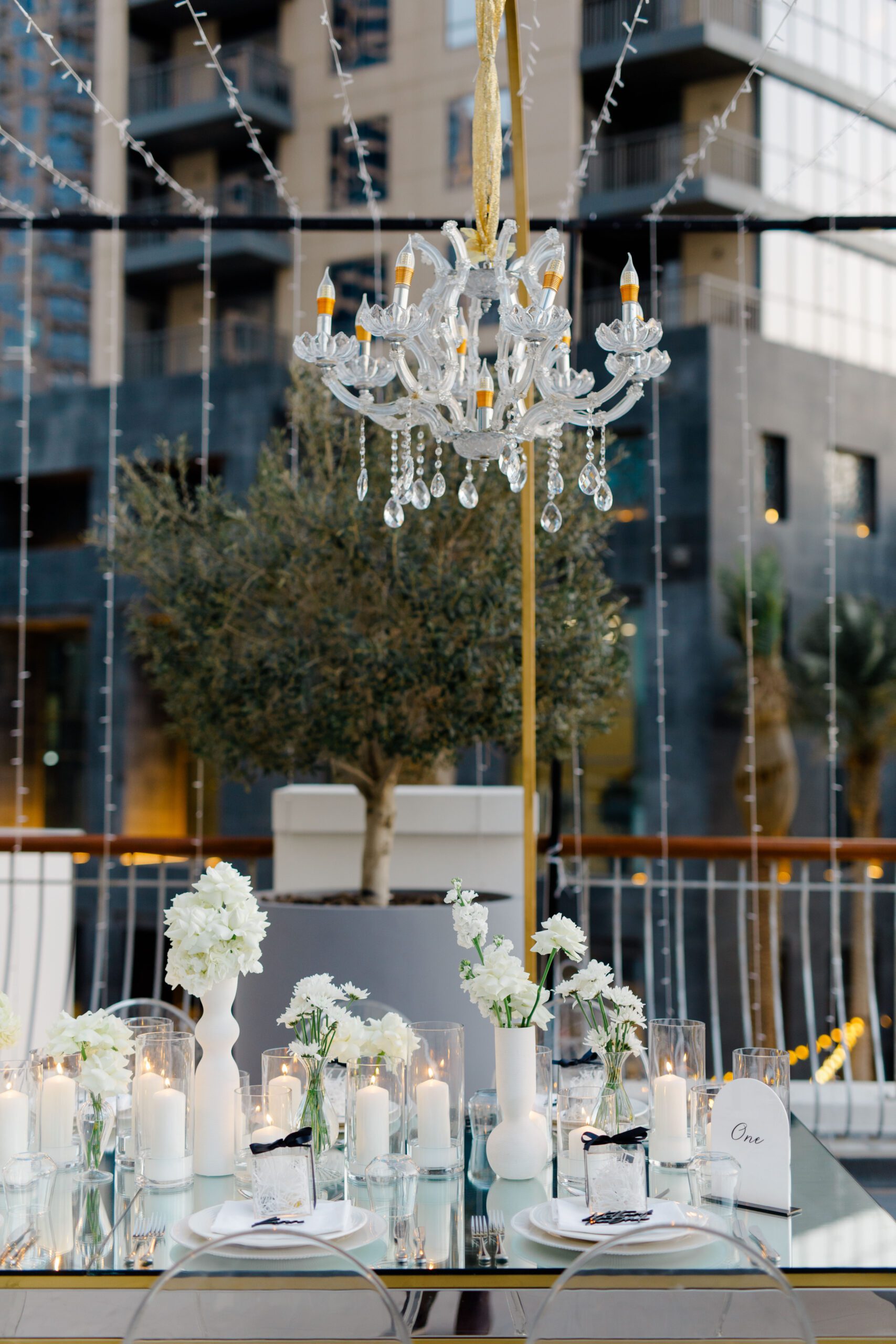 On the terrace of Vida Creek Hotel, overlooking the Dubai skyline, this destination wedding brought sleek sophistication to life. With mirror tables, crystal chandeliers, and all-white florals accented by touches of black, the design was minimal yet striking. The sunset ceremony seamlessly transformed into a chic evening reception, as the couple celebrated their love with an unforgettable view - having journeyed all the way from the UK to say 'I do' in Dubai with their friends and family.
