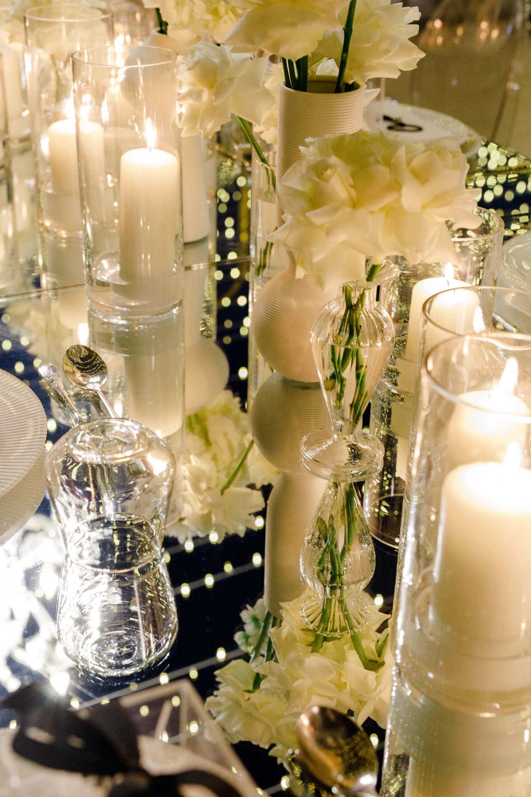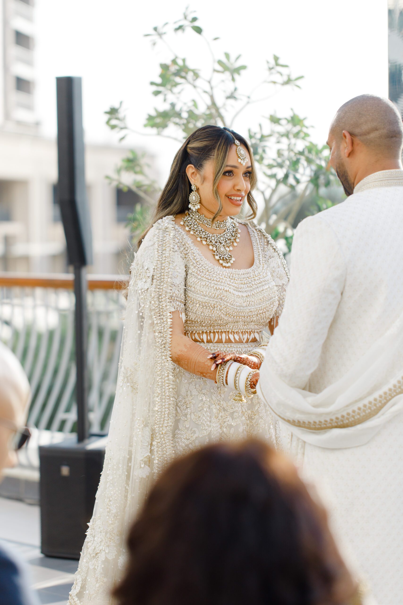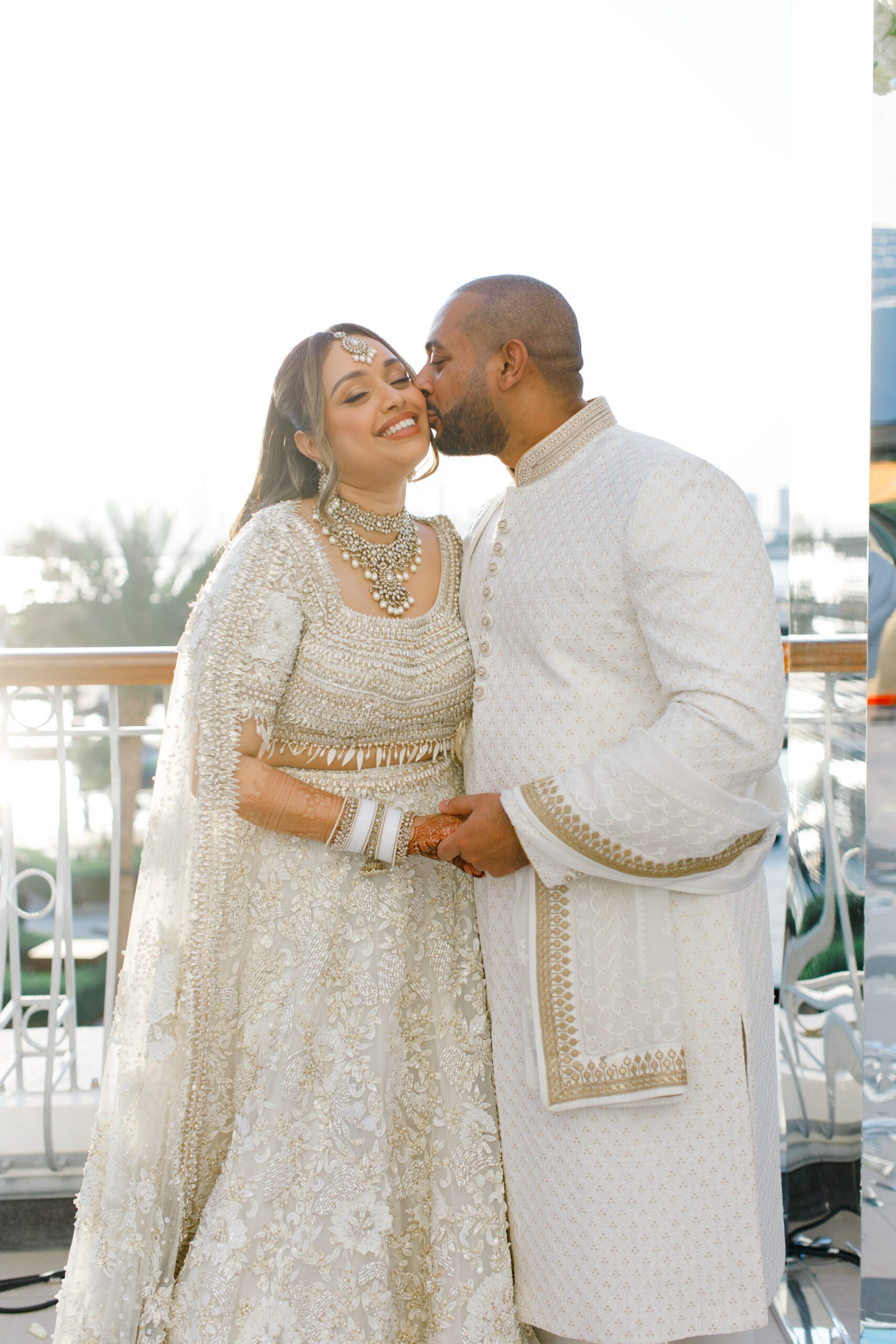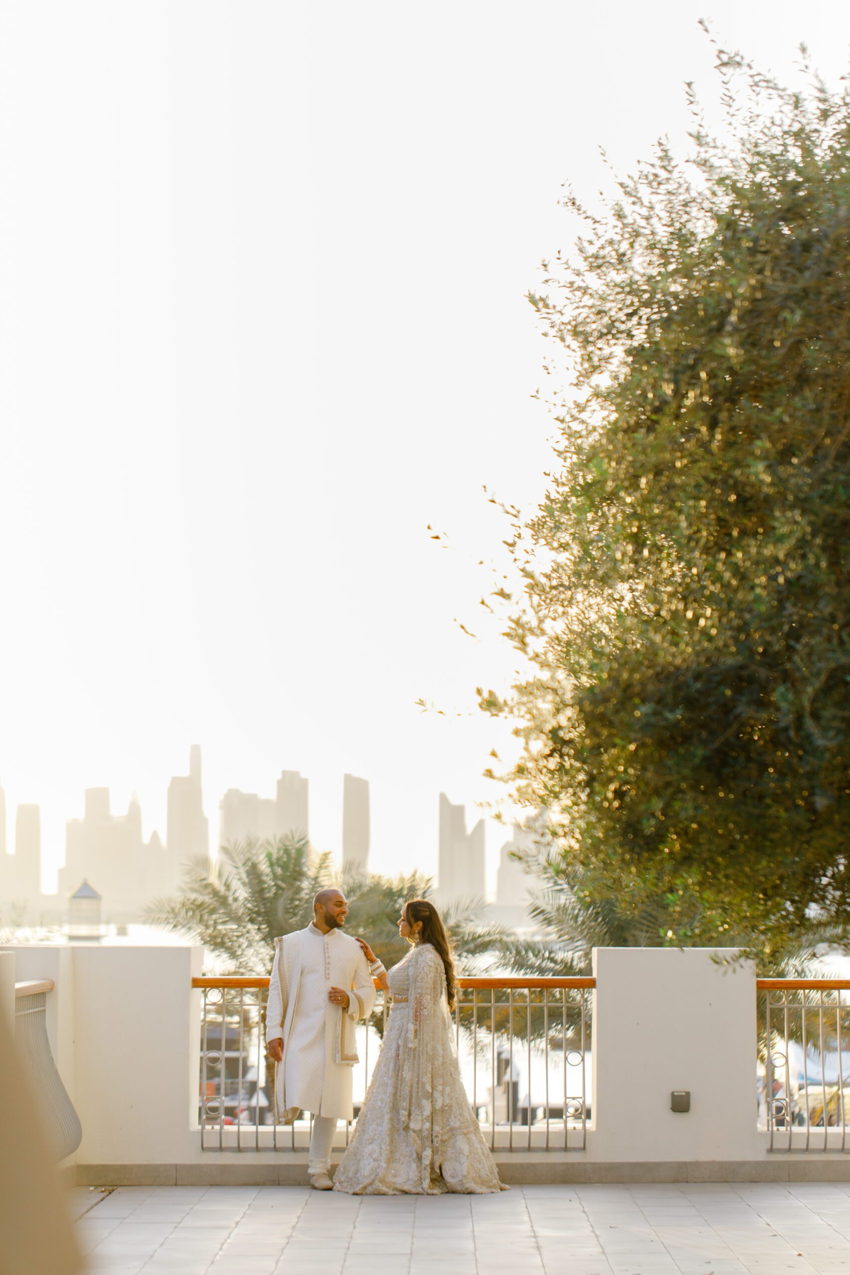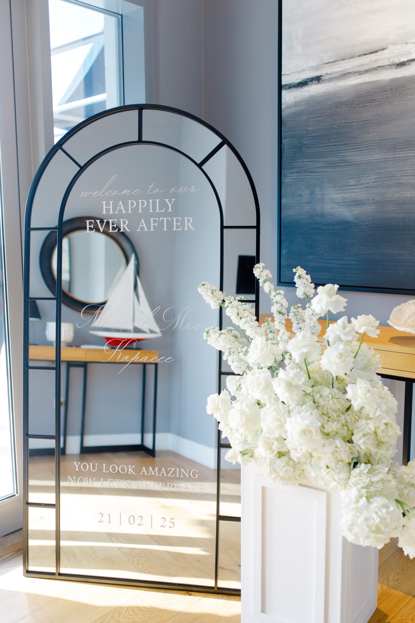 On the terrace of Vida Creek Hotel, overlooking the Dubai skyline, this destination wedding brought sleek sophistication to life. With mirror tables, crystal chandeliers, and all-white florals accented by touches of black, the design was minimal yet striking. The sunset ceremony seamlessly transformed into a chic evening reception, as the couple celebrated their love with an unforgettable view - having journeyed all the way from the UK to say 'I do' in Dubai with their friends and family.