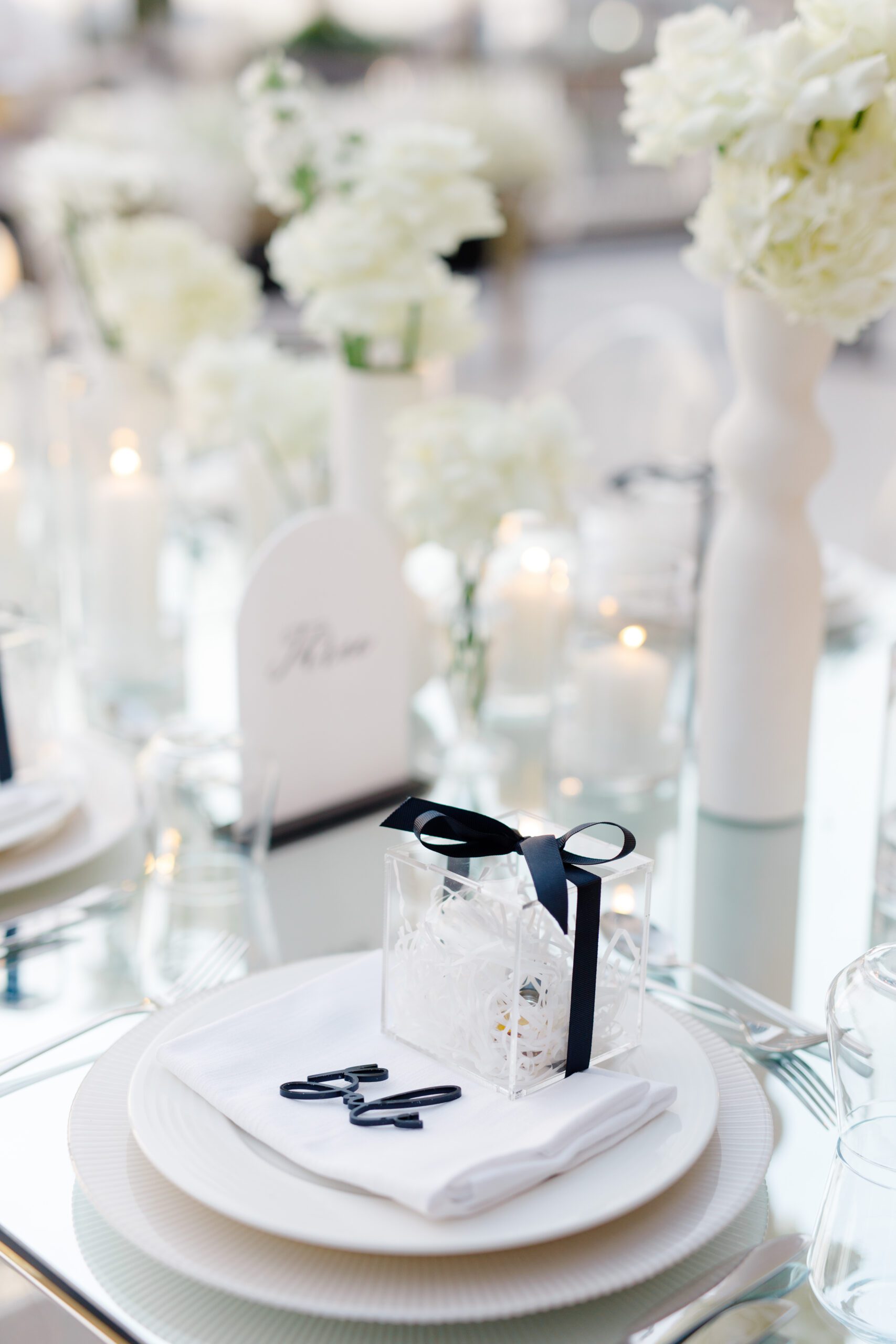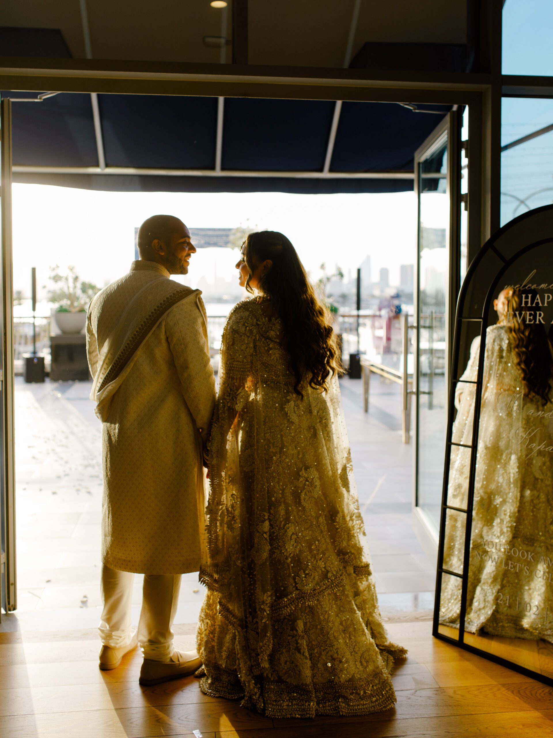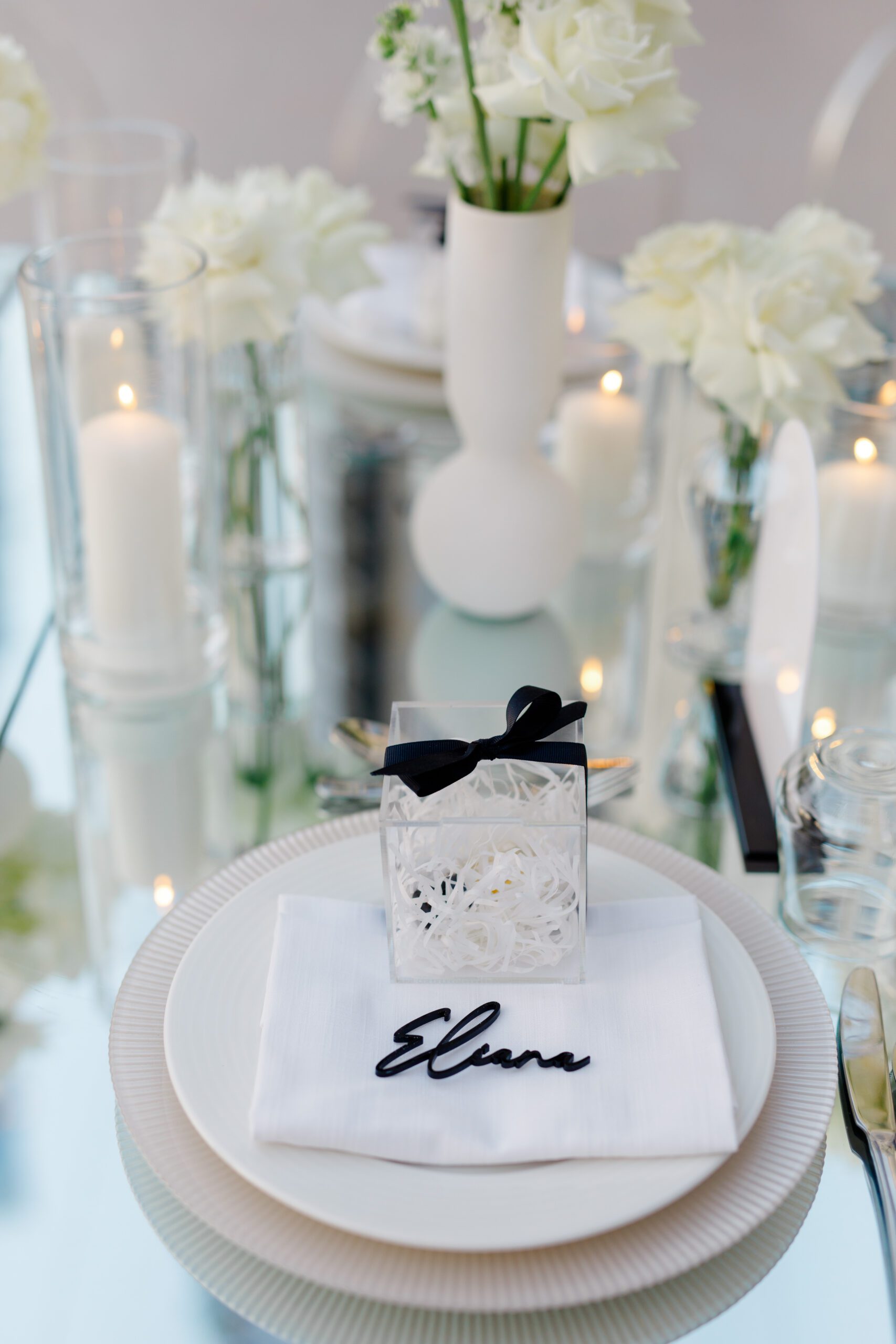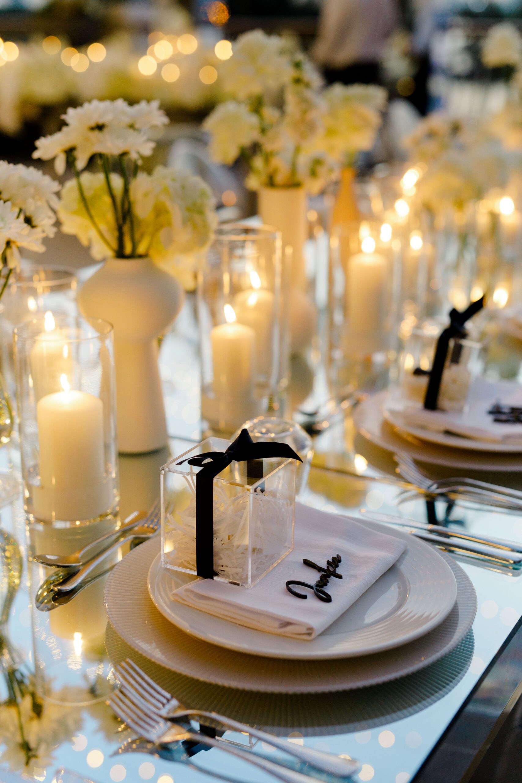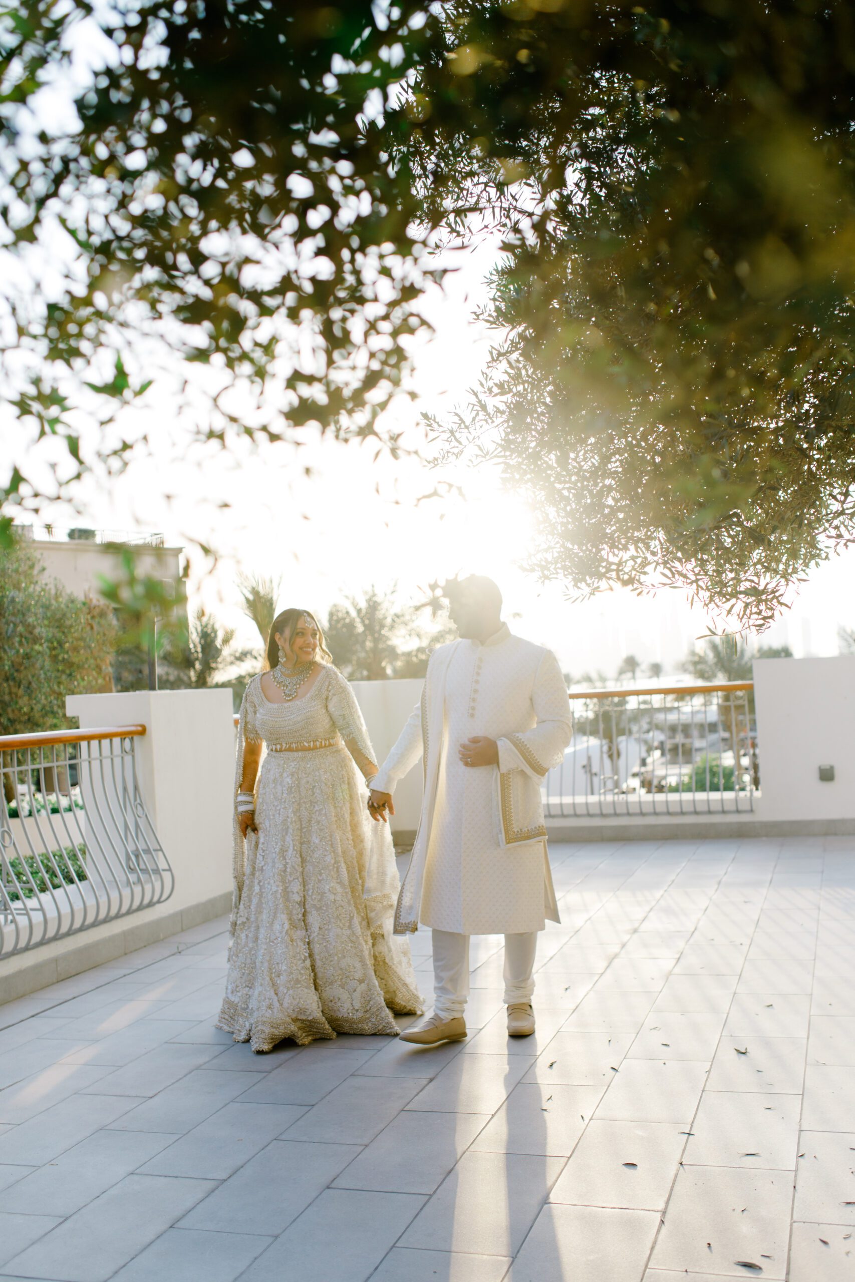 On the terrace of Vida Creek Hotel, overlooking the Dubai skyline, this destination wedding brought sleek sophistication to life. With mirror tables, crystal chandeliers, and all-white florals accented by touches of black, the design was minimal yet striking. The sunset ceremony seamlessly transformed into a chic evening reception, as the couple celebrated their love with an unforgettable view - having journeyed all the way from the UK to say 'I do' in Dubai with their friends and family.
