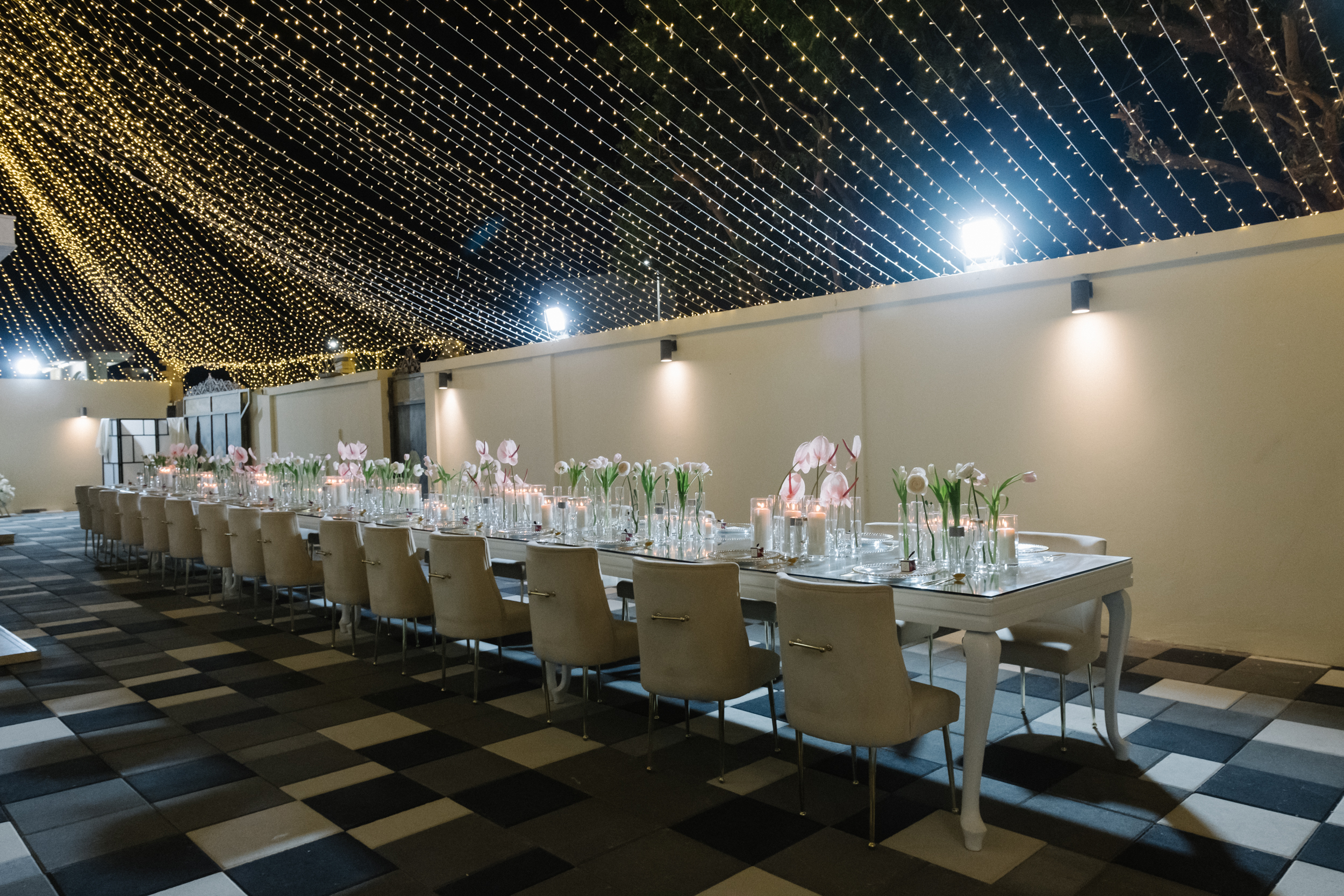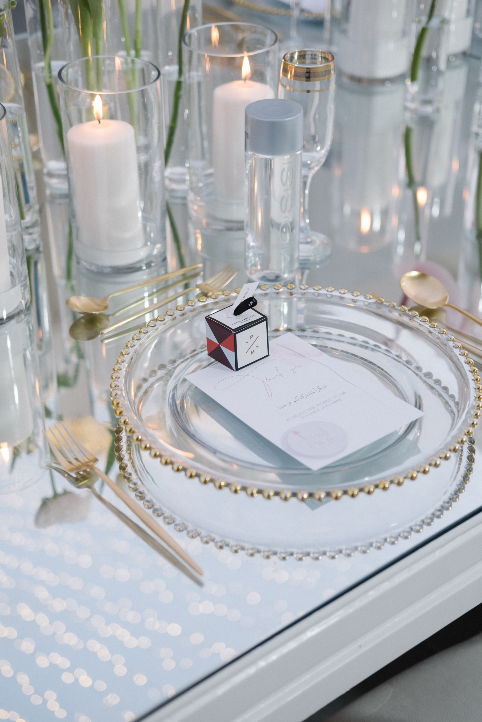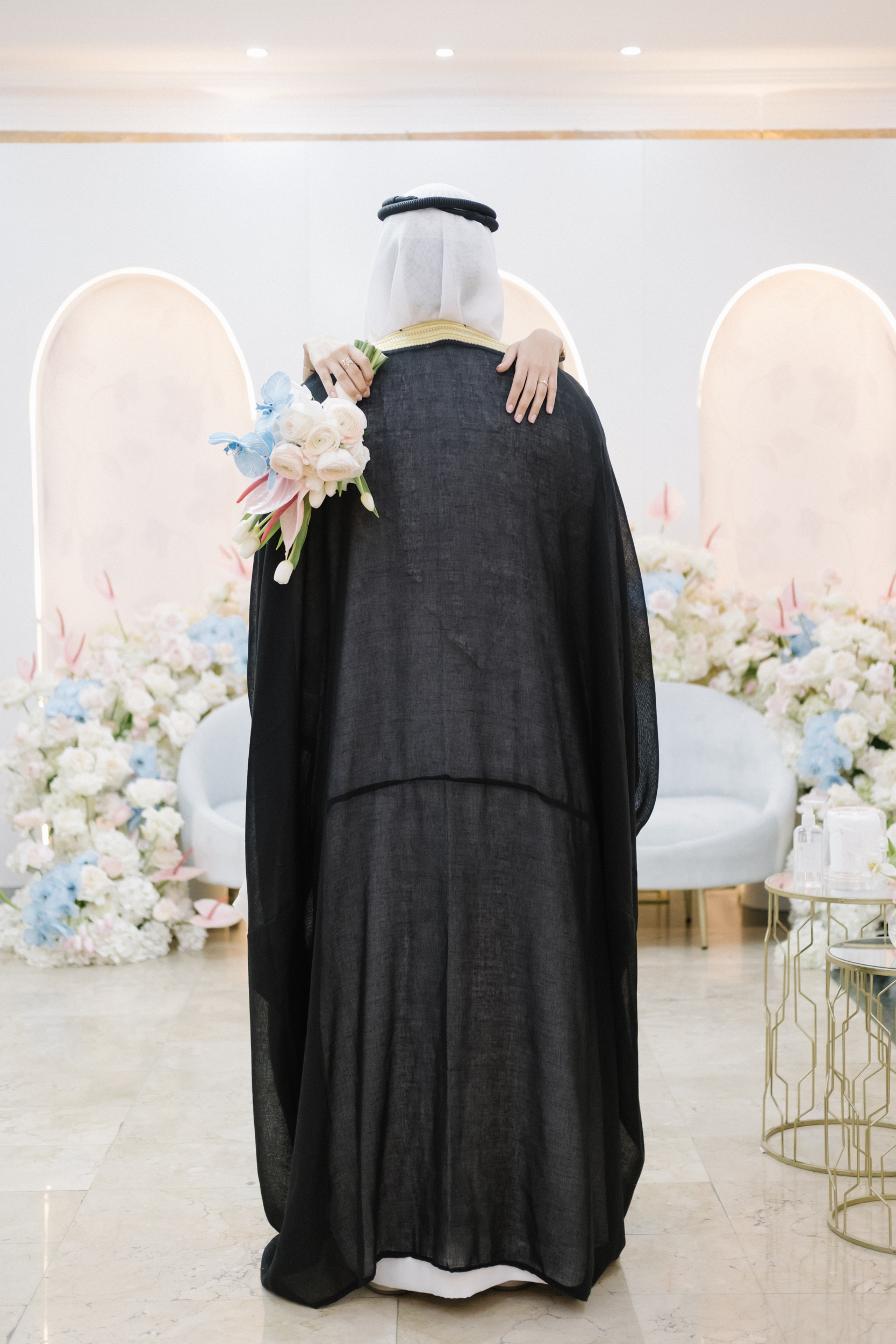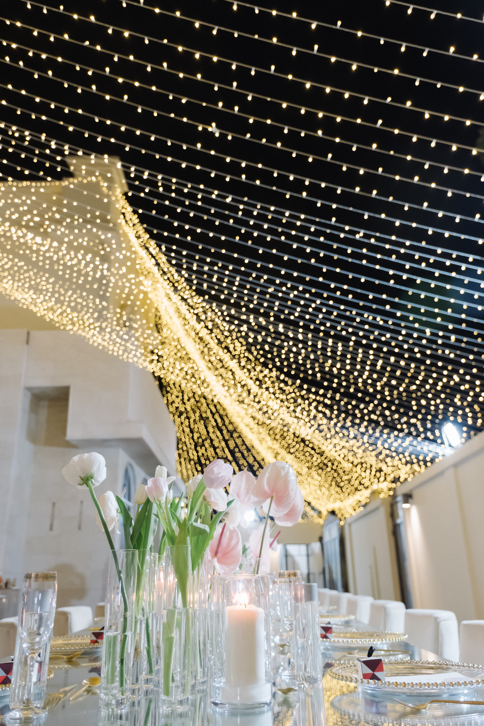Held in the city of Khorfakkan, this Emirati home wedding offered a magical garden celebration beneath a canopy of fairy lights. Mirror tables and minimalist glass arrangements with single-stem florals created a refined, contemporary atmosphere—an intimate evening where simplicity met effortless sophistication.