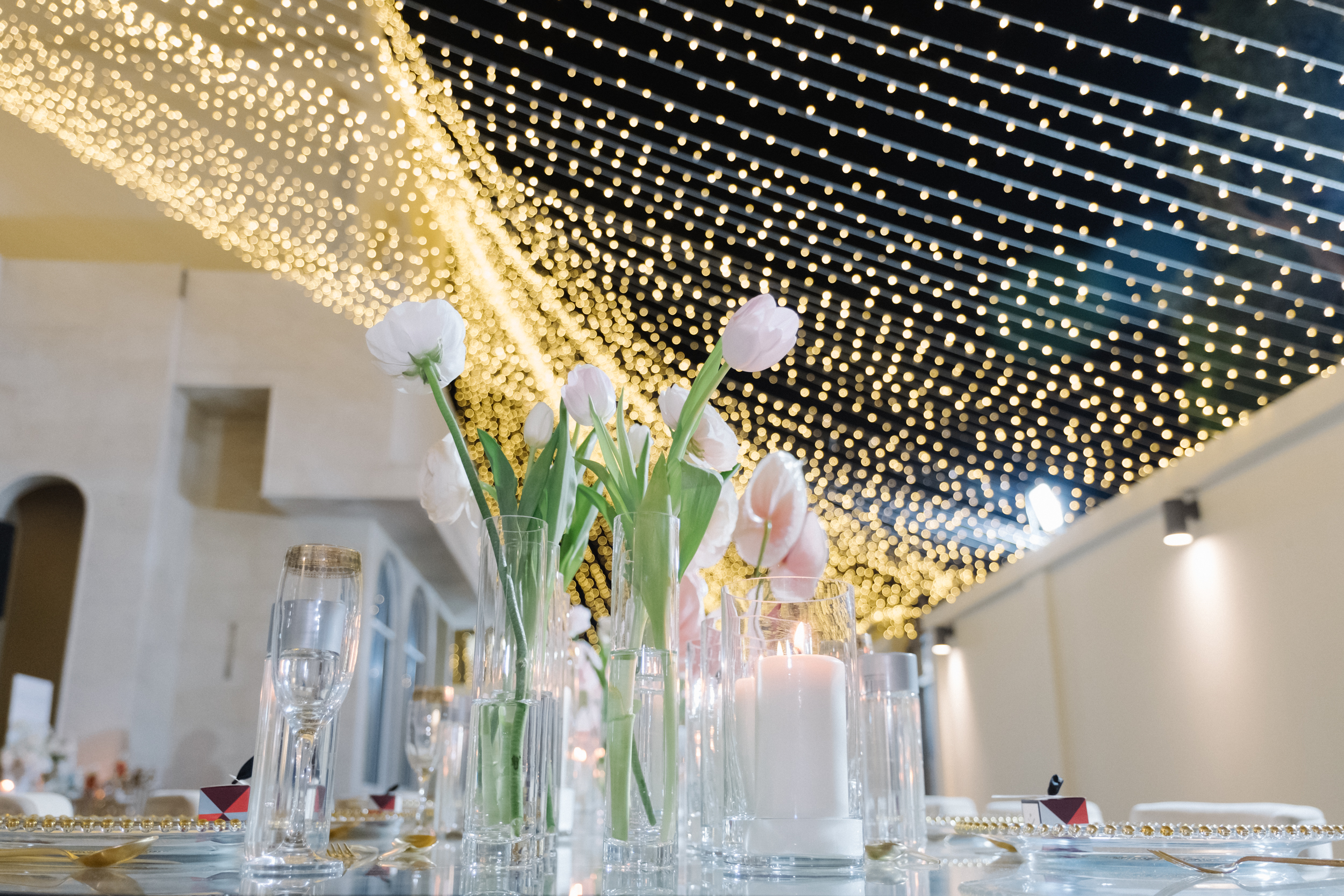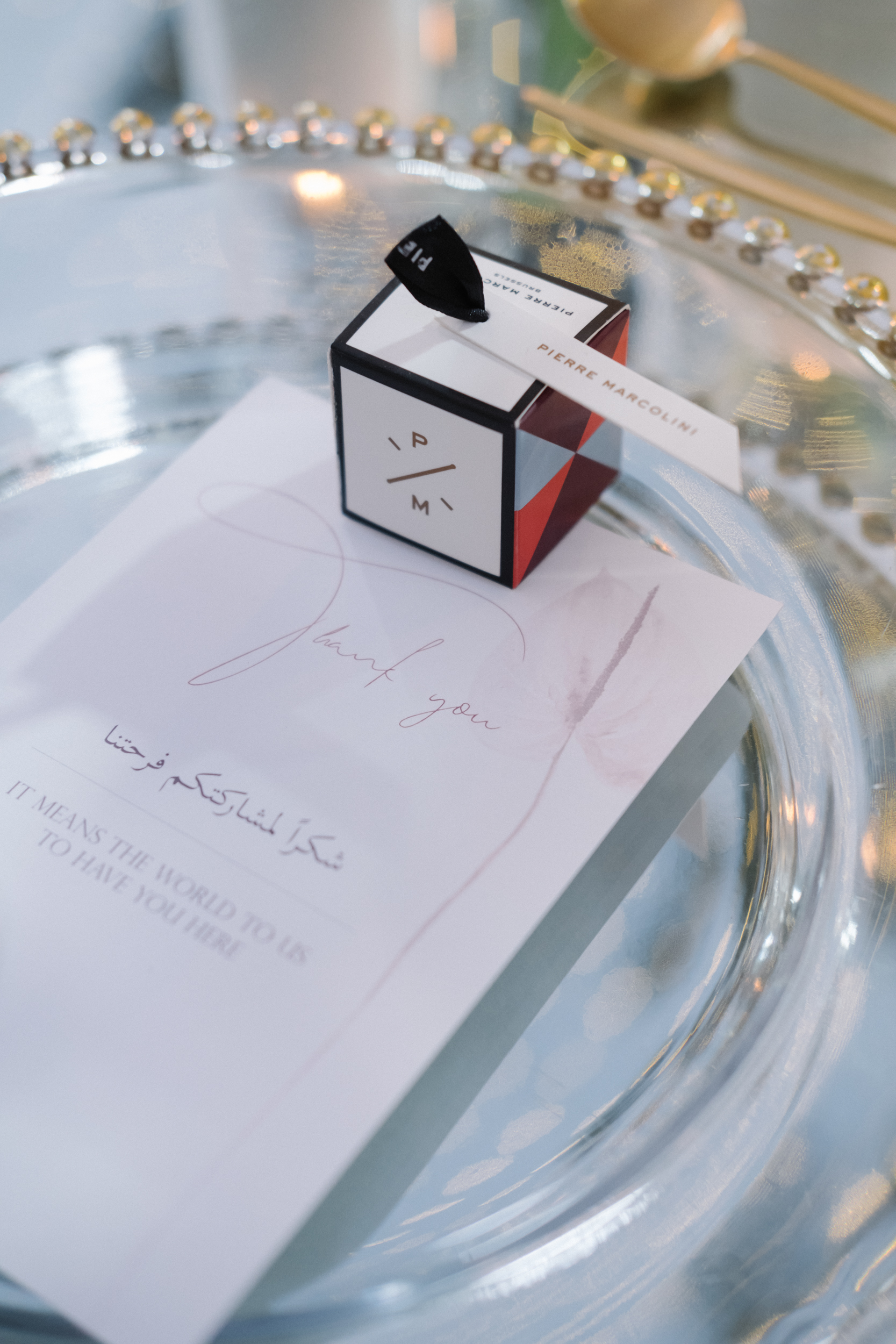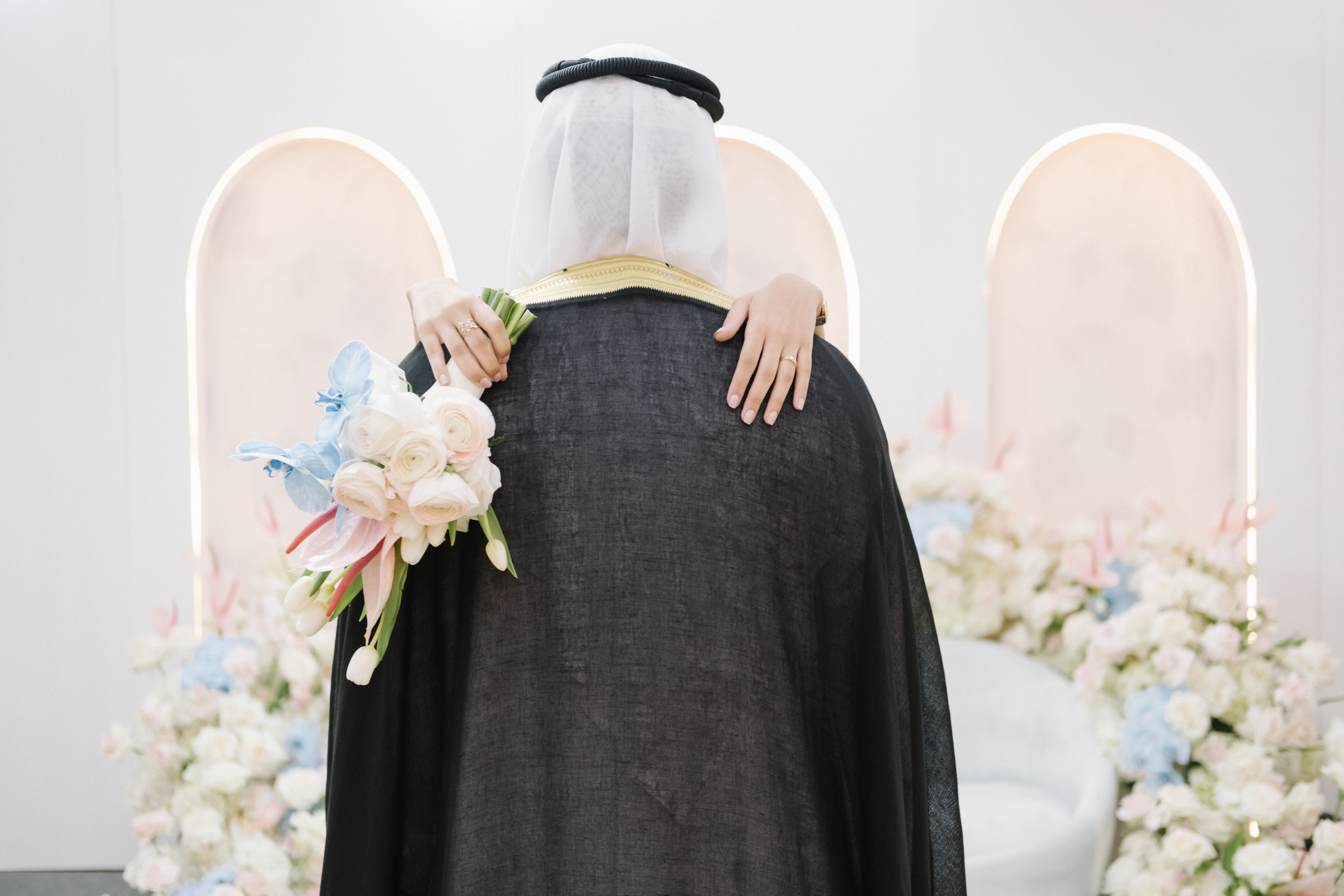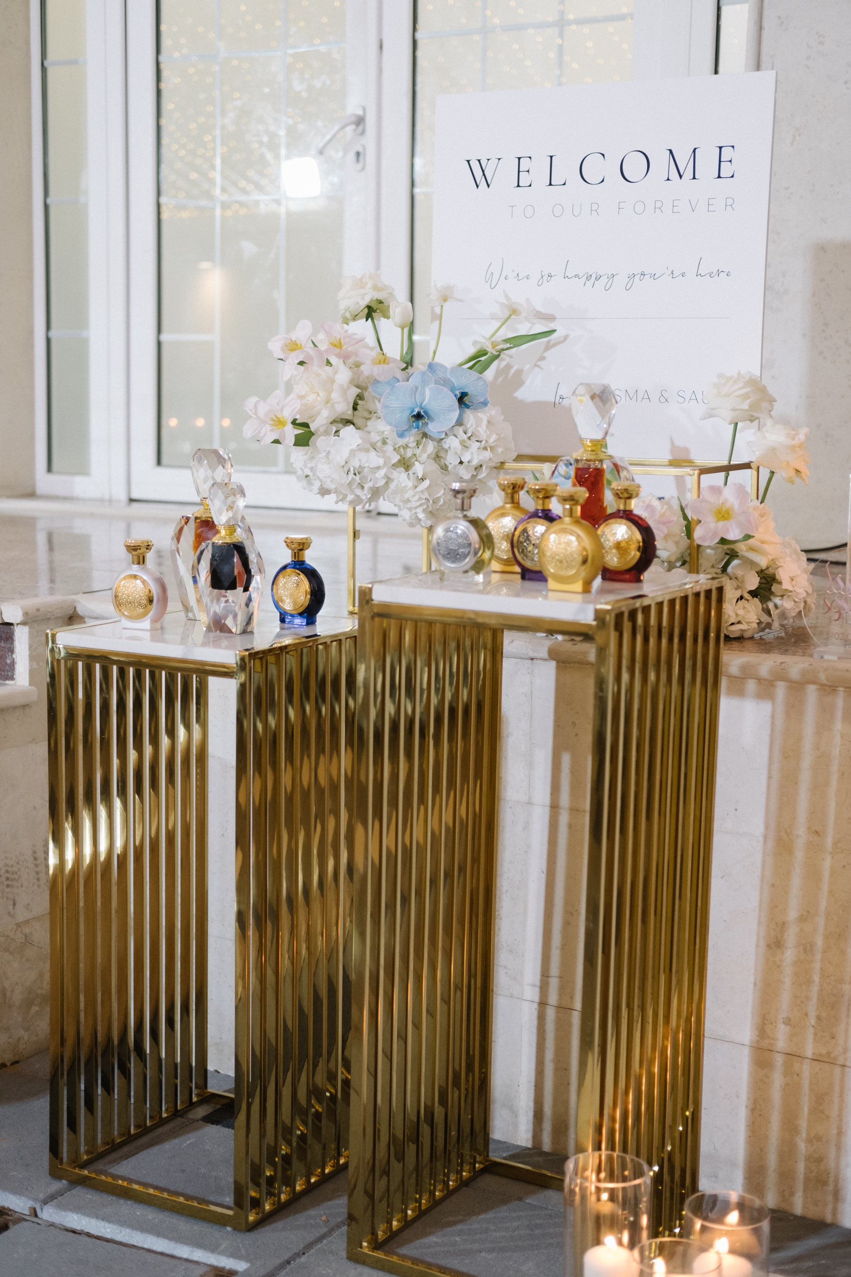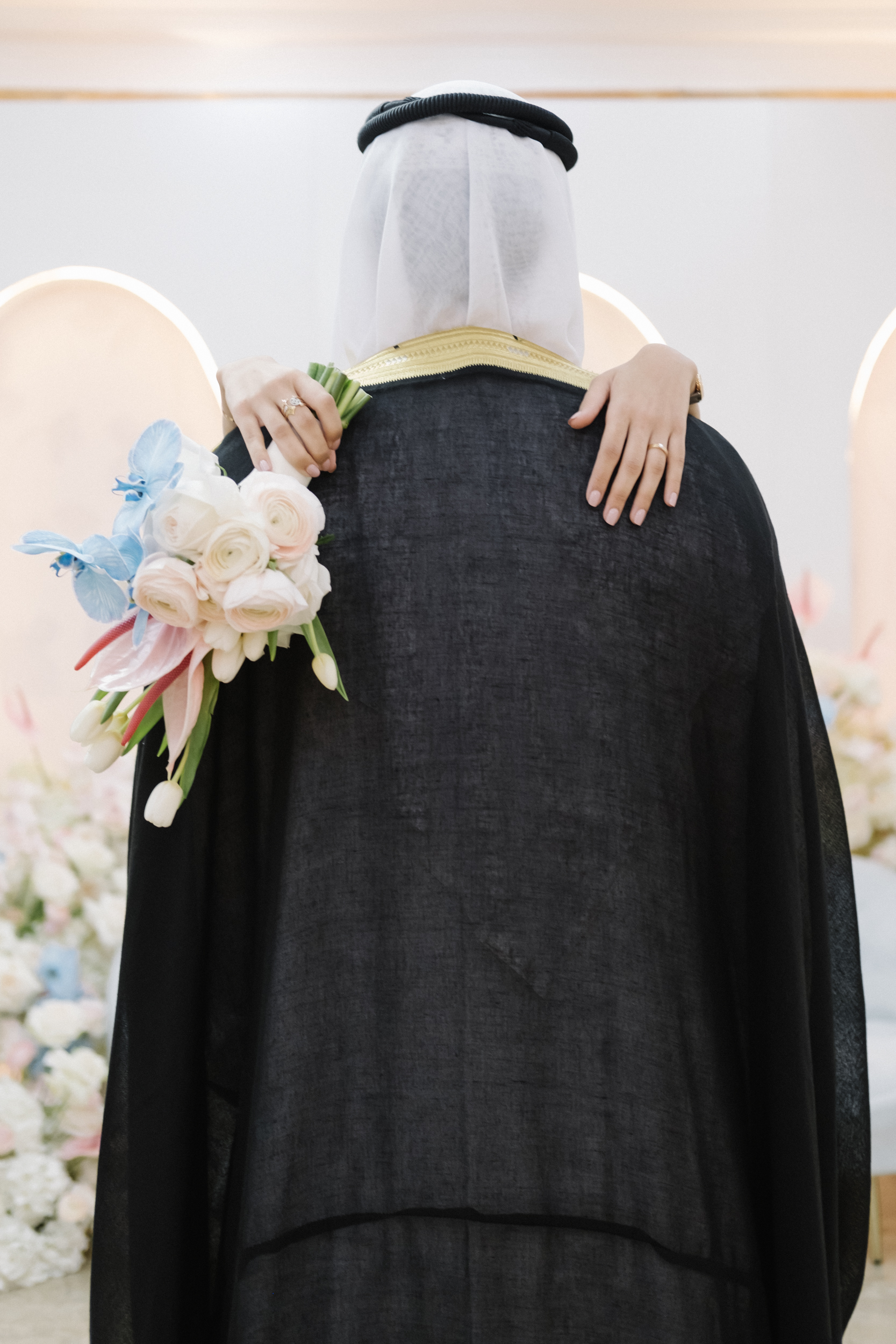 Held in the city of Khorfakkan, this Emirati home wedding offered a magical garden celebration beneath a canopy of fairy lights. Mirror tables and minimalist glass arrangements with single-stem florals created a refined, contemporary atmosphere—an intimate evening where simplicity met effortless sophistication.