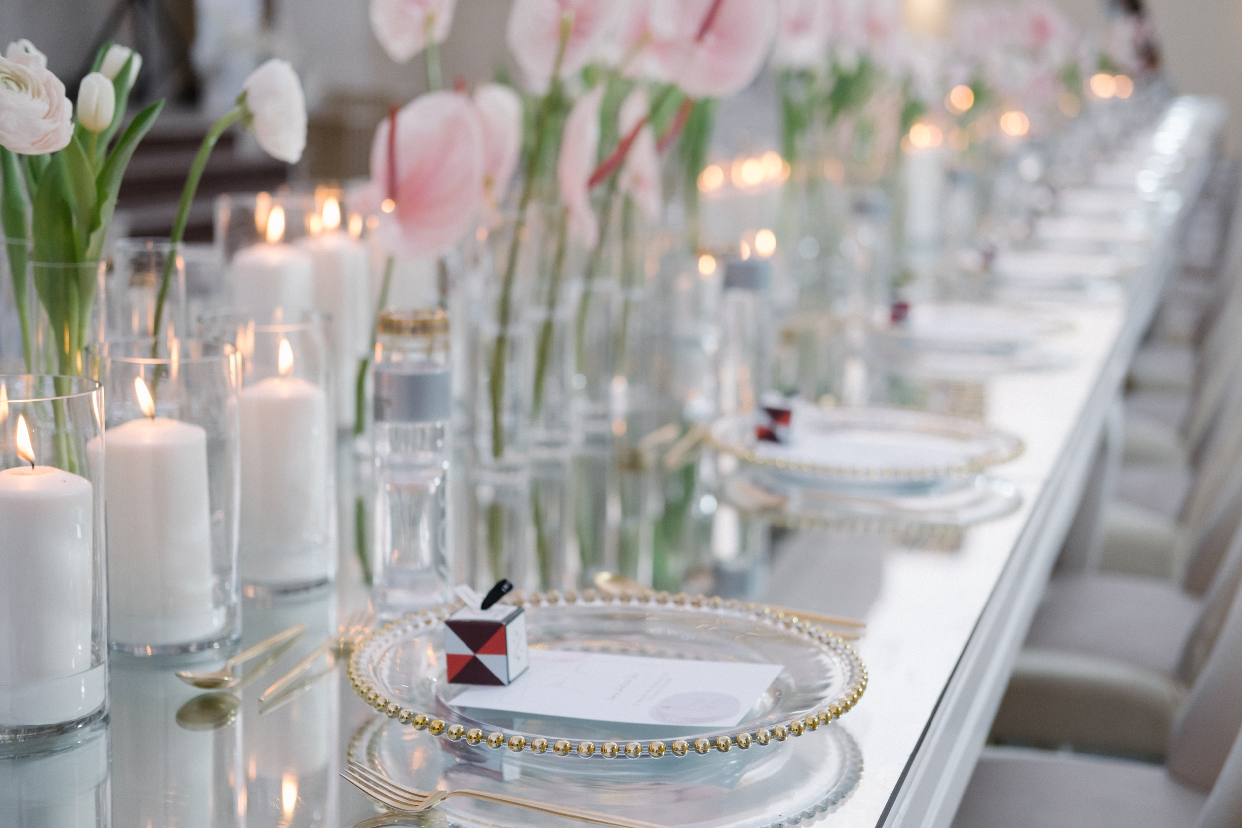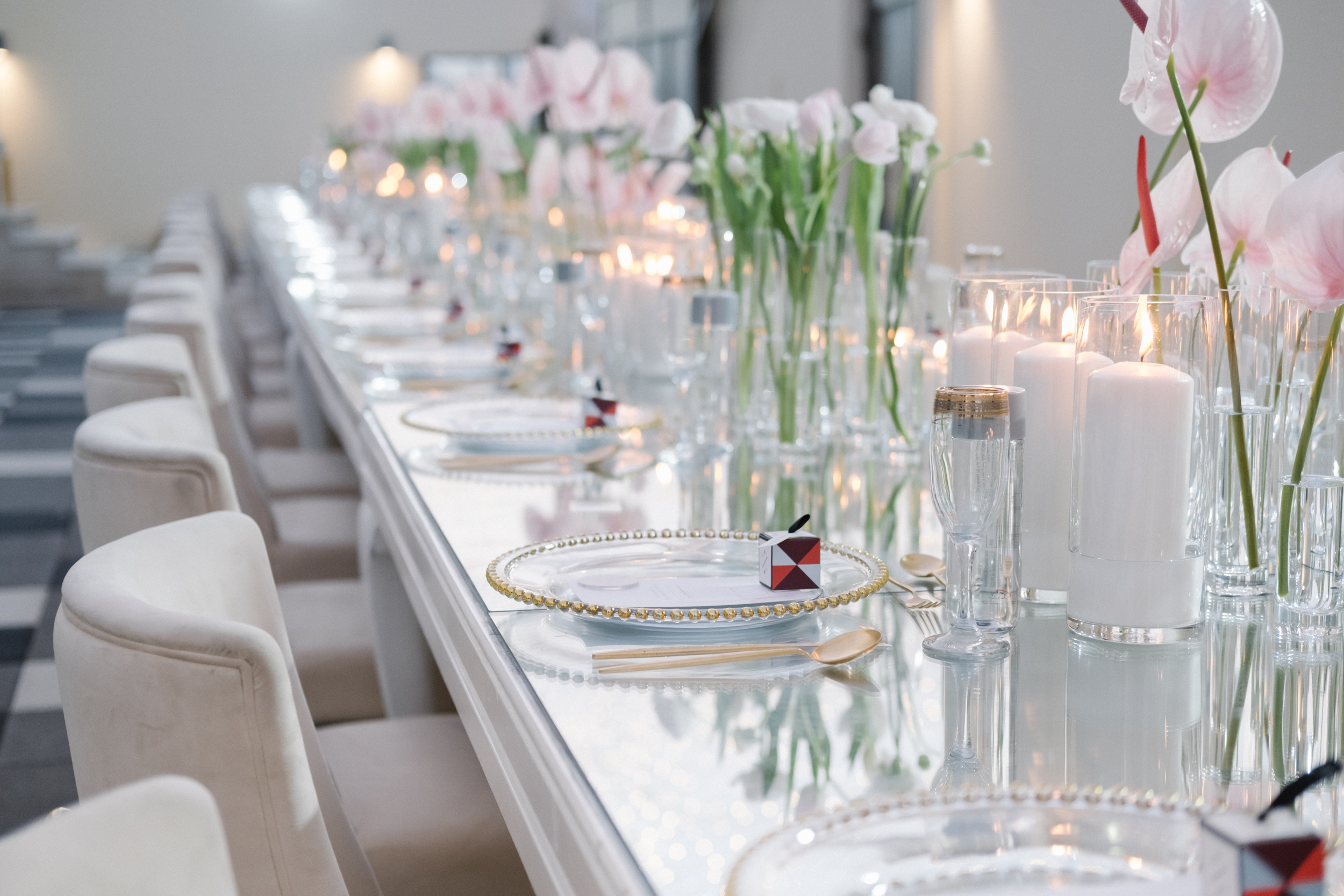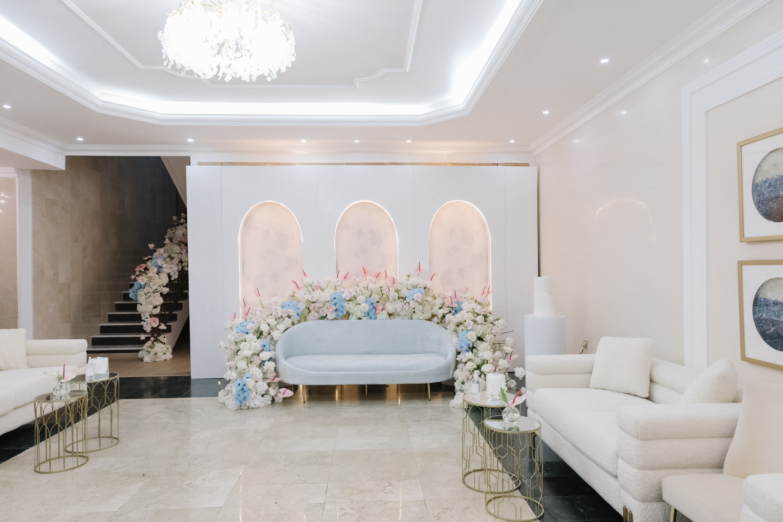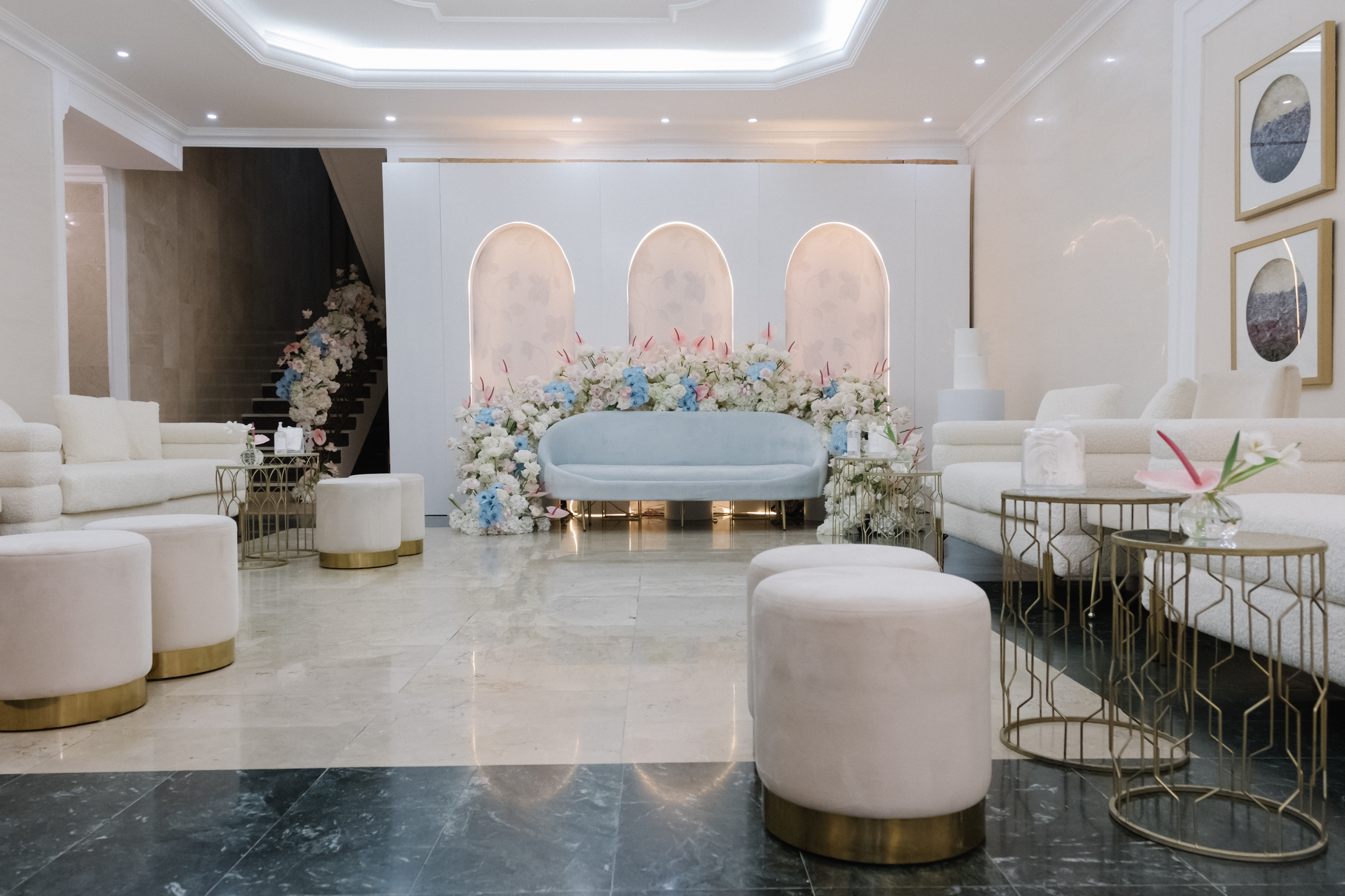 Held in the city of Khorfakkan, this Emirati home wedding offered a magical garden celebration beneath a canopy of fairy lights. Mirror tables and minimalist glass arrangements with single-stem florals created a refined, contemporary atmosphere—an intimate evening where simplicity met effortless sophistication.