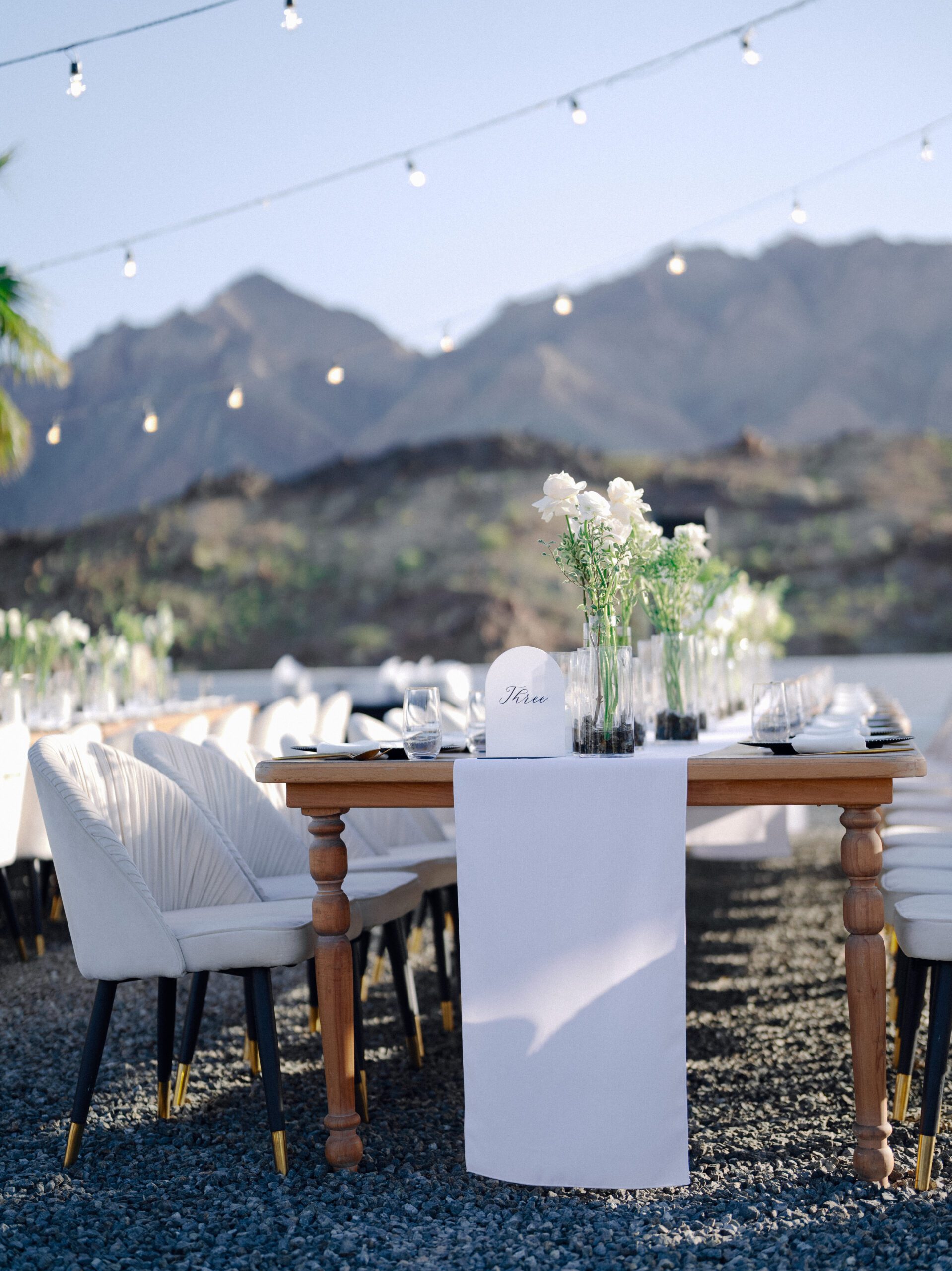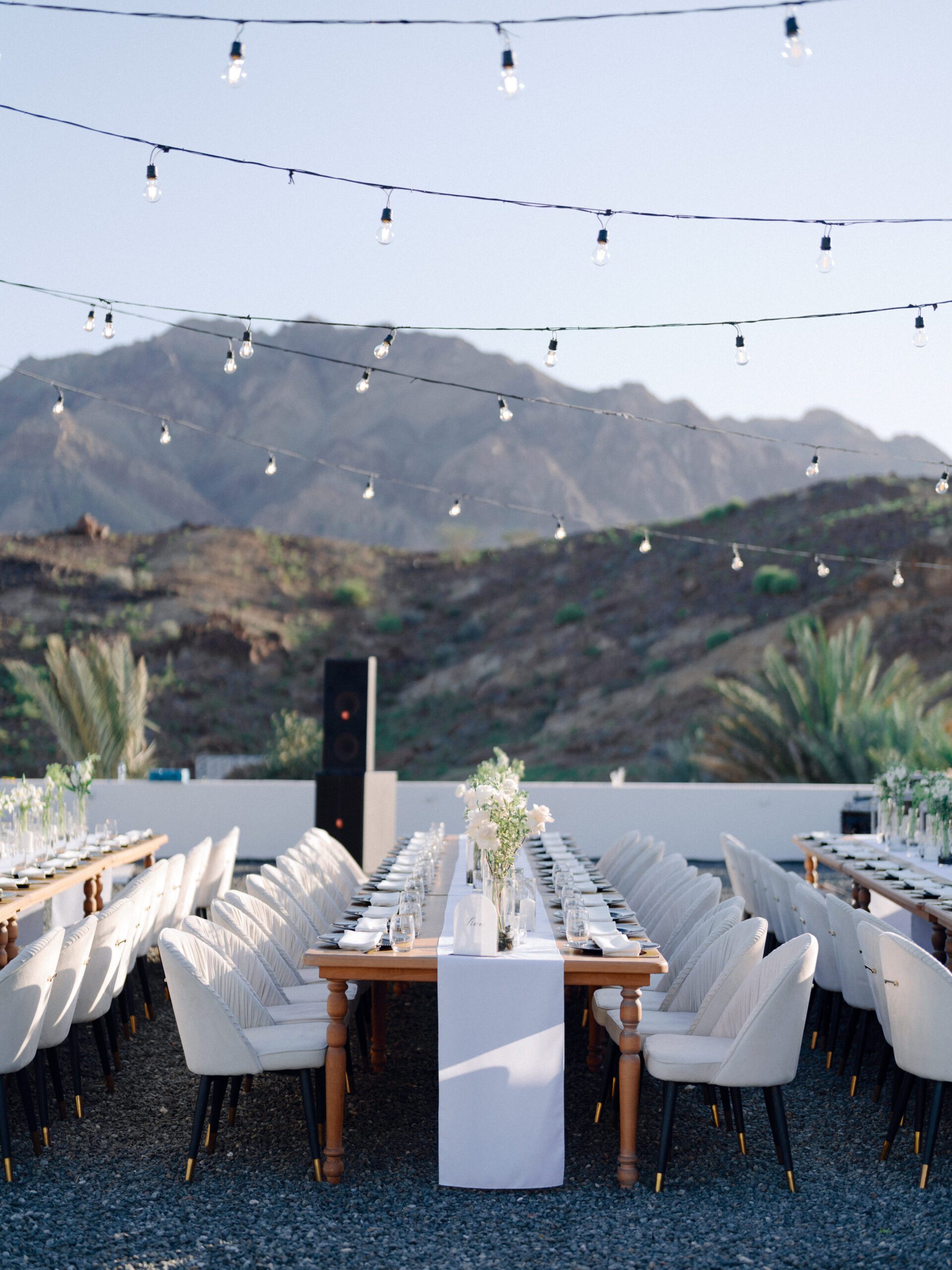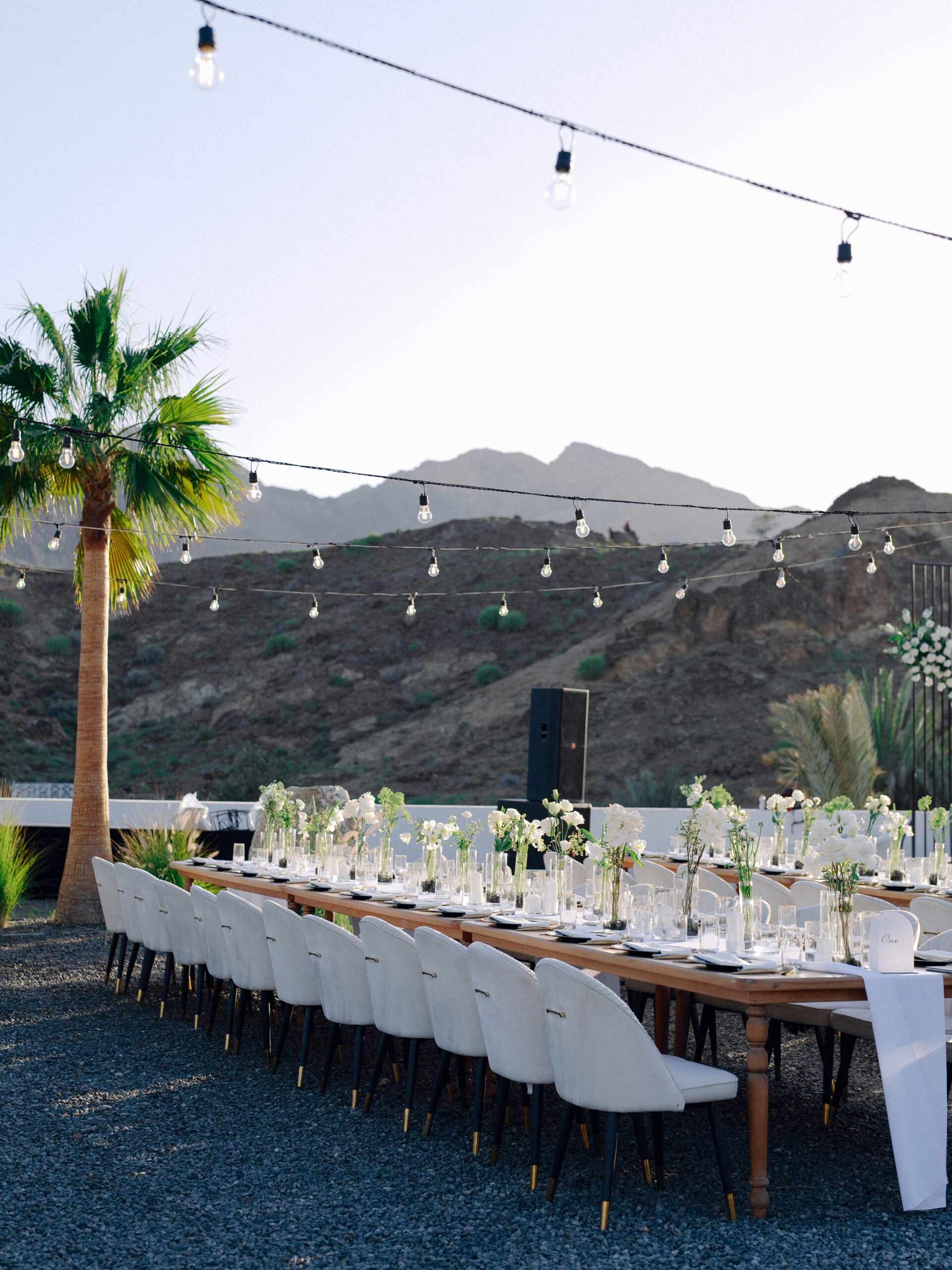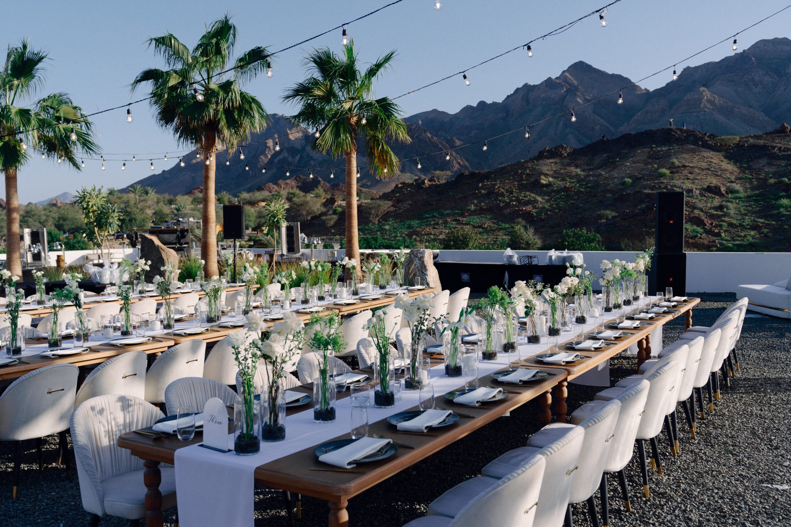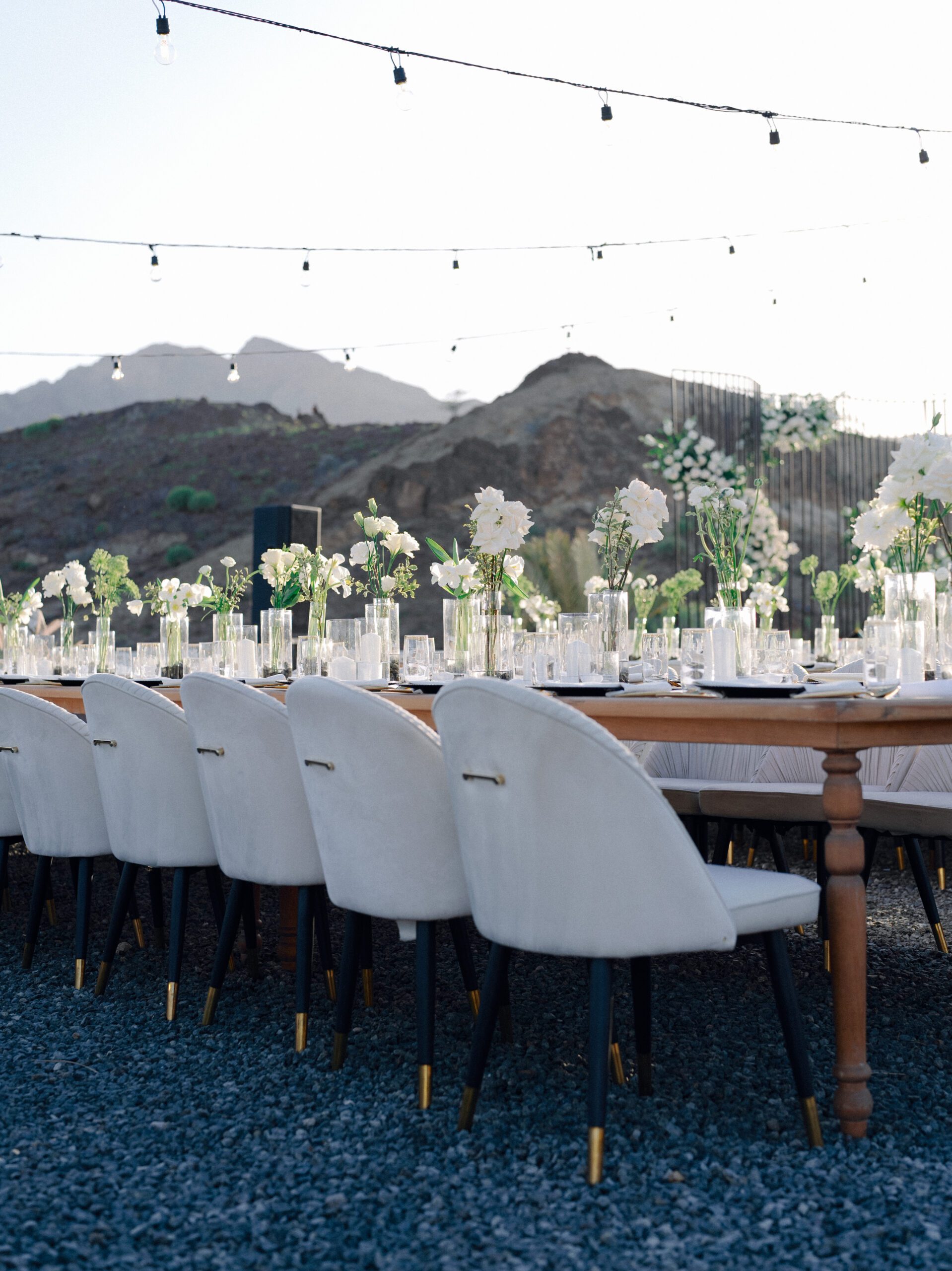 A stunning outdoor celebration set against the majestic mountains of Hatta Haven, where a rugged, rocky terrain was transformed into an elegant and serene luxury venue. The simple yet classic white décor, accented with touches of black for contrast and a minimalistic feel, beautifully complemented the natural landscape, creating a harmonious and unforgettable atmosphere.
