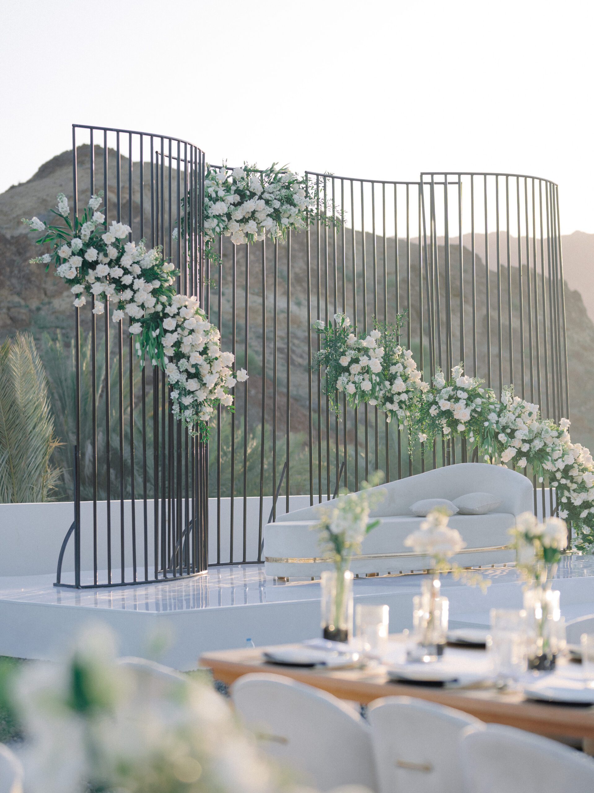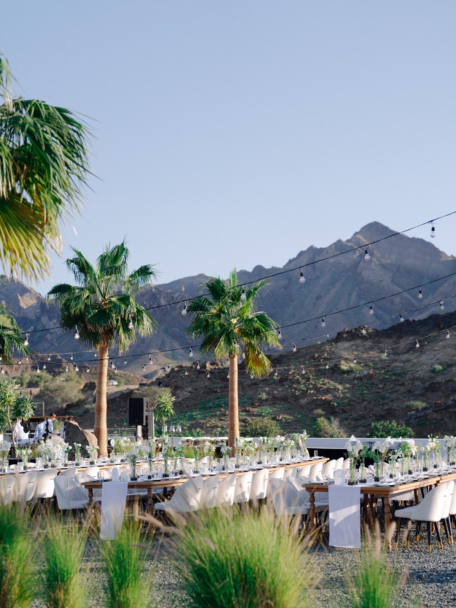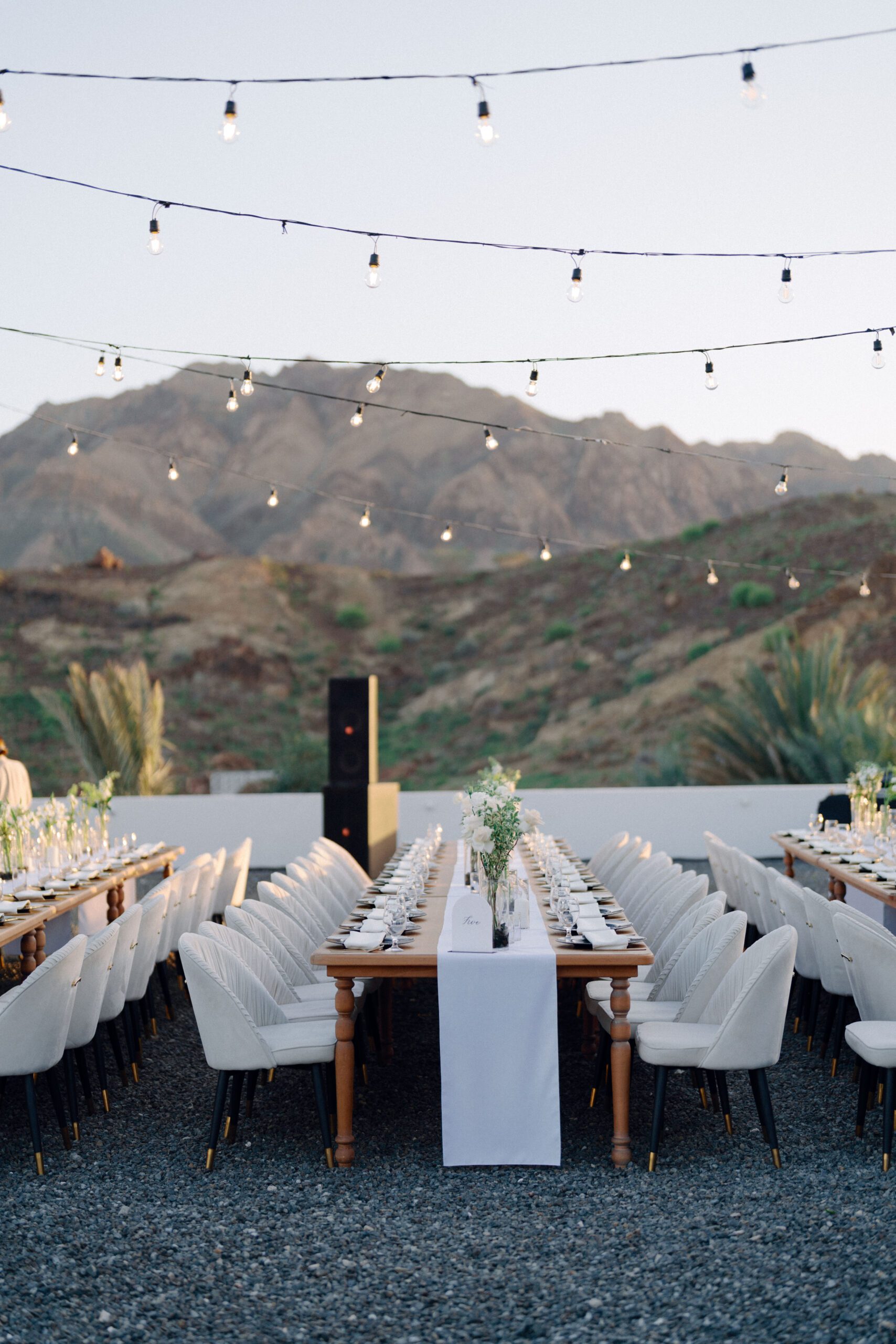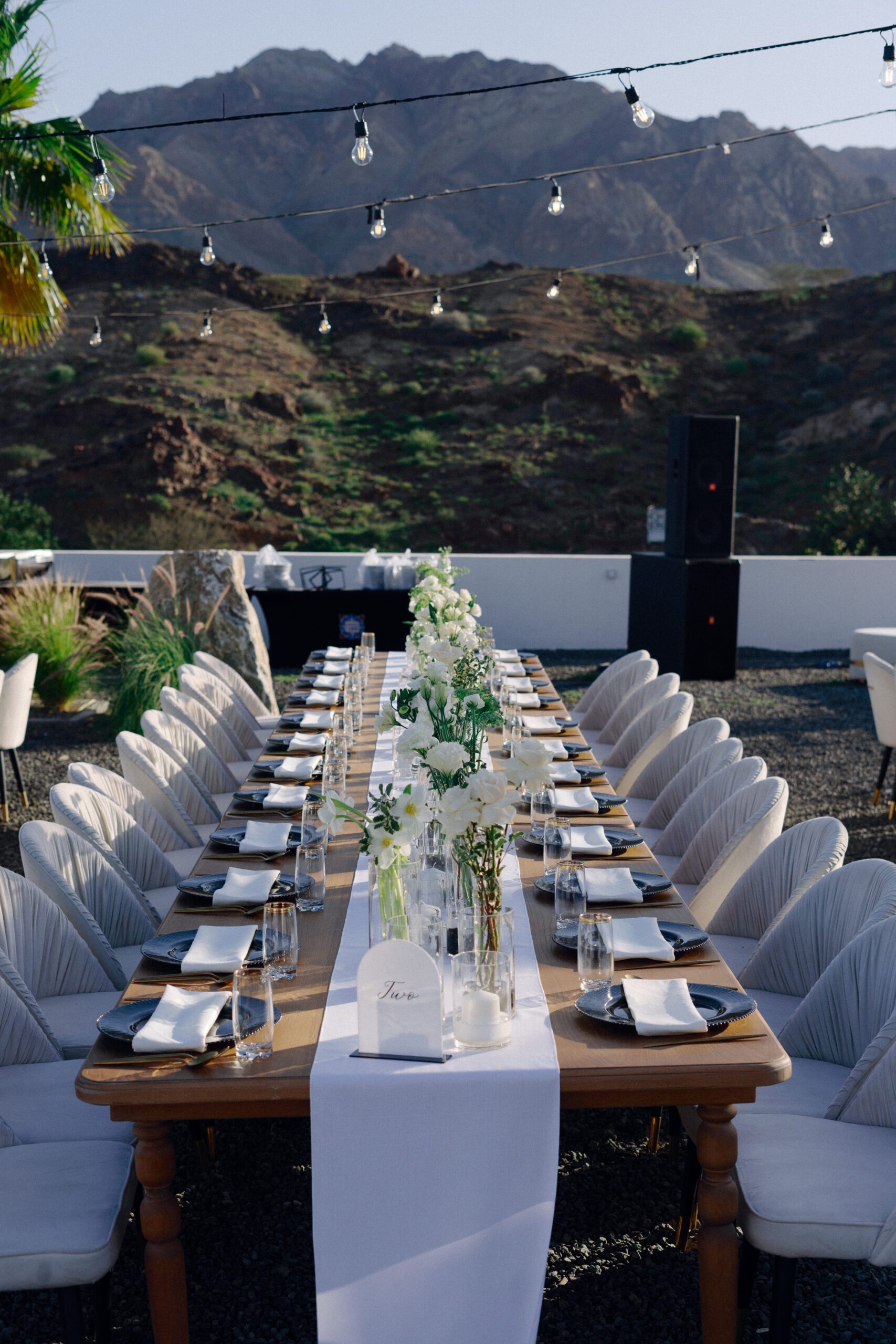 A stunning outdoor celebration set against the majestic mountains of Hatta Haven, where a rugged, rocky terrain was transformed into an elegant and serene luxury venue. The simple yet classic white décor, accented with touches of black for contrast and a minimalistic feel, beautifully complemented the natural landscape, creating a harmonious and unforgettable atmosphere.