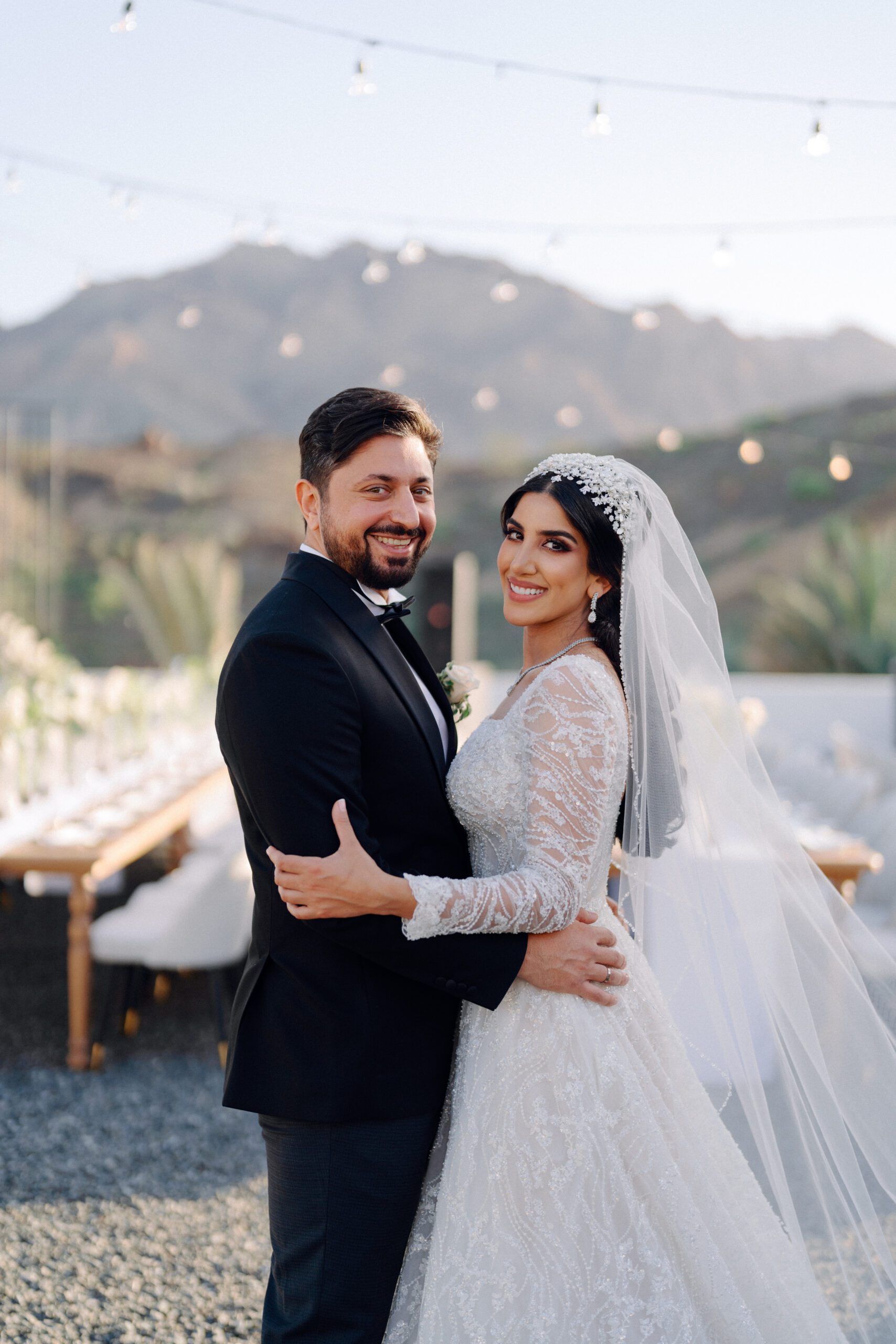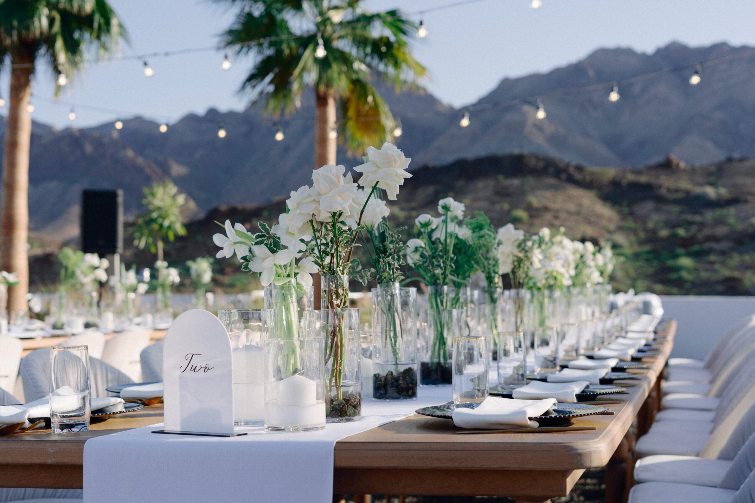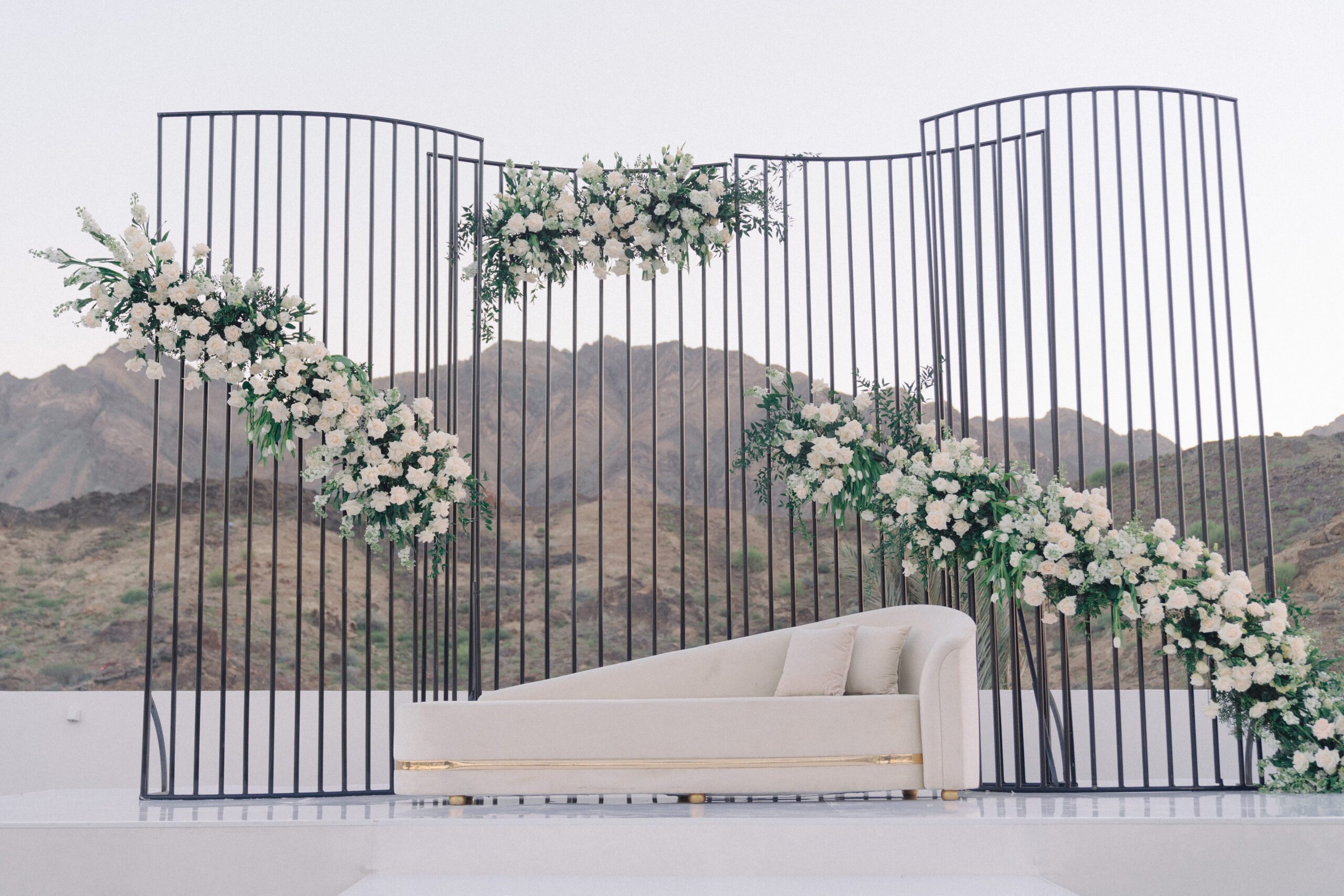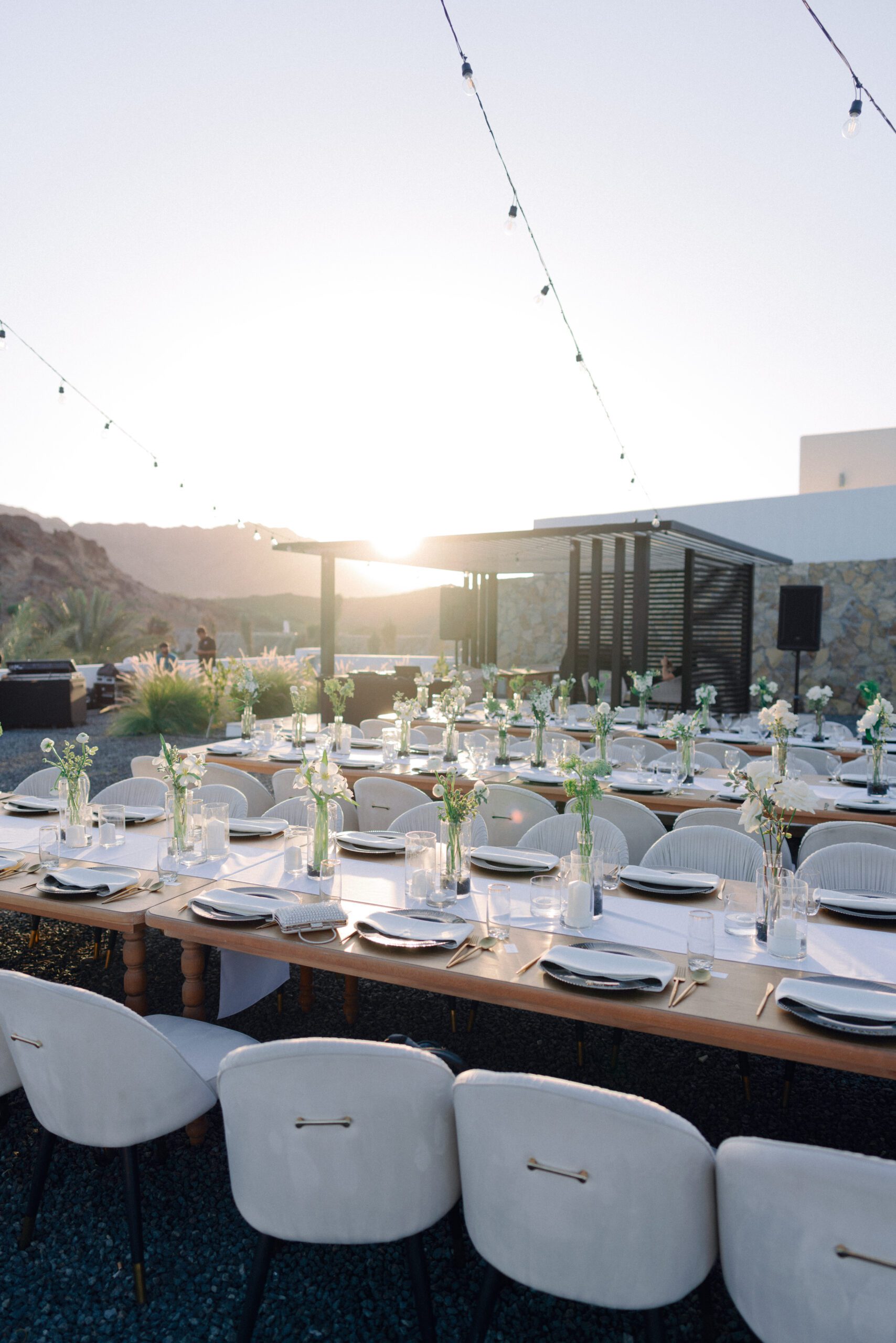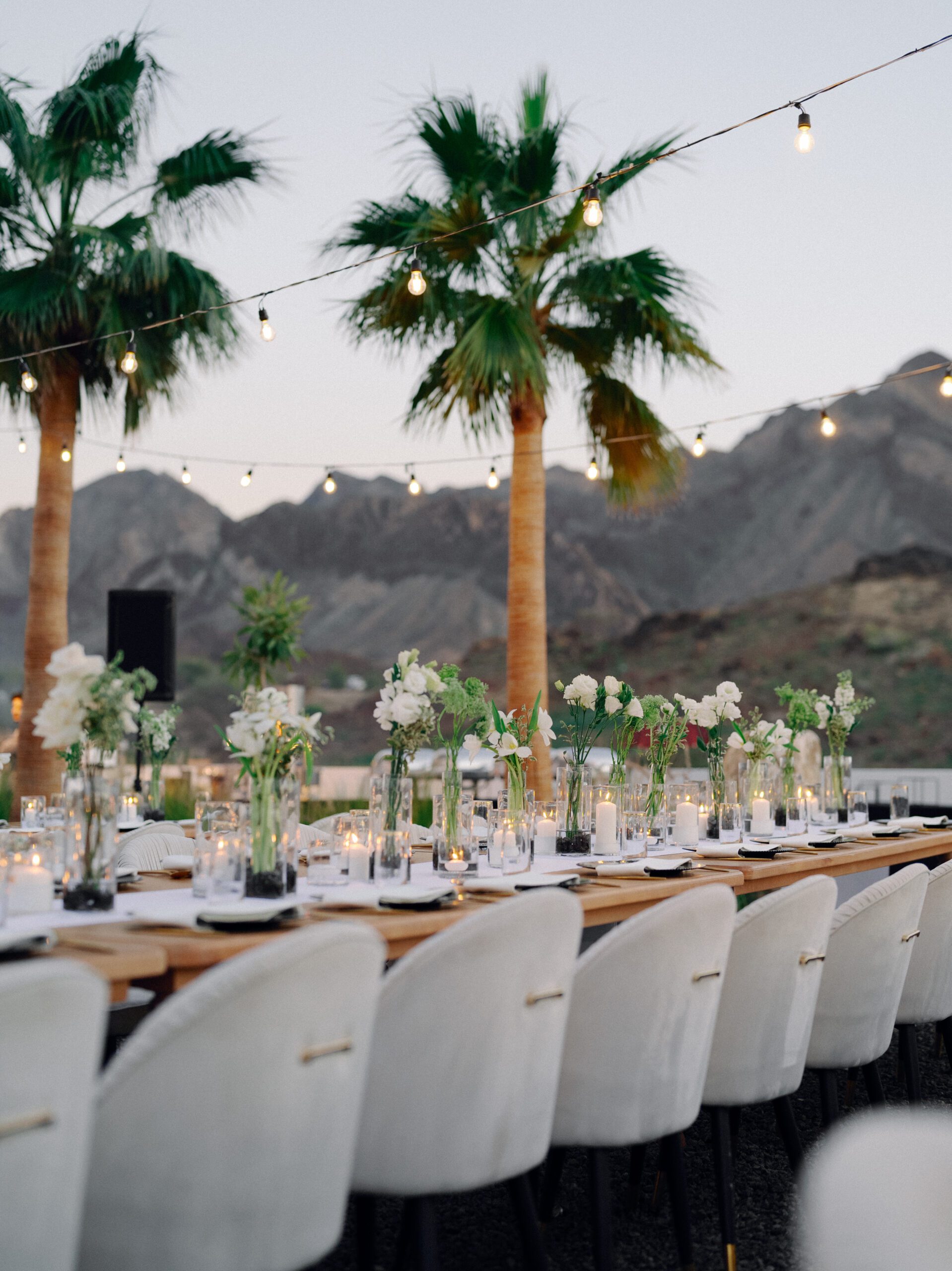 A stunning outdoor celebration set against the majestic mountains of Hatta Haven, where a rugged, rocky terrain was transformed into an elegant and serene luxury venue. The simple yet classic white décor, accented with touches of black for contrast and a minimalistic feel, beautifully complemented the natural landscape, creating a harmonious and unforgettable atmosphere.
