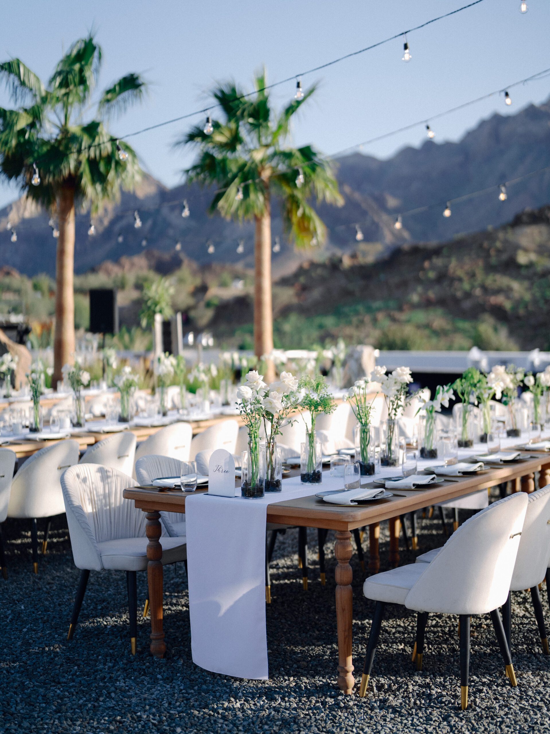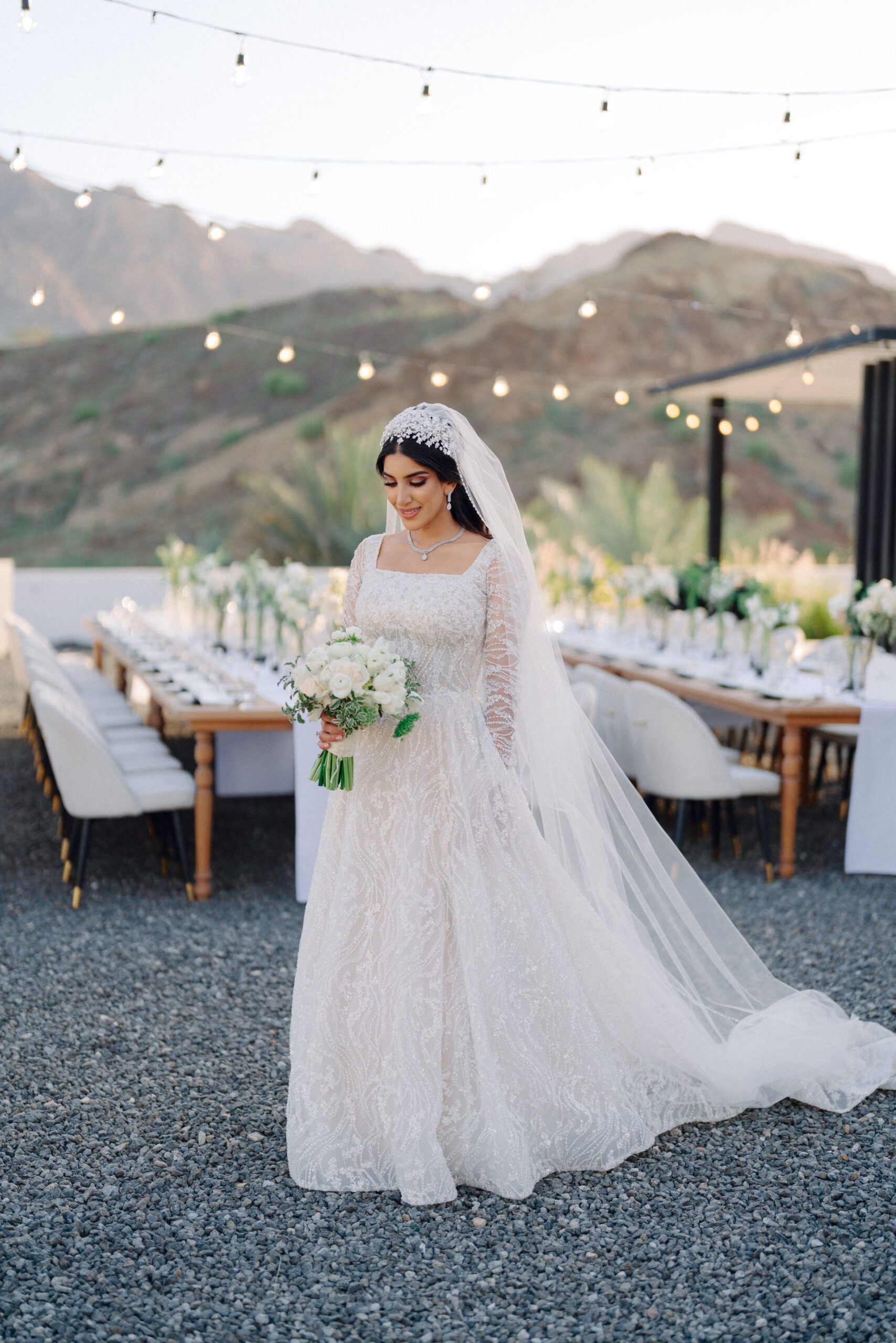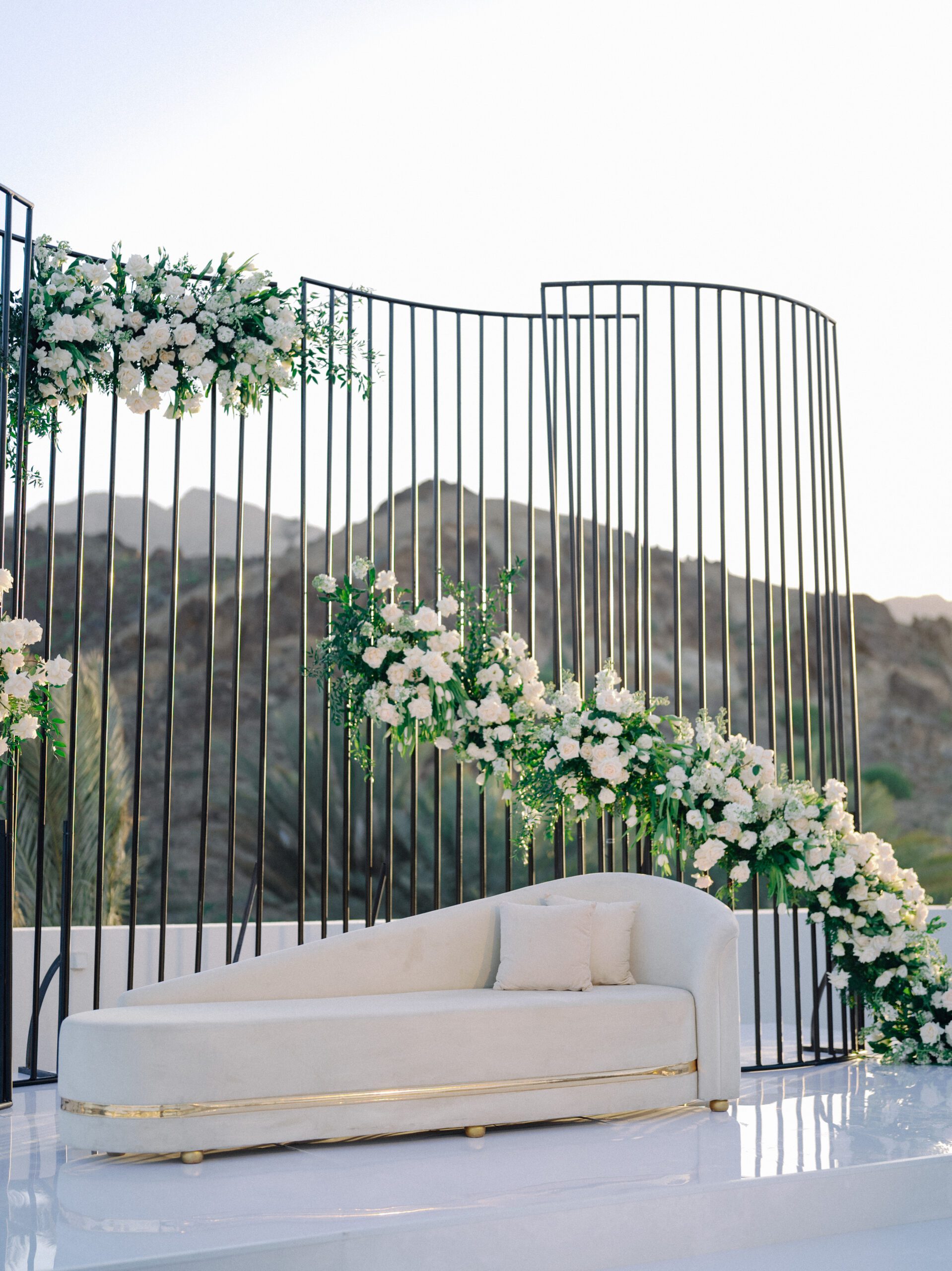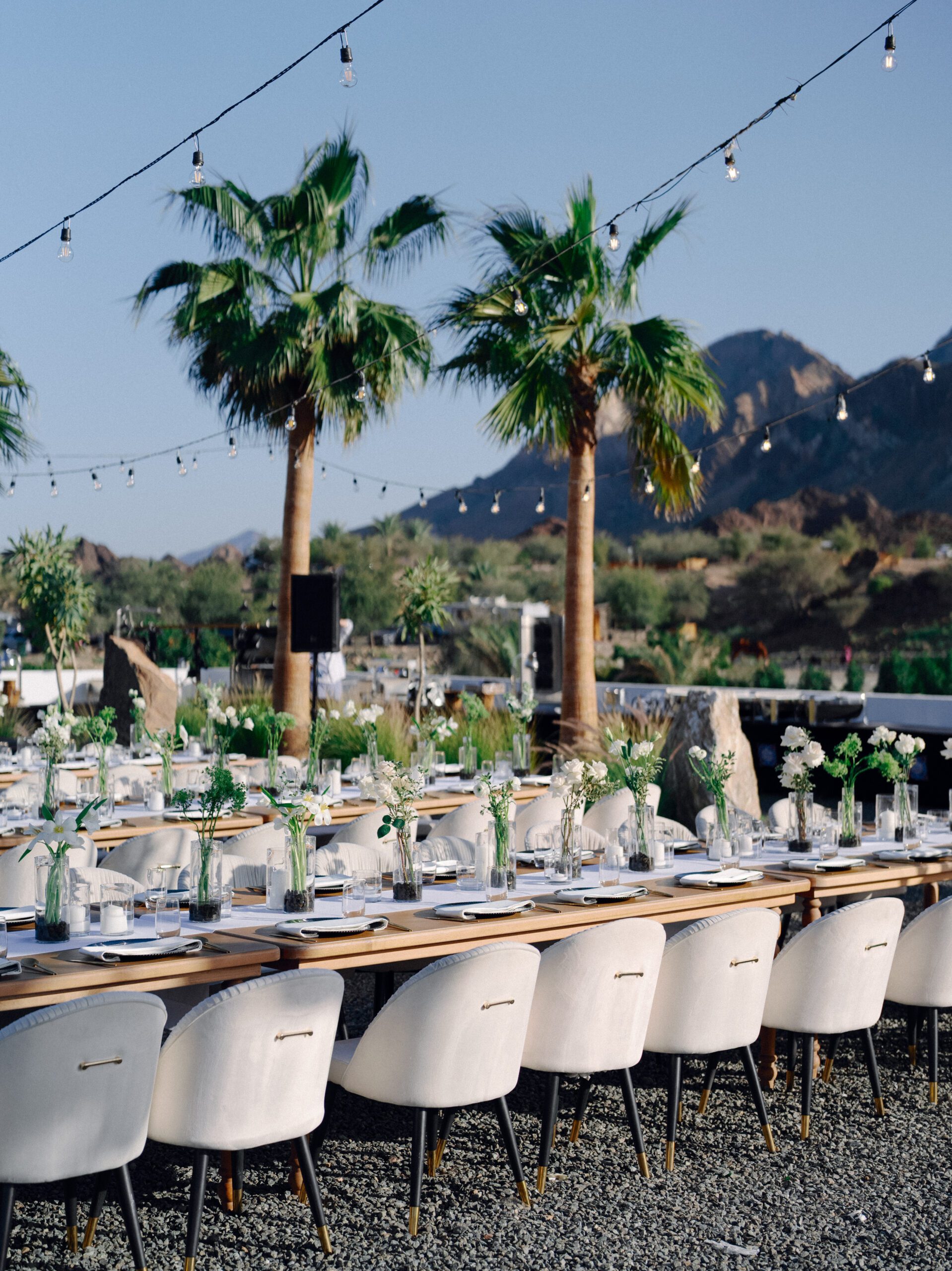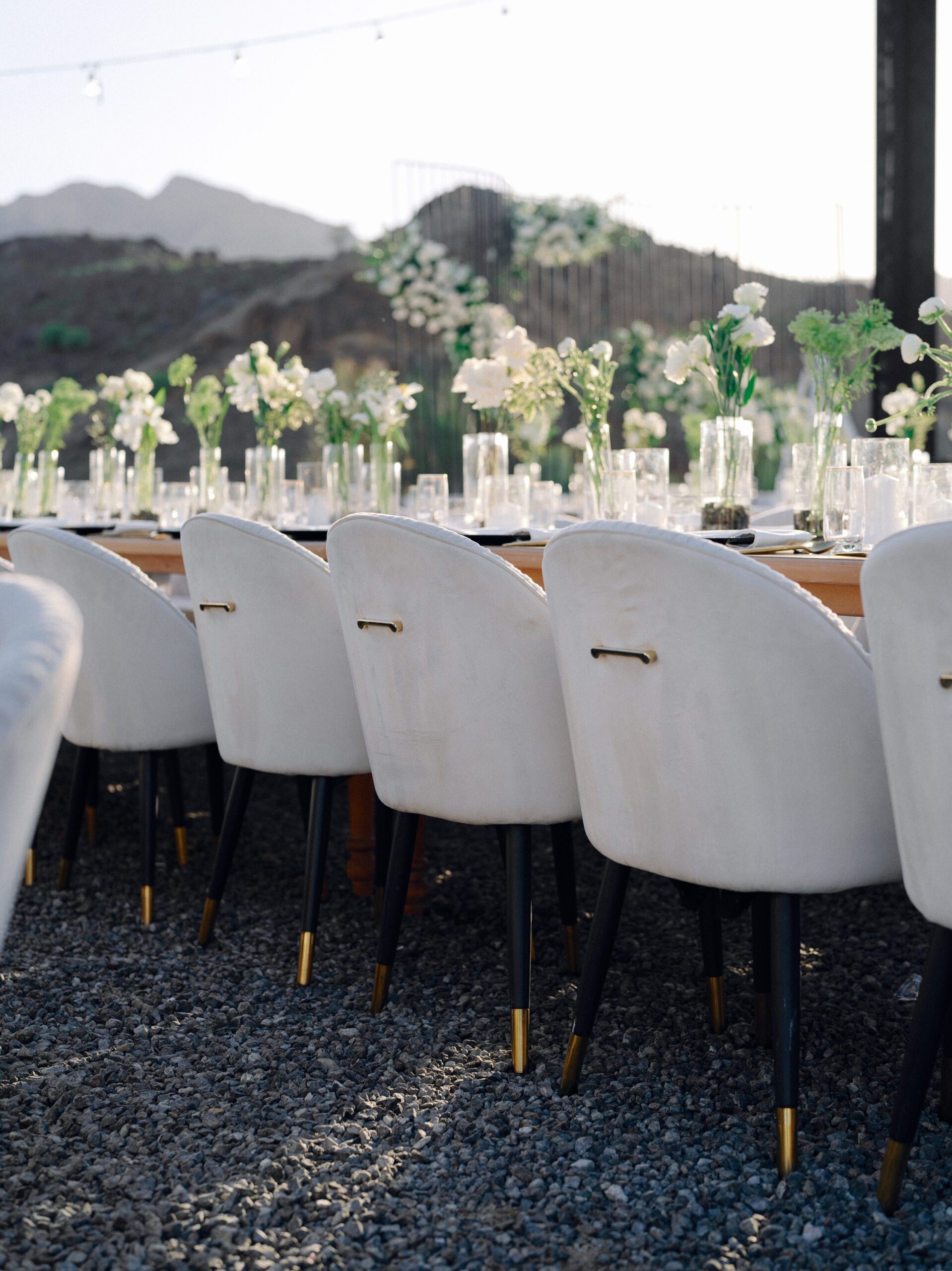 A stunning outdoor celebration set against the majestic mountains of Hatta Haven, where a rugged, rocky terrain was transformed into an elegant and serene luxury venue. The simple yet classic white décor, accented with touches of black for contrast and a minimalistic feel, beautifully complemented the natural landscape, creating a harmonious and unforgettable atmosphere.