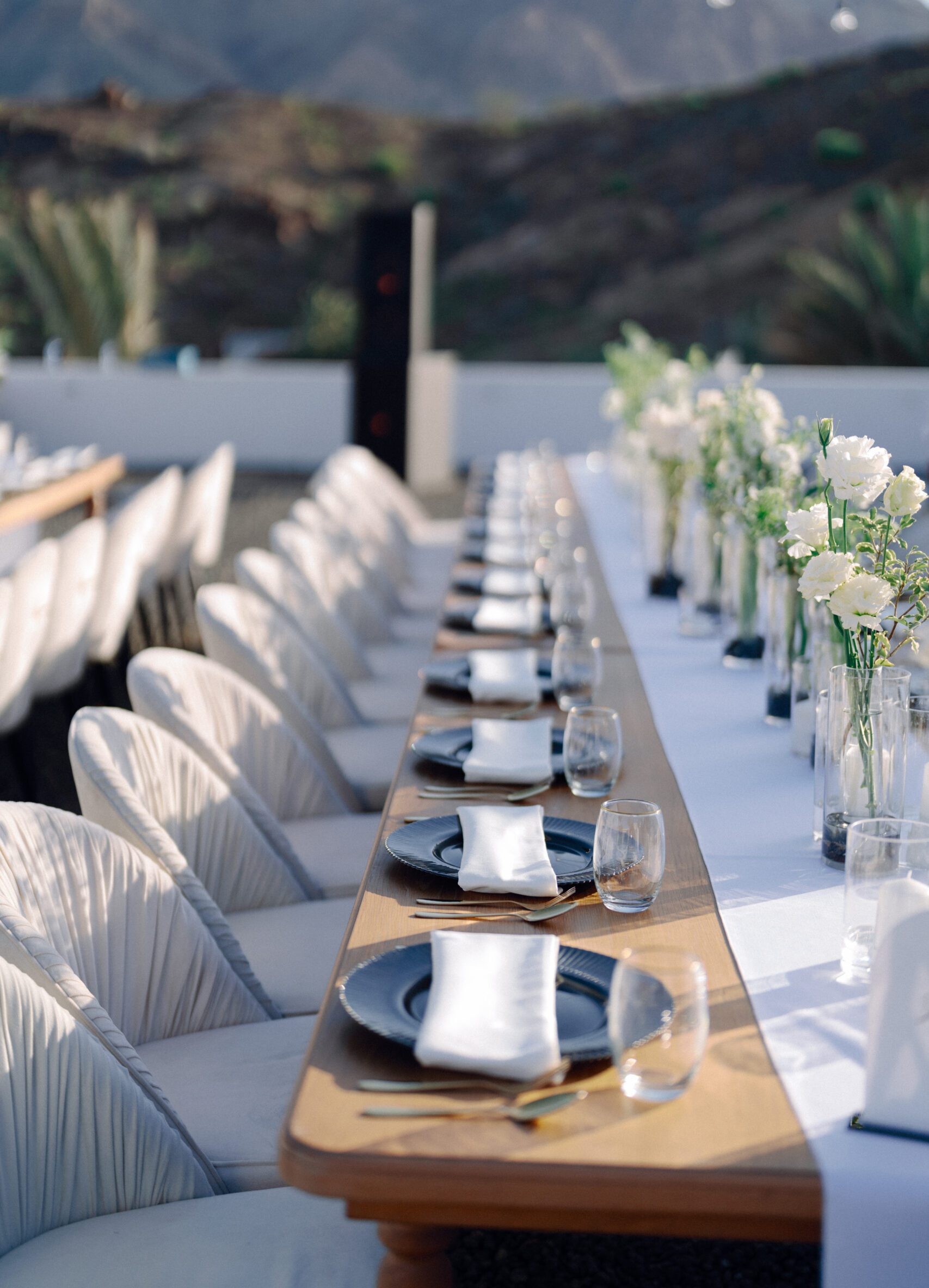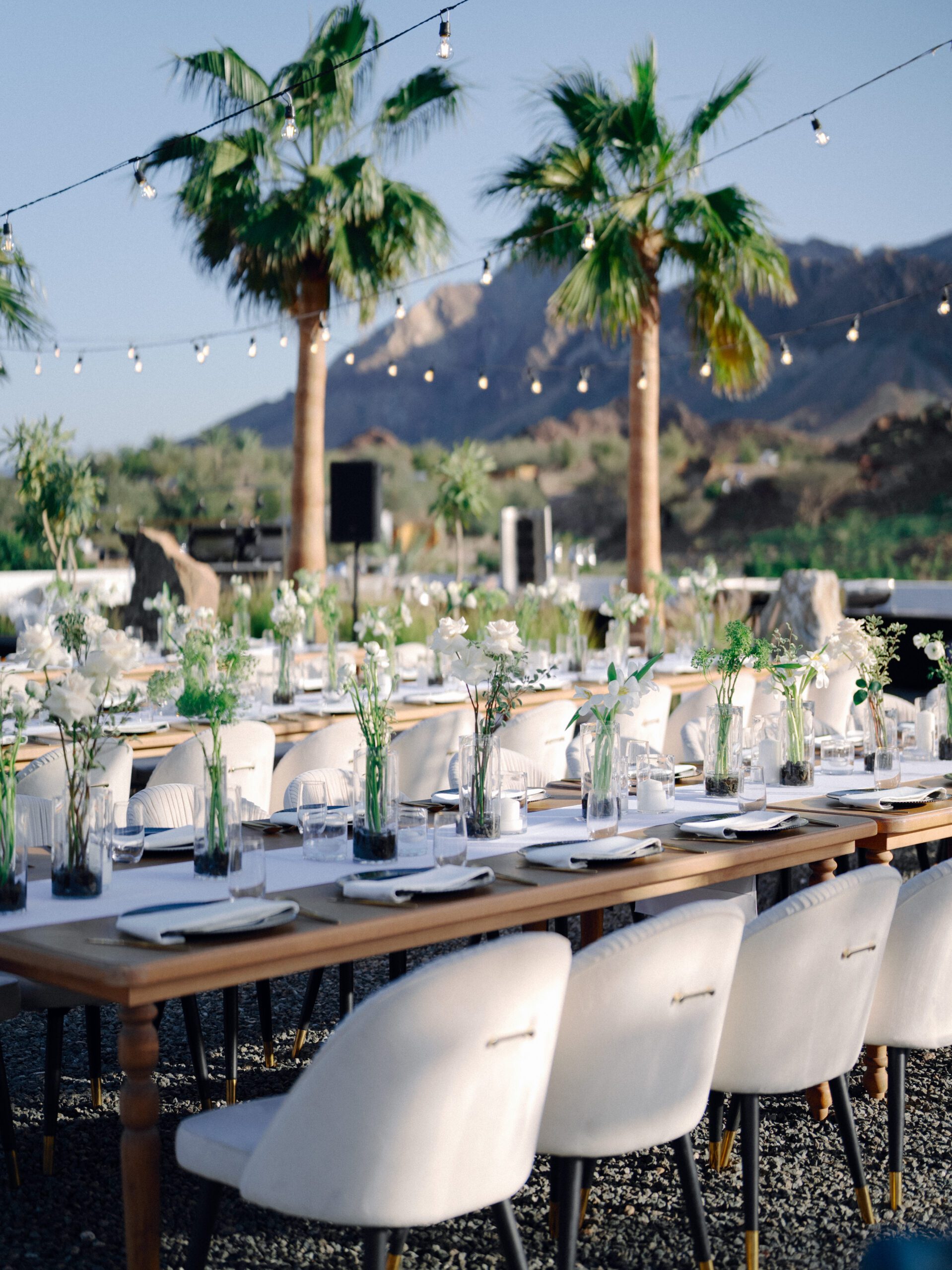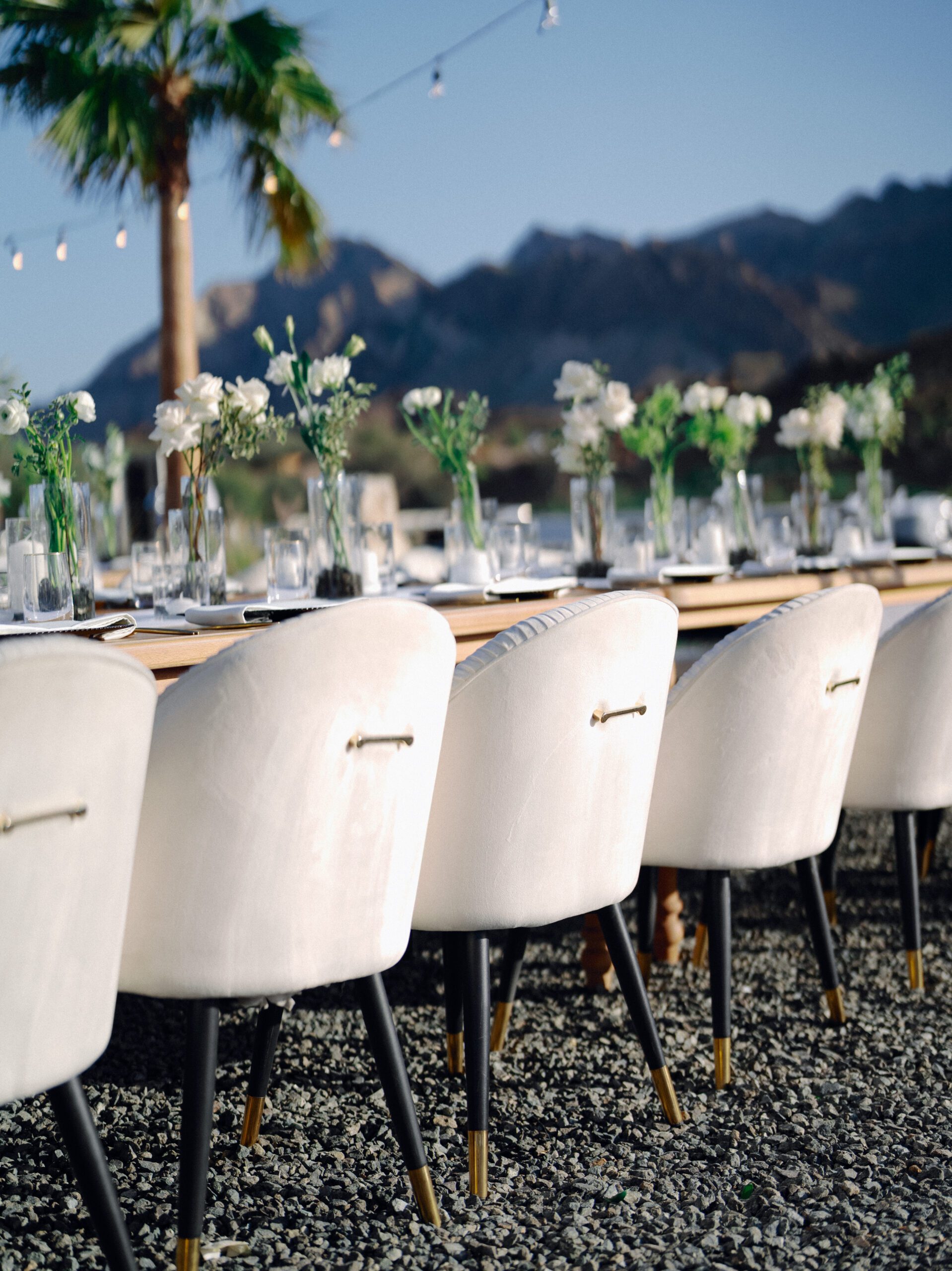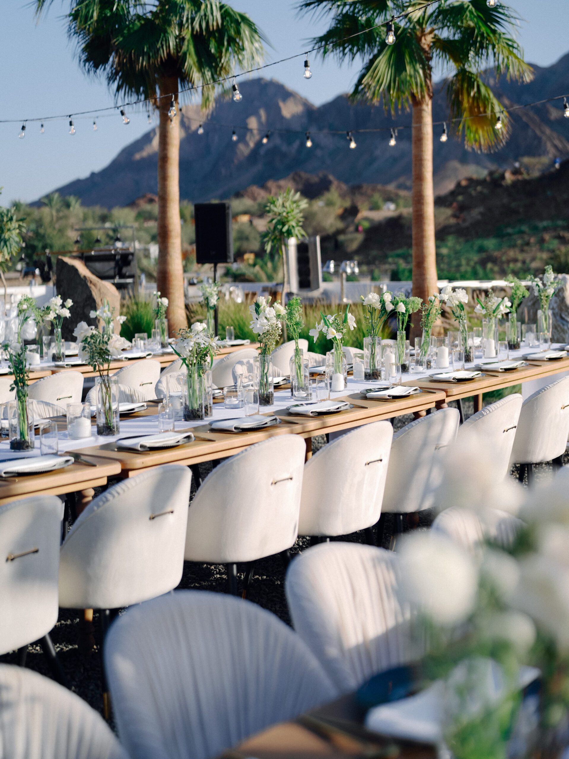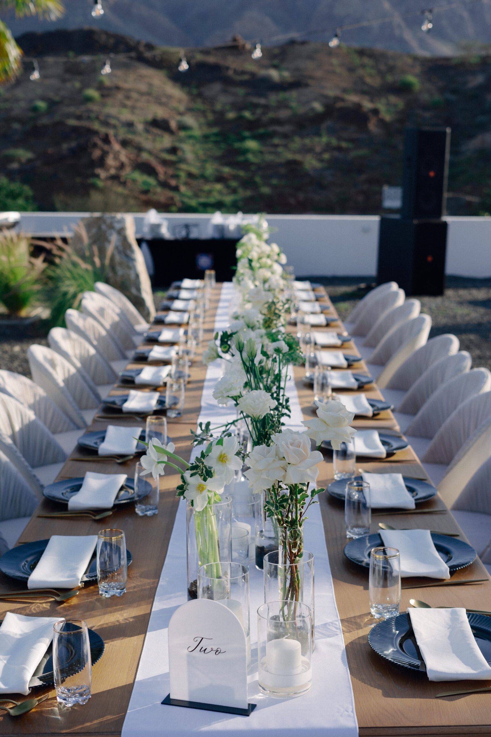 A stunning outdoor celebration set against the majestic mountains of Hatta Haven, where a rugged, rocky terrain was transformed into an elegant and serene luxury venue. The simple yet classic white décor, accented with touches of black for contrast and a minimalistic feel, beautifully complemented the natural landscape, creating a harmonious and unforgettable atmosphere.