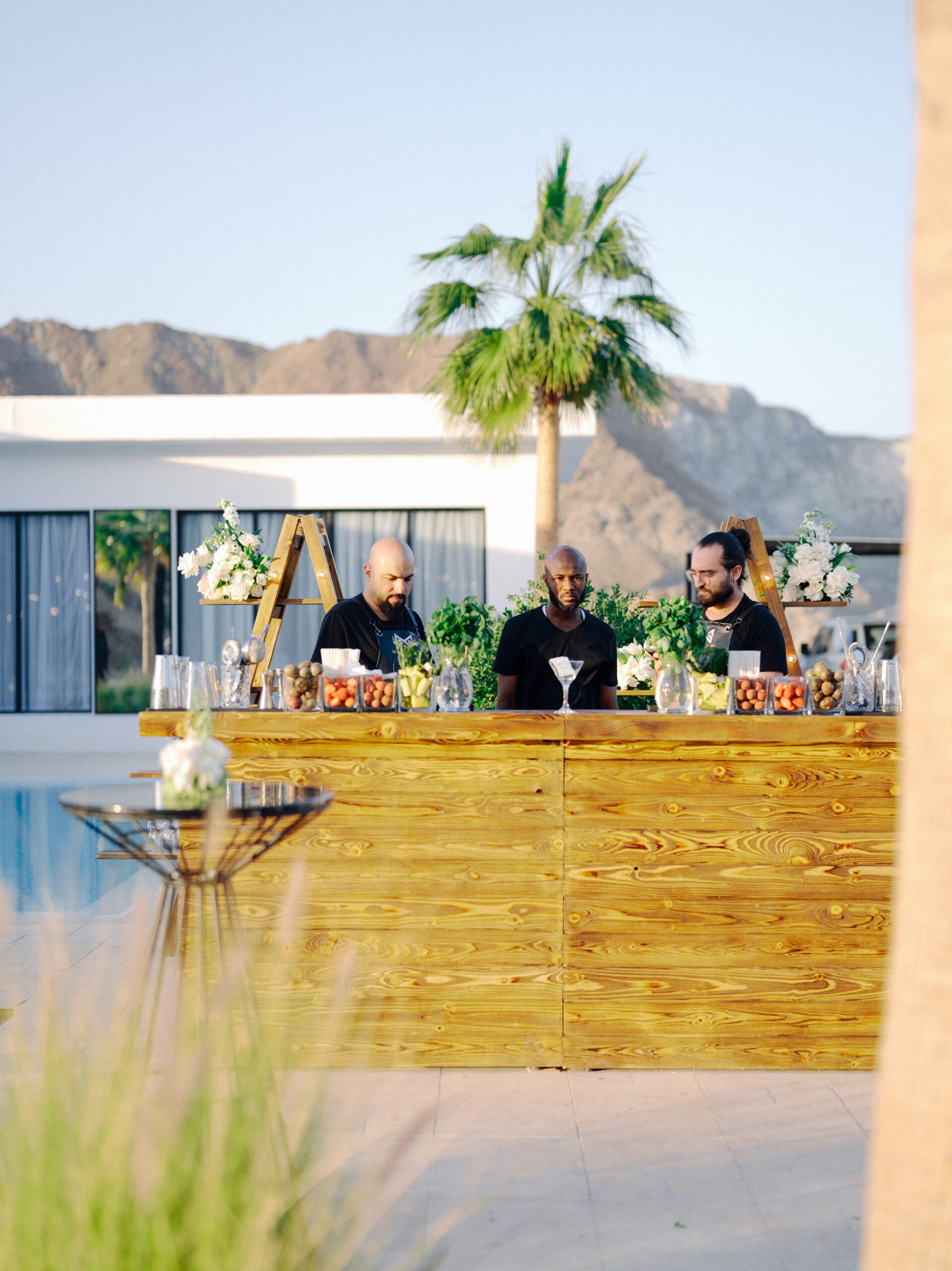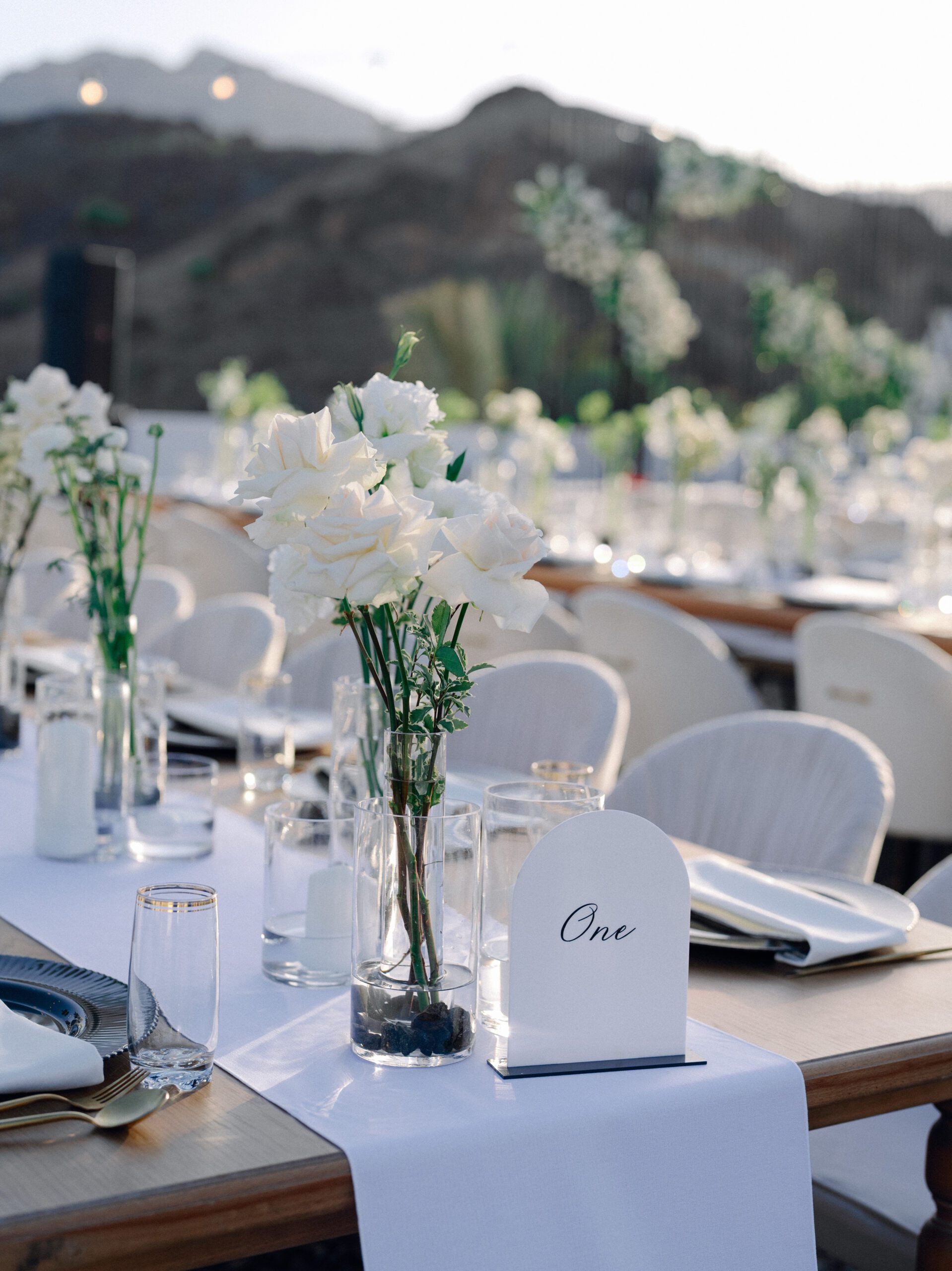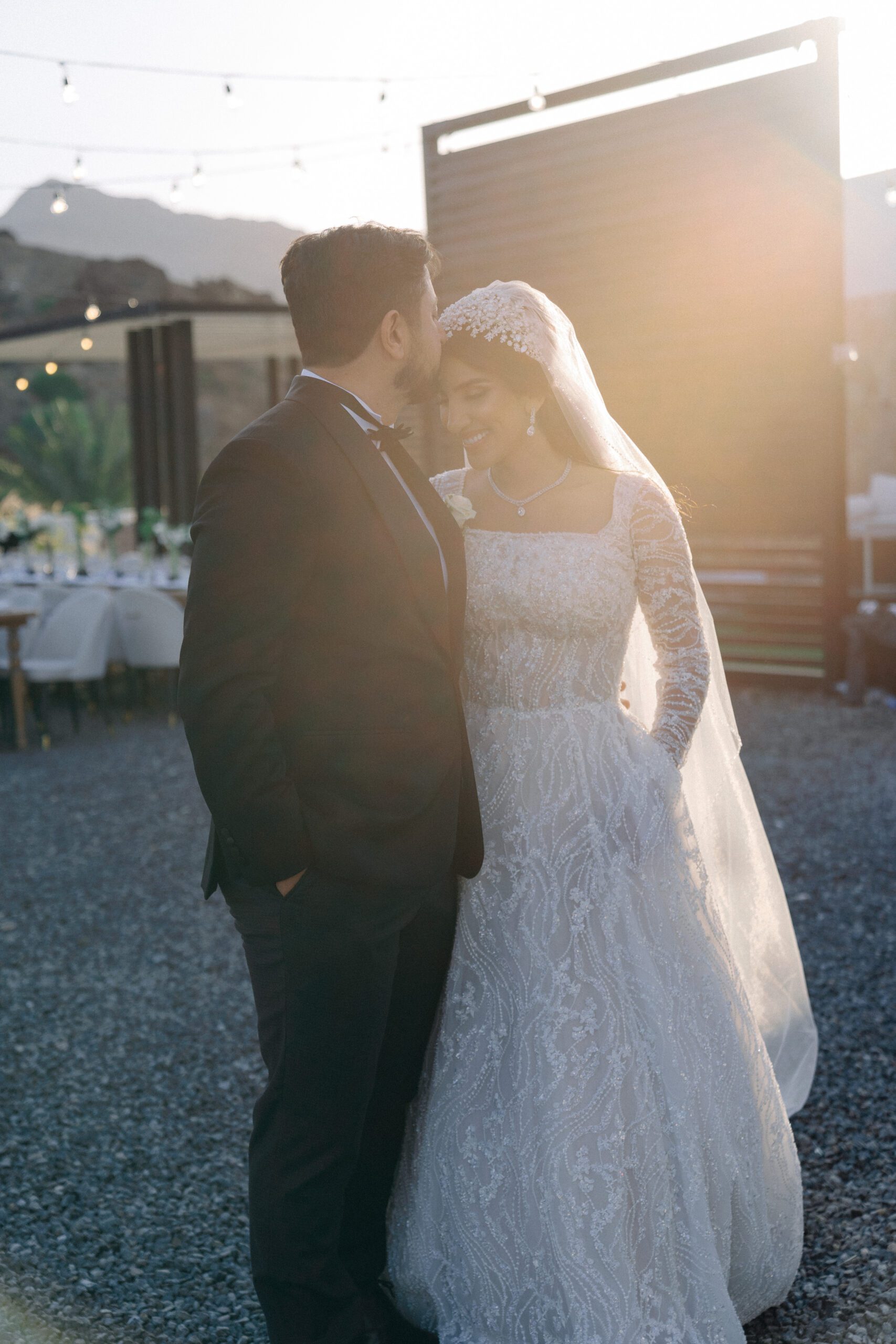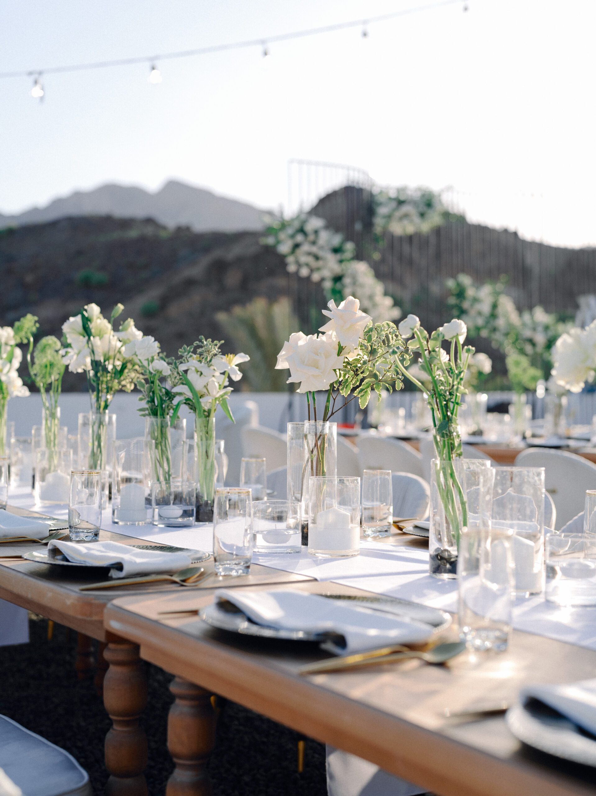 A stunning outdoor celebration set against the majestic mountains of Hatta Haven, where a rugged, rocky terrain was transformed into an elegant and serene luxury venue. The simple yet classic white décor, accented with touches of black for contrast and a minimalistic feel, beautifully complemented the natural landscape, creating a harmonious and unforgettable atmosphere.