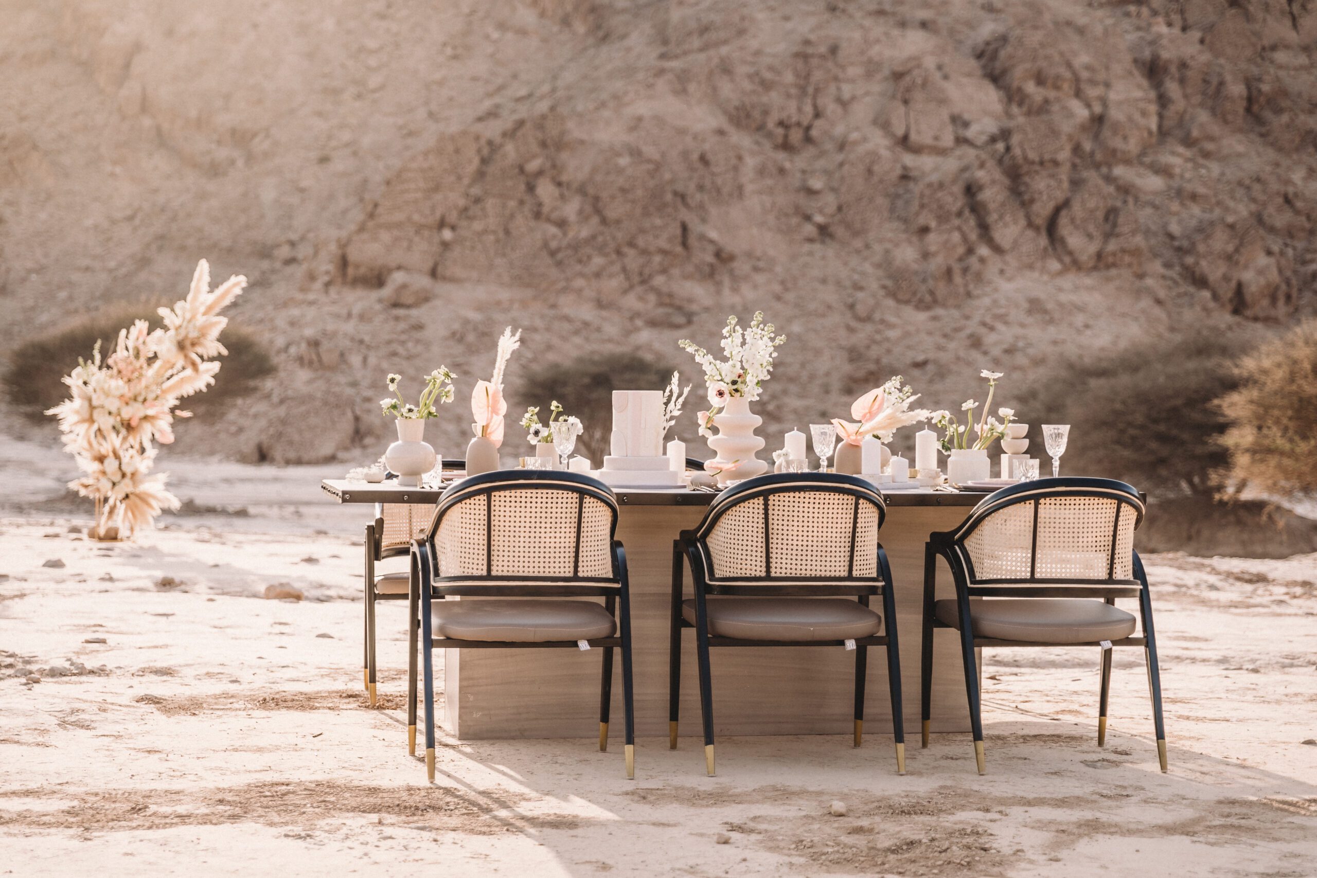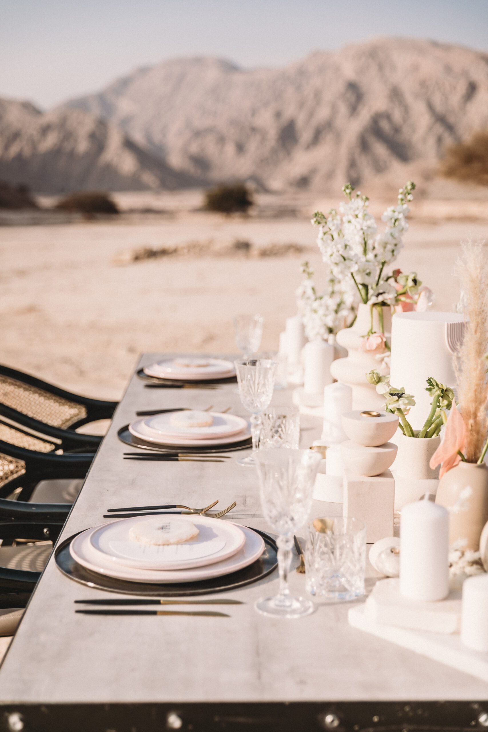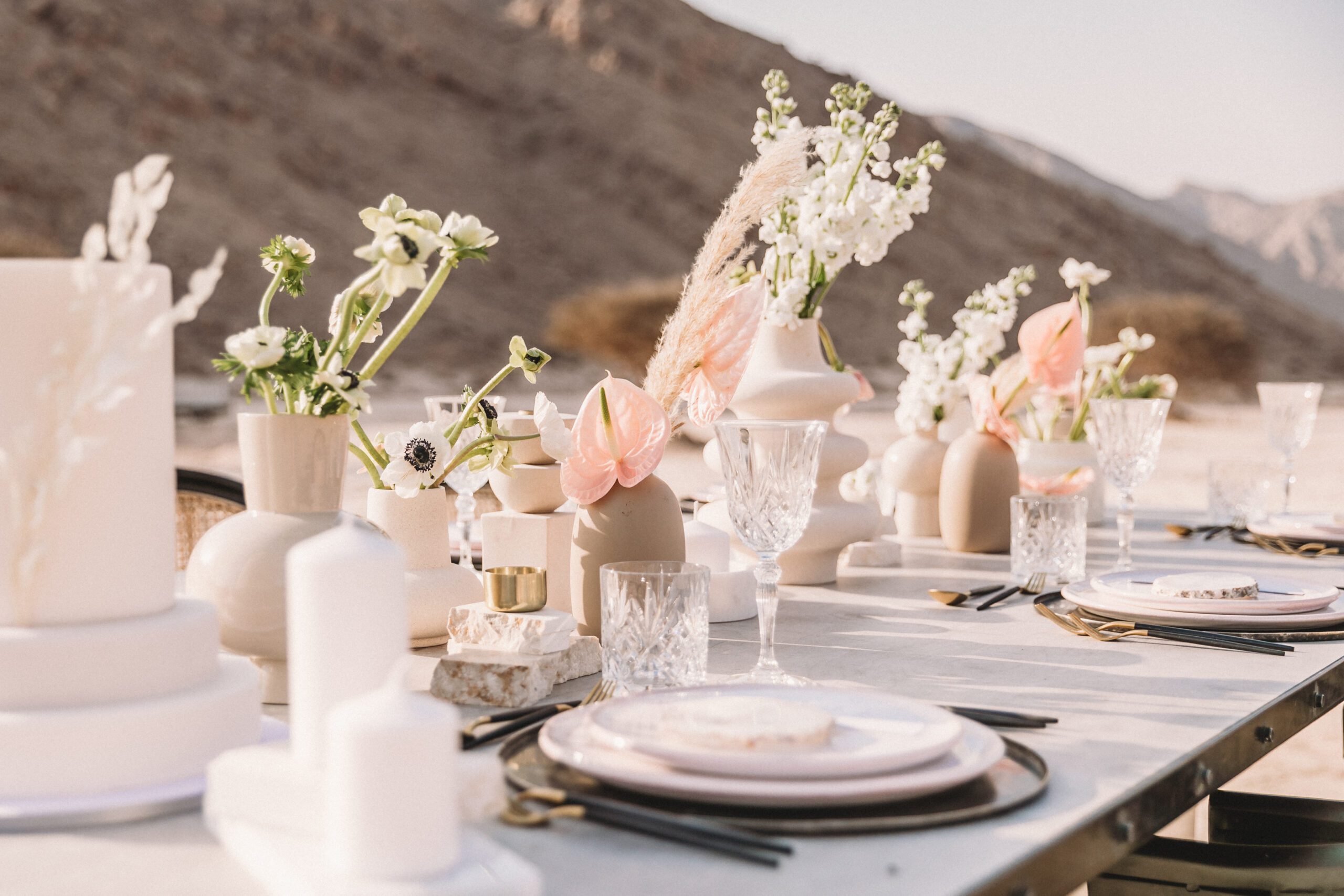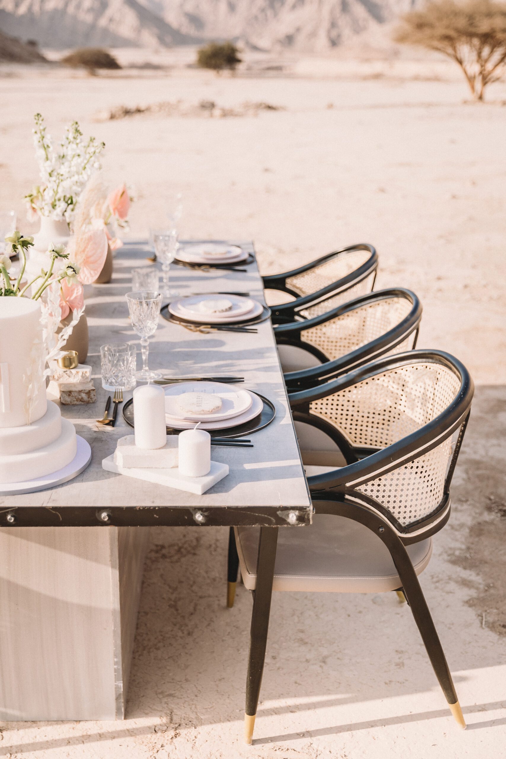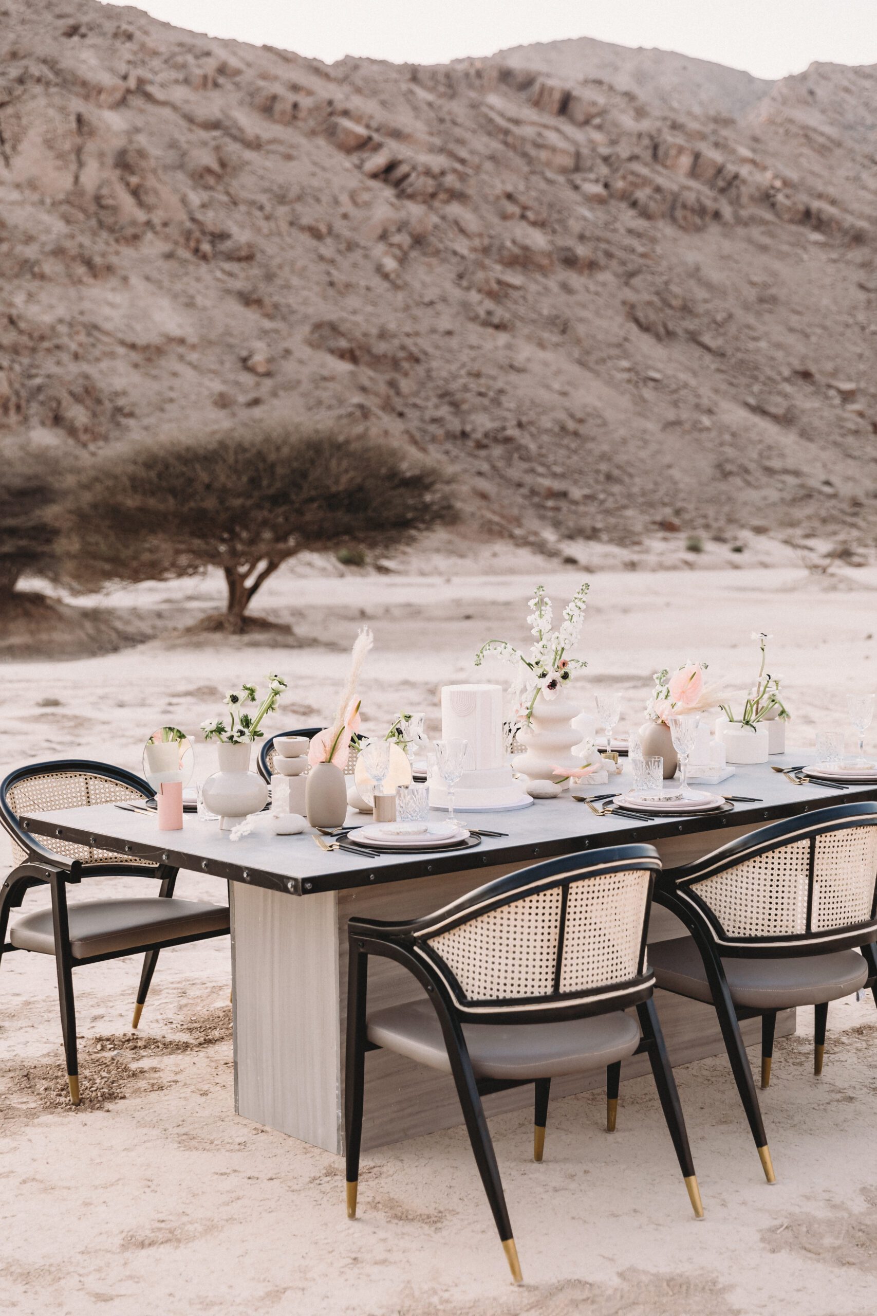 An intimate elopement set against the stunning mountain terrain at the base of Jebel Jais, featuring a minimal yet boho-inspired table décor in pink, white, and black. The design incorporated raw materials like marble slabs for the floral arrangements, metal showplates, and a concrete table, blending natural textures with elegant simplicity for a uniquely stylish celebration.