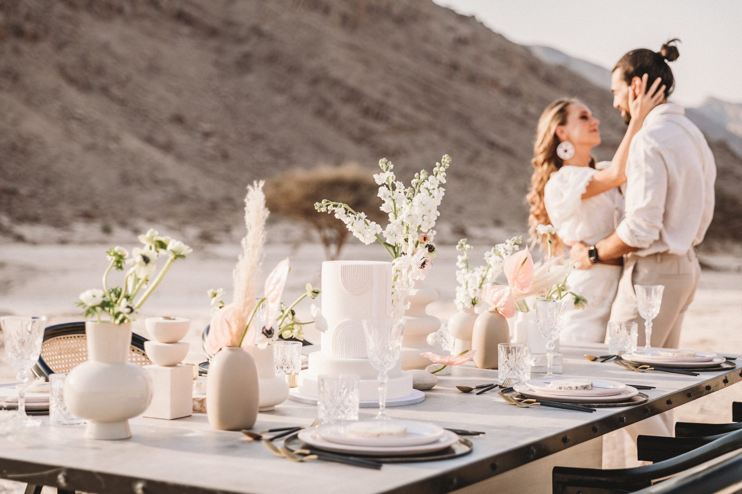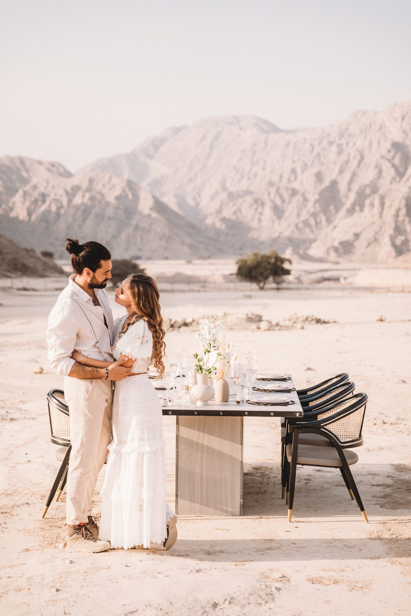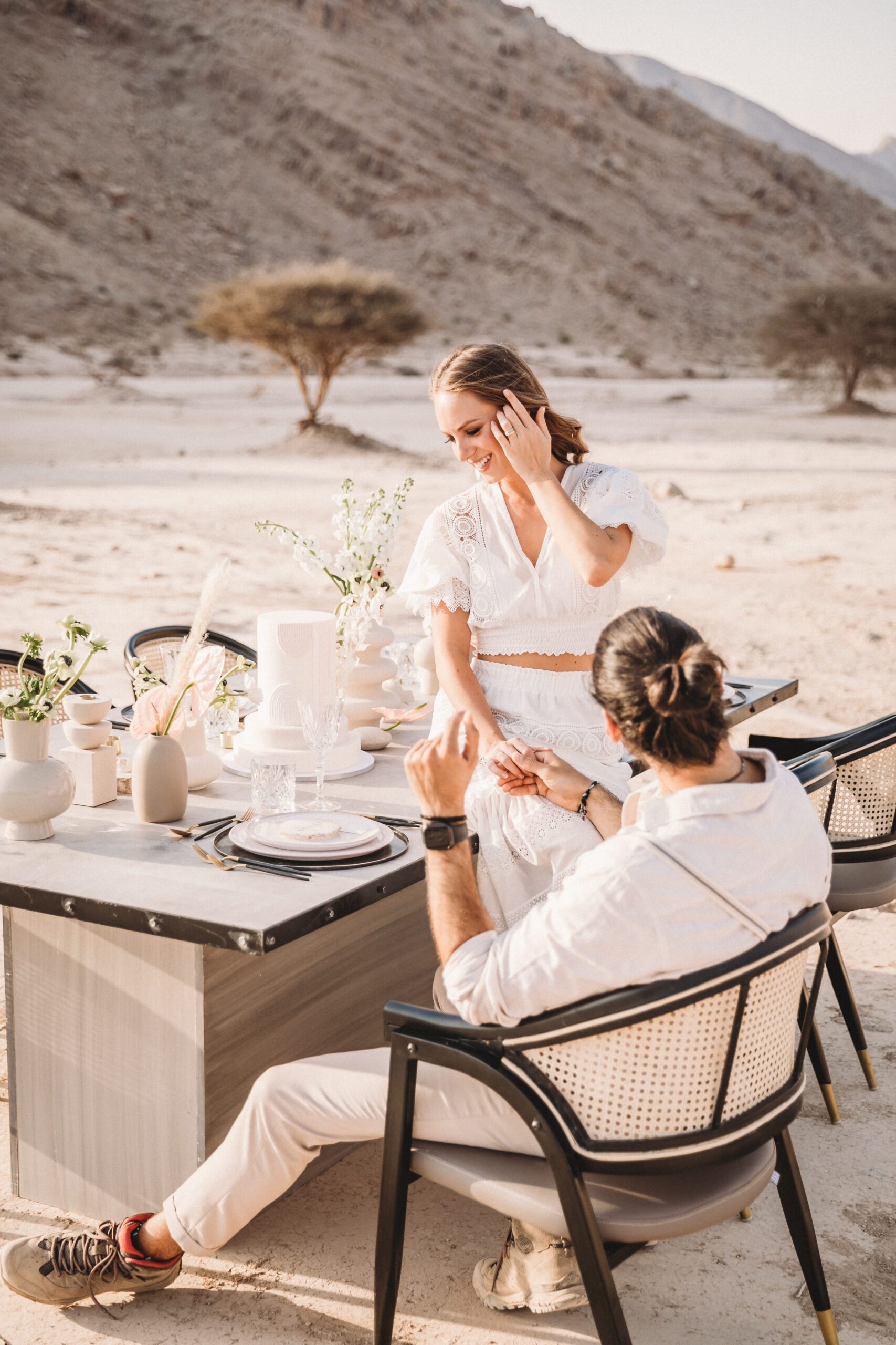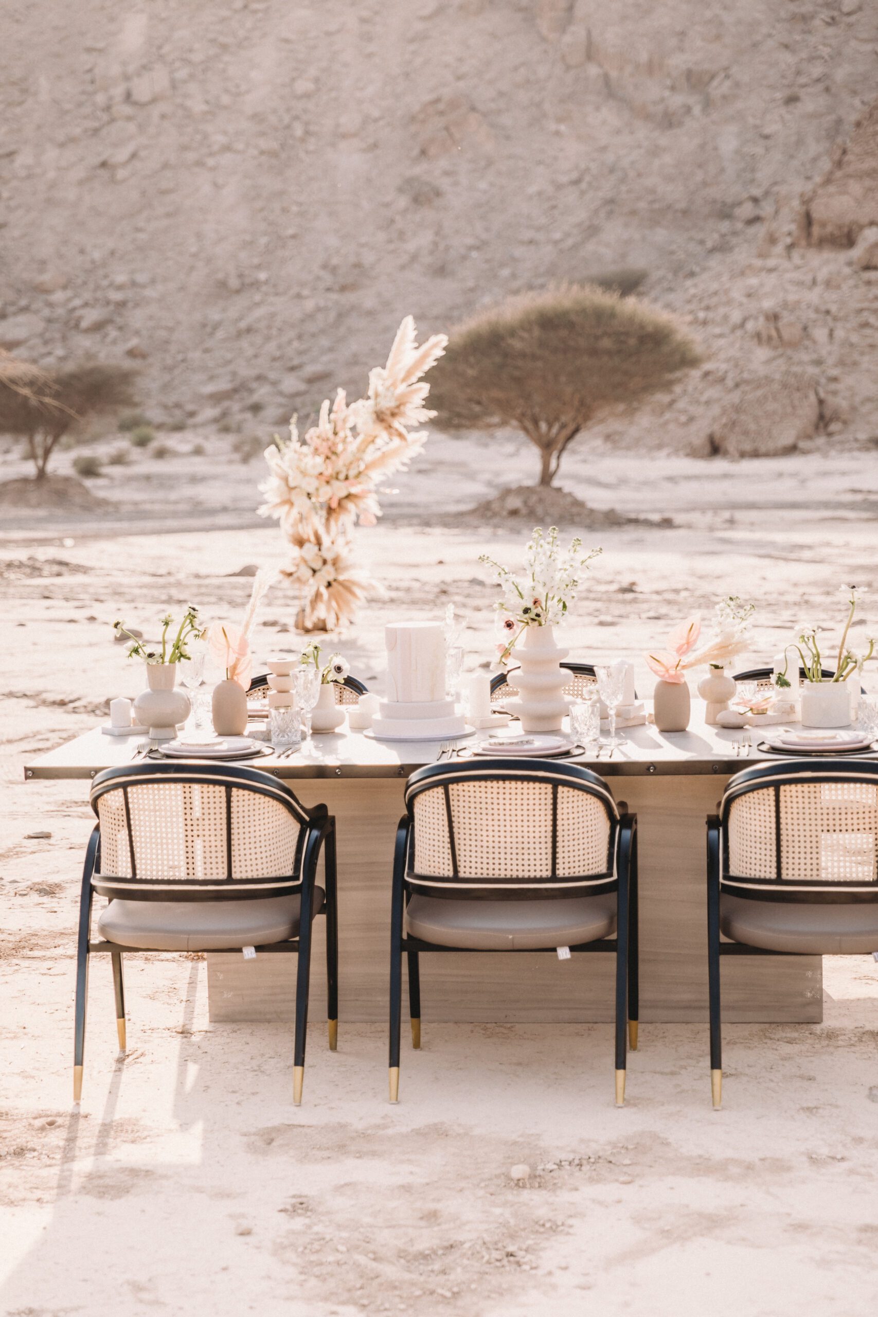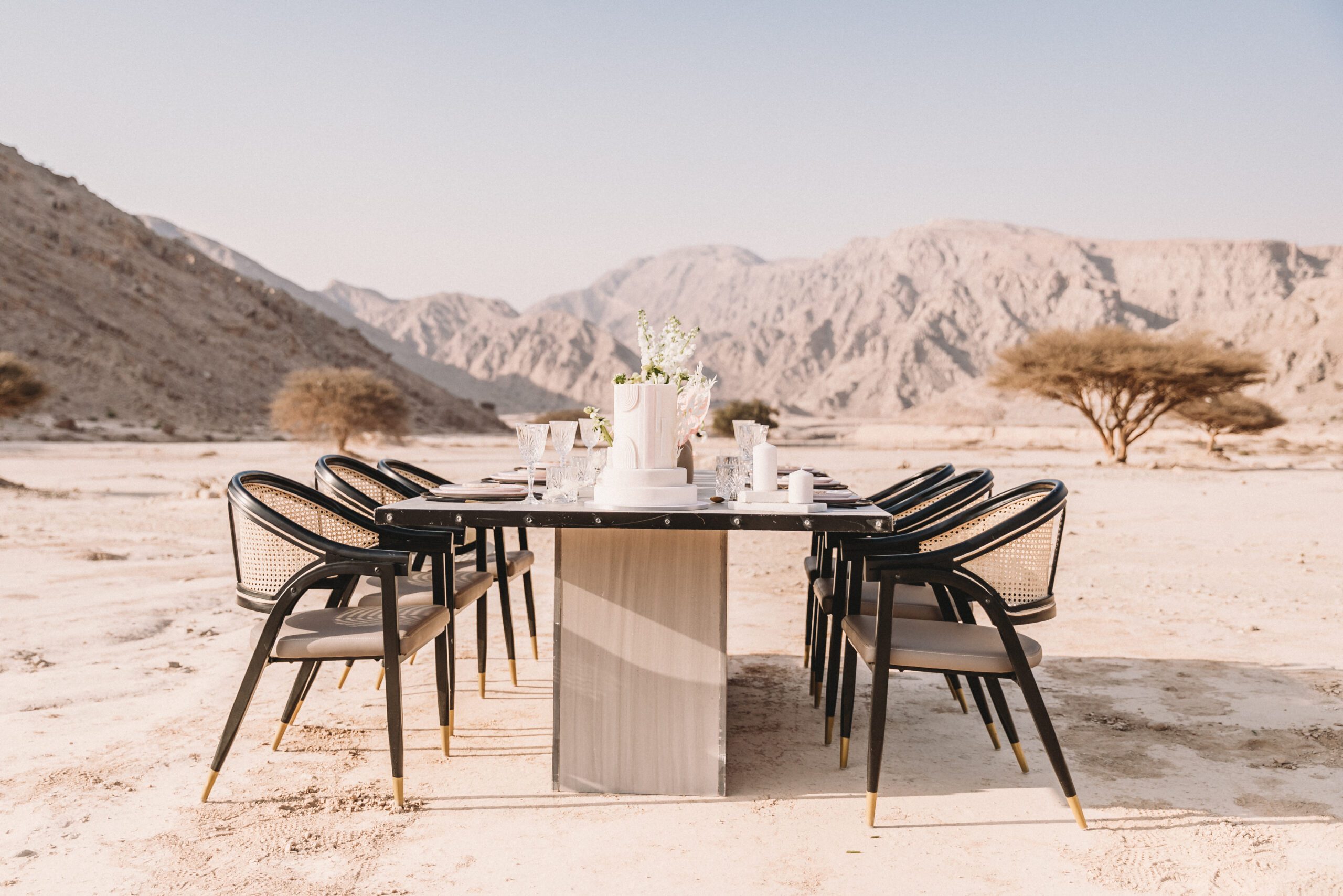 An intimate elopement set against the stunning mountain terrain at the base of Jebel Jais, featuring a minimal yet boho-inspired table décor in pink, white, and black. The design incorporated raw materials like marble slabs for the floral arrangements, metal showplates, and a concrete table, blending natural textures with elegant simplicity for a uniquely stylish celebration.