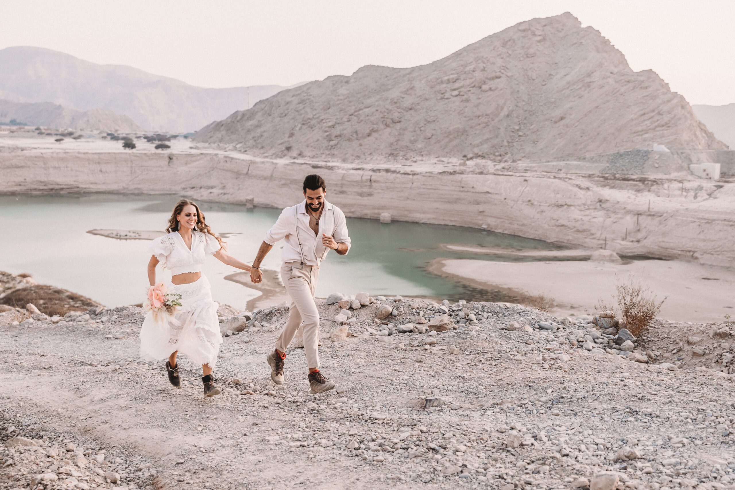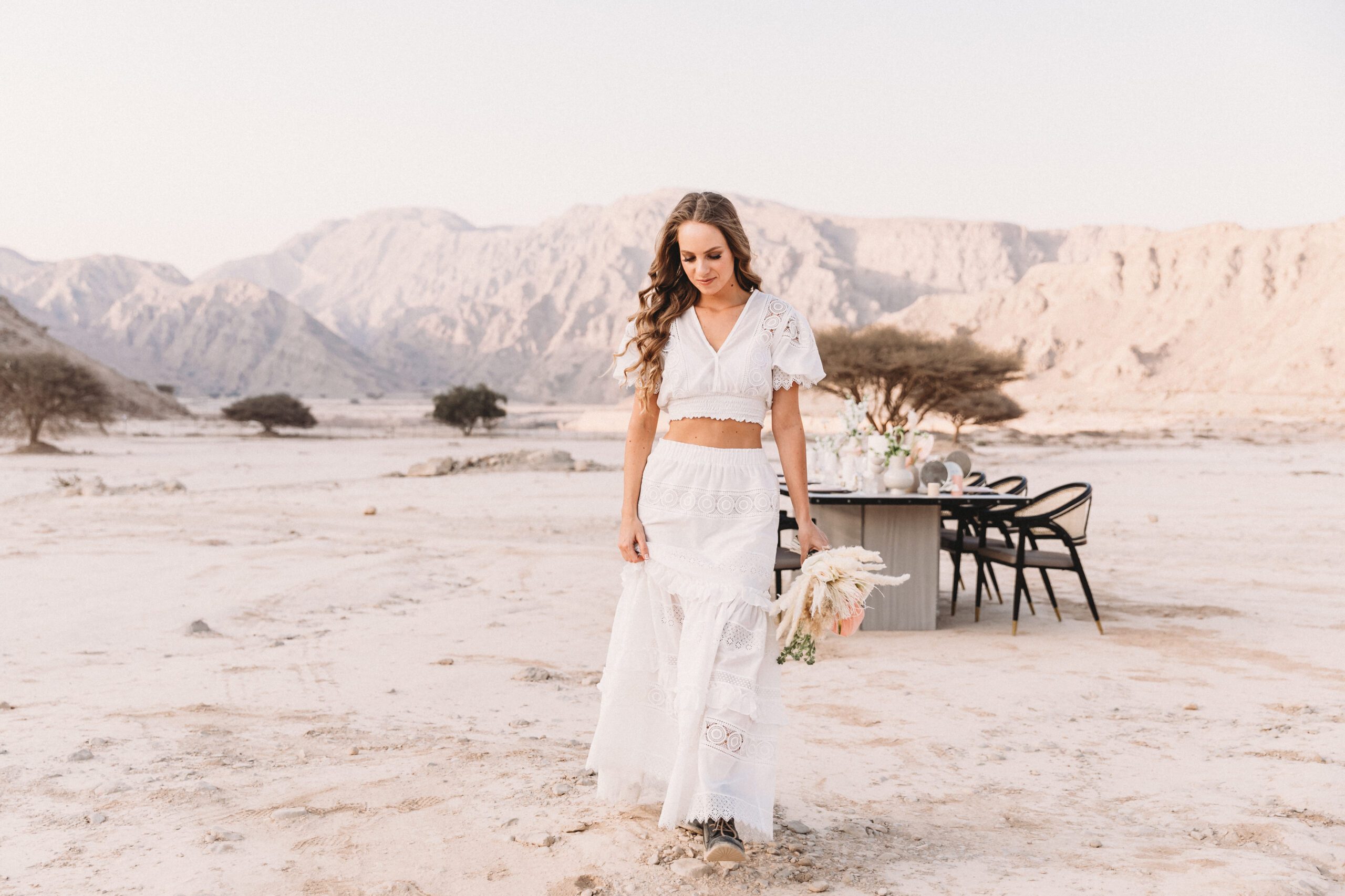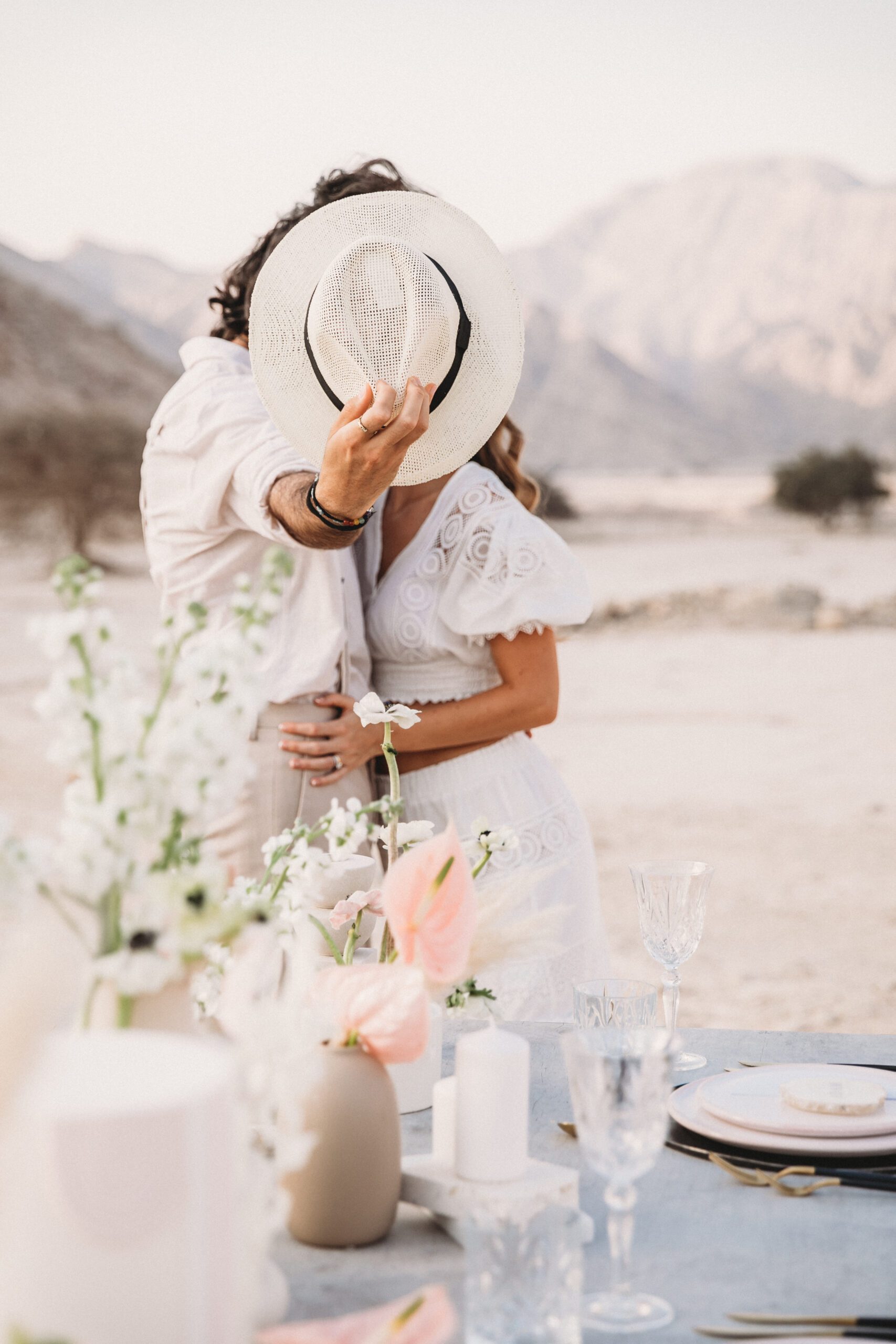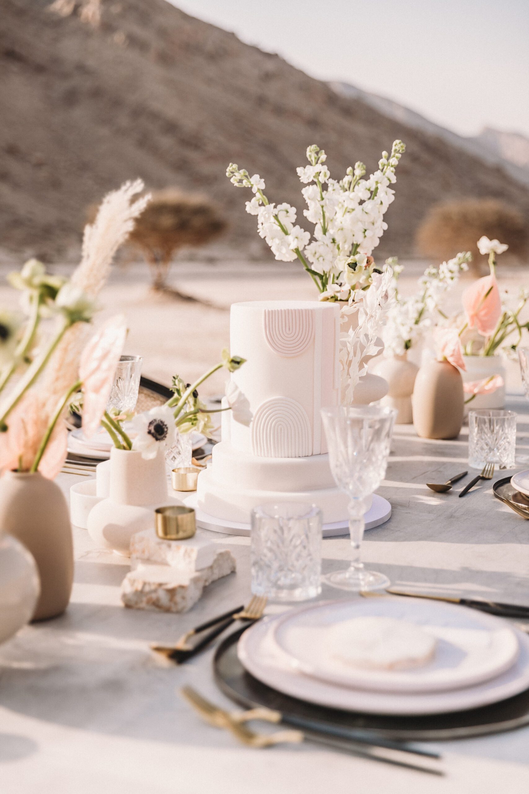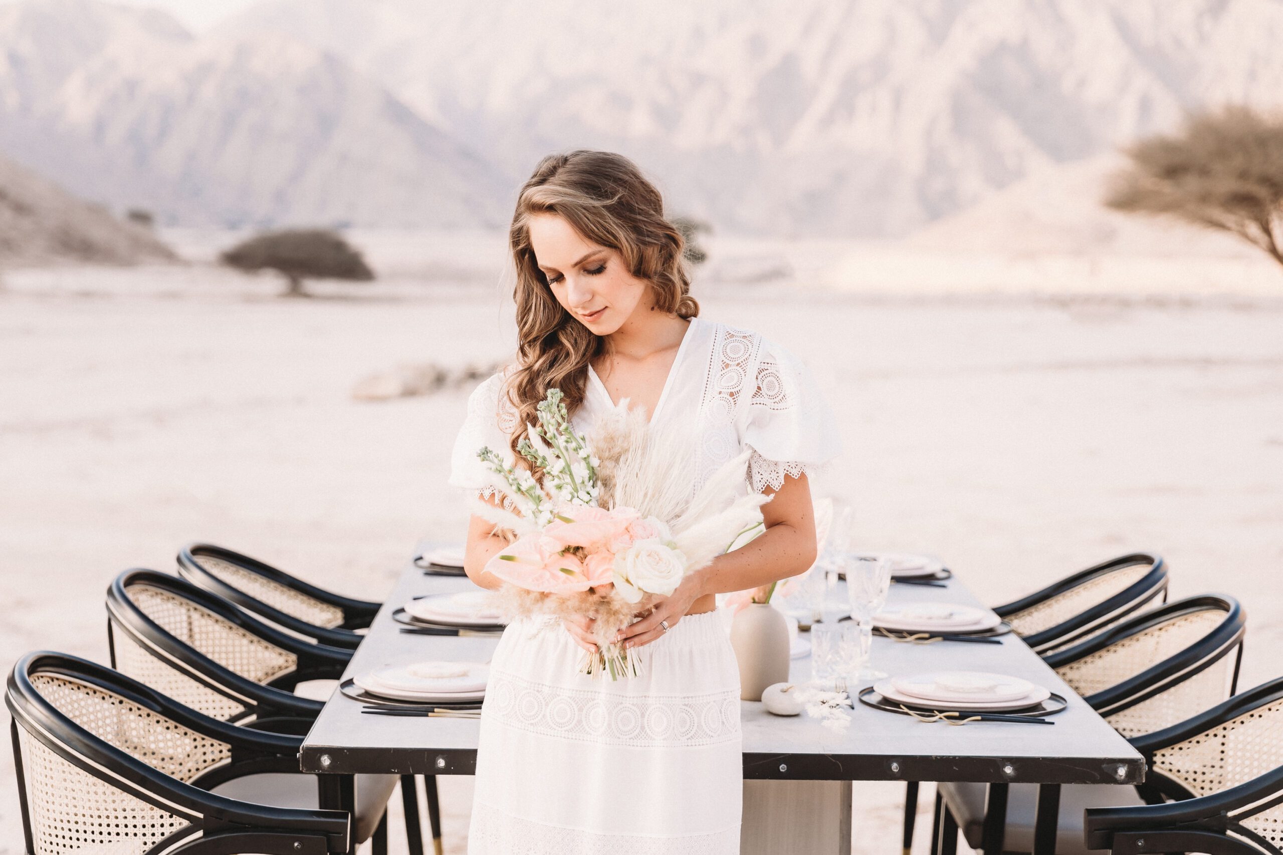 An intimate elopement set against the stunning mountain terrain at the base of Jebel Jais, featuring a minimal yet boho-inspired table décor in pink, white, and black. The design incorporated raw materials like marble slabs for the floral arrangements, metal showplates, and a concrete table, blending natural textures with elegant simplicity for a uniquely stylish celebration.