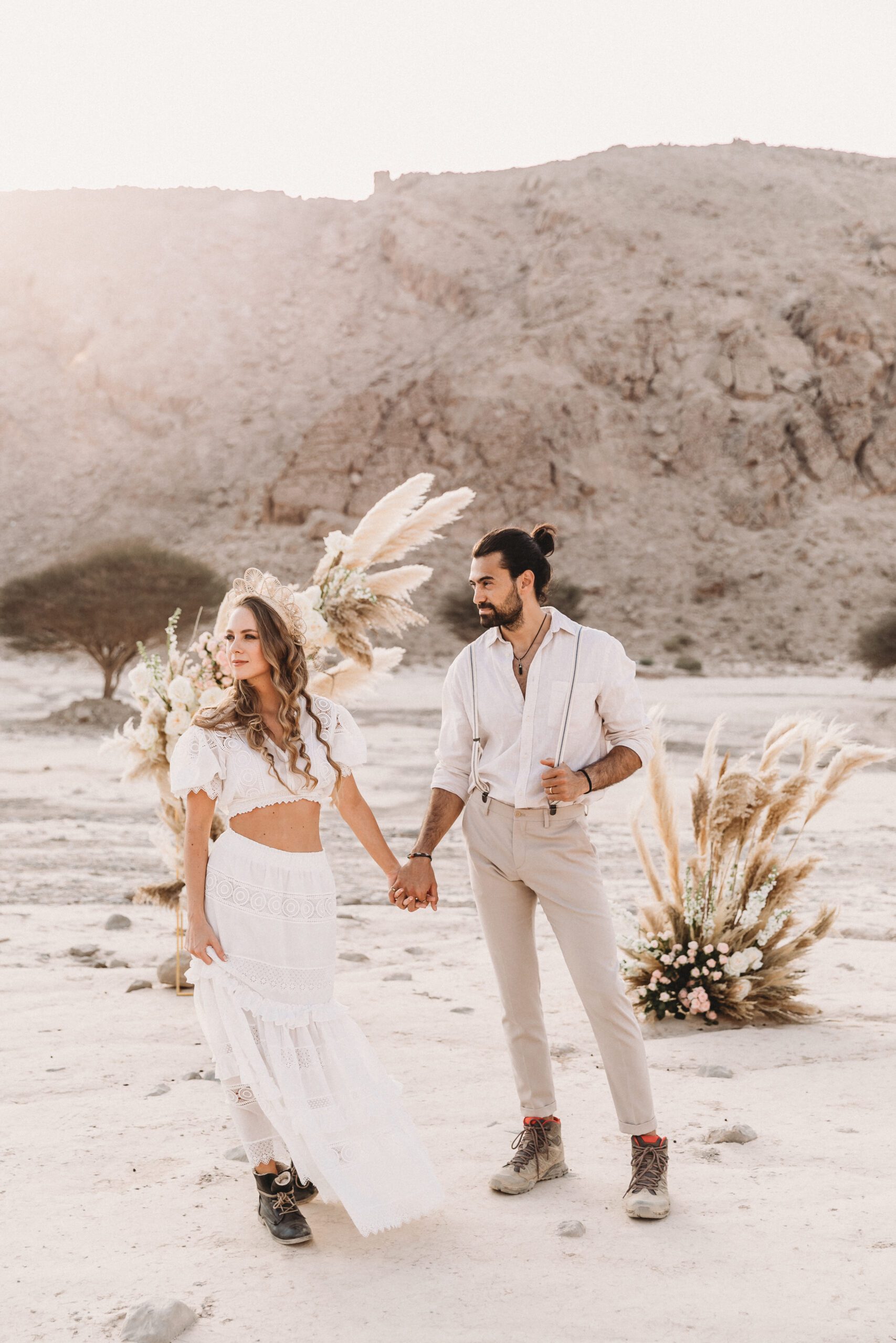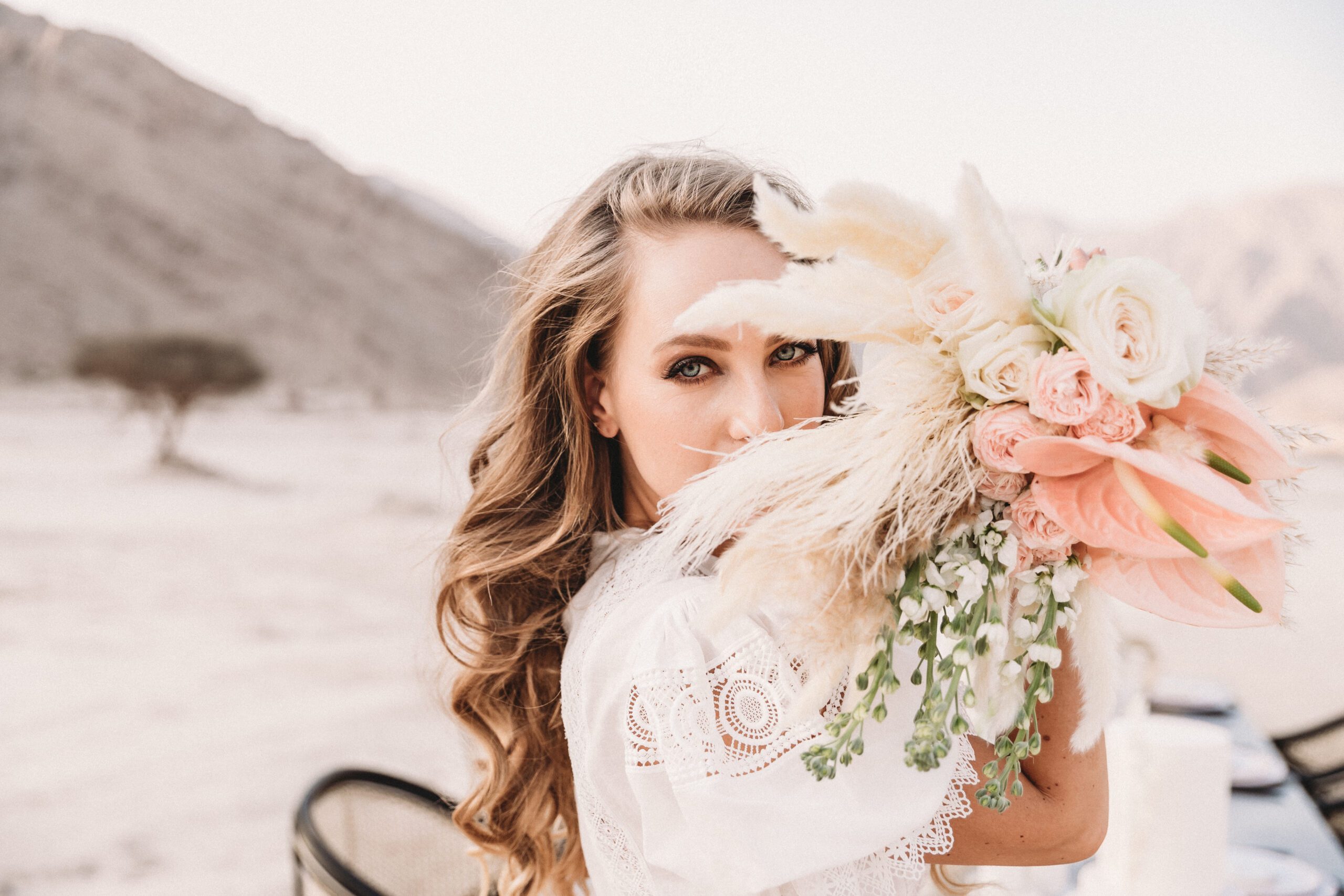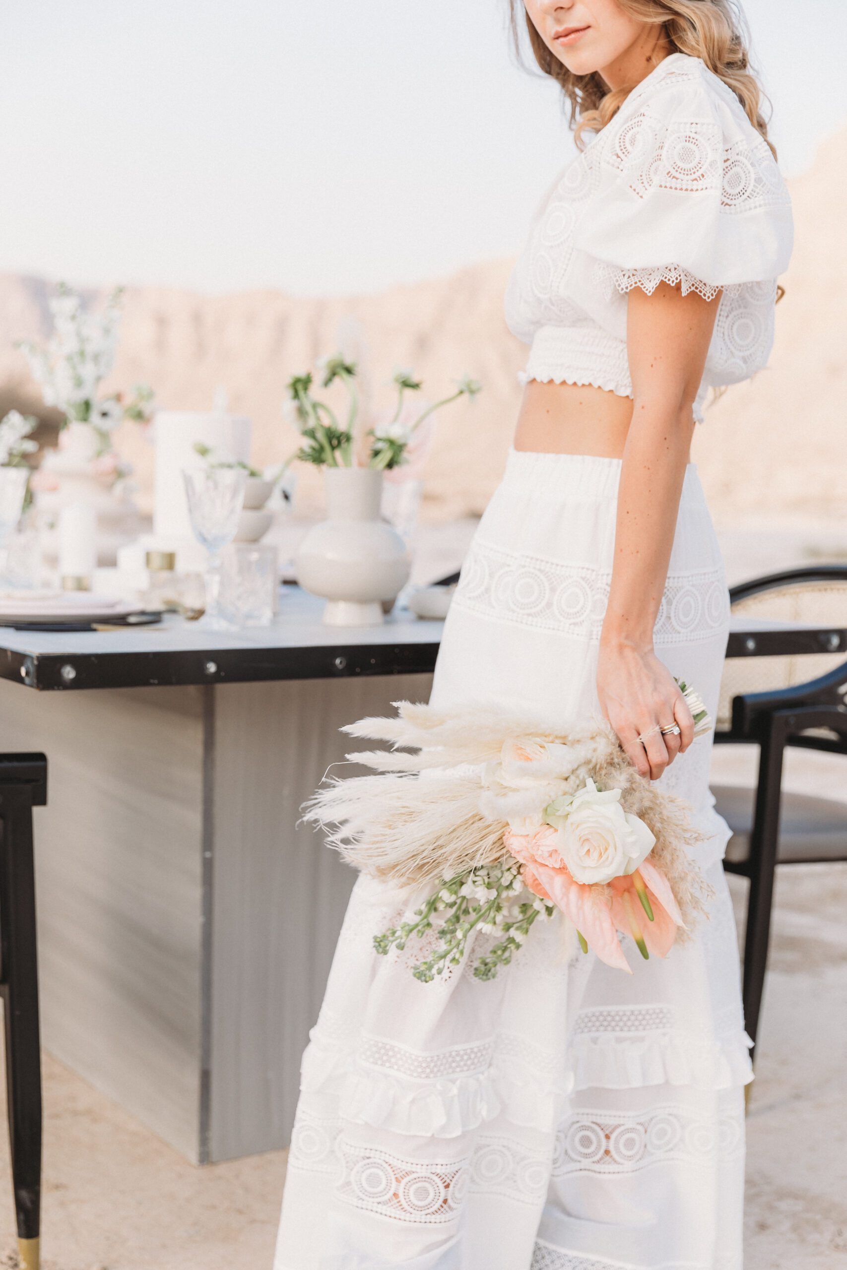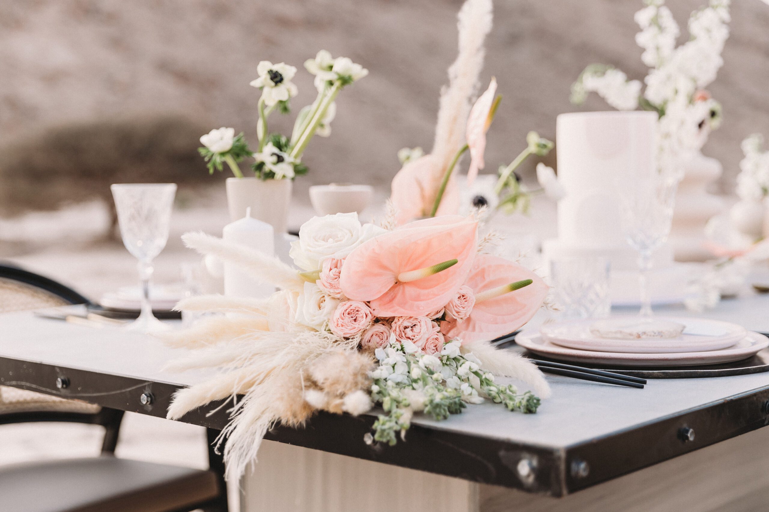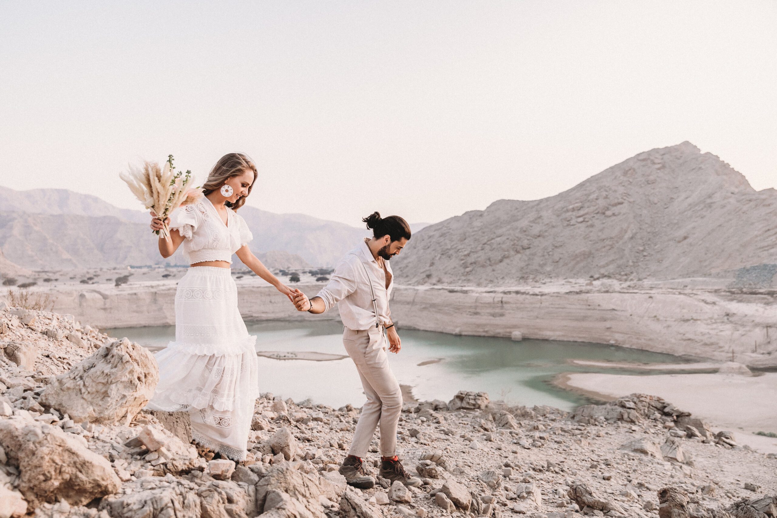 An intimate elopement set against the stunning mountain terrain at the base of Jebel Jais, featuring a minimal yet boho-inspired table décor in pink, white, and black. The design incorporated raw materials like marble slabs for the floral arrangements, metal showplates, and a concrete table, blending natural textures with elegant simplicity for a uniquely stylish celebration.