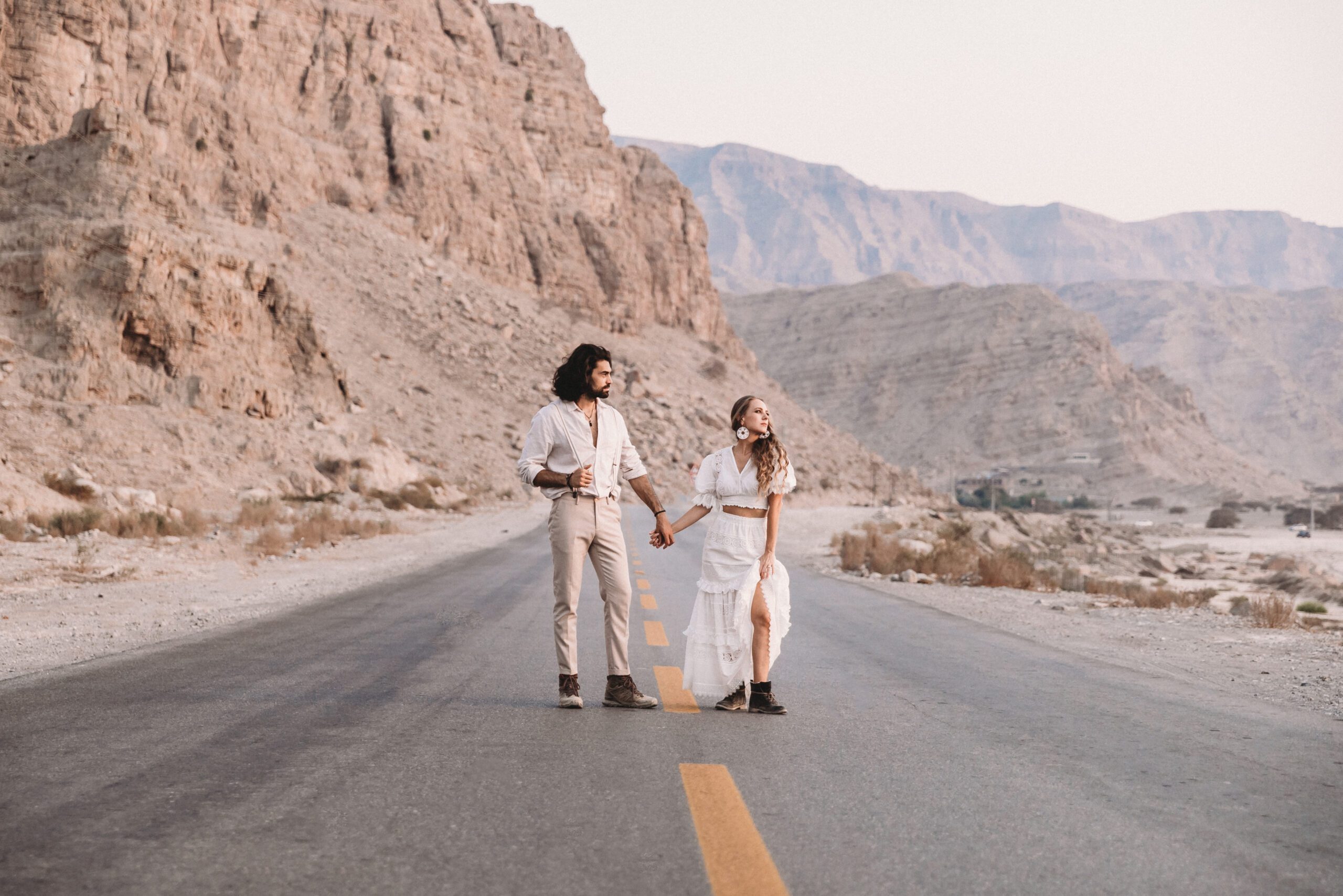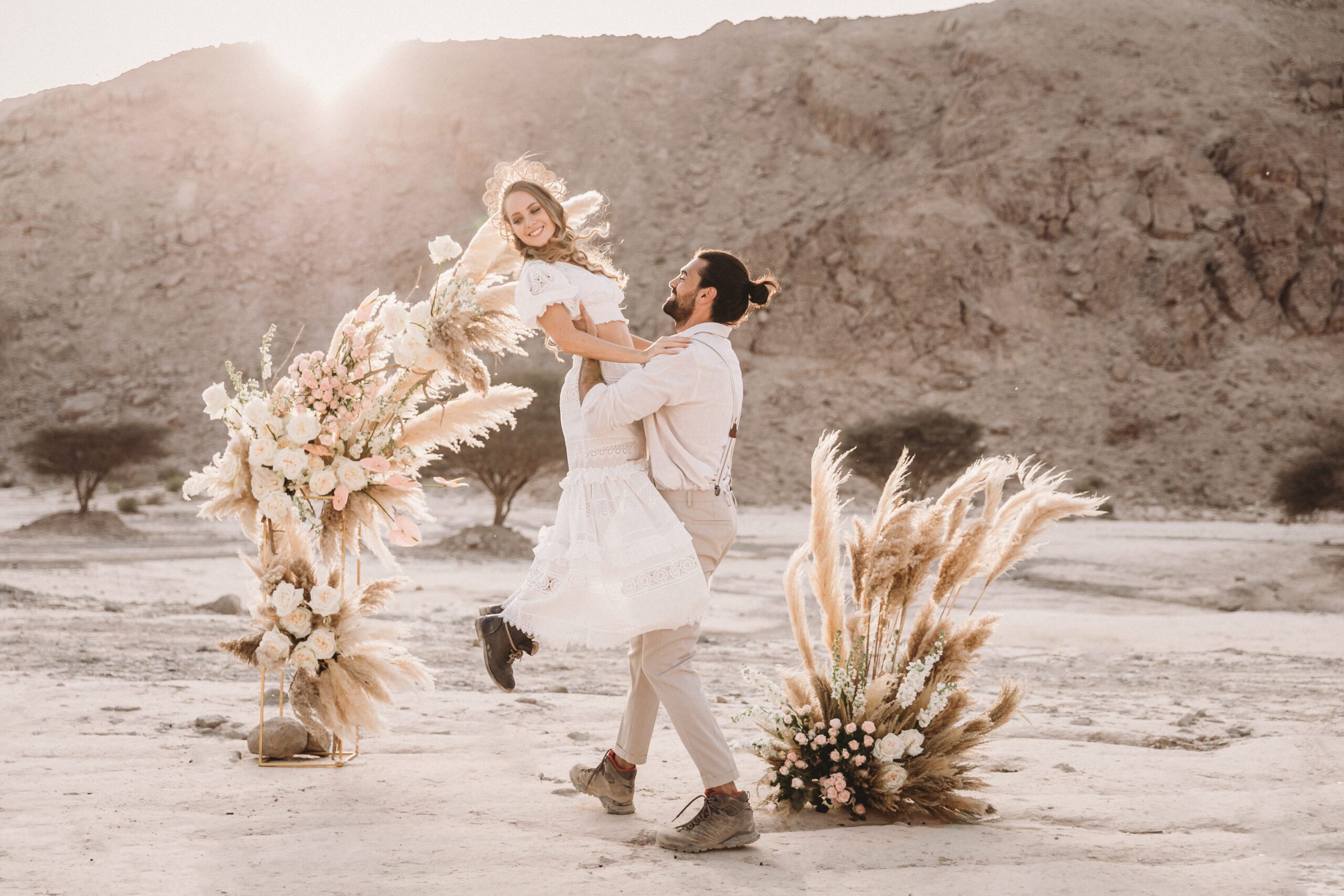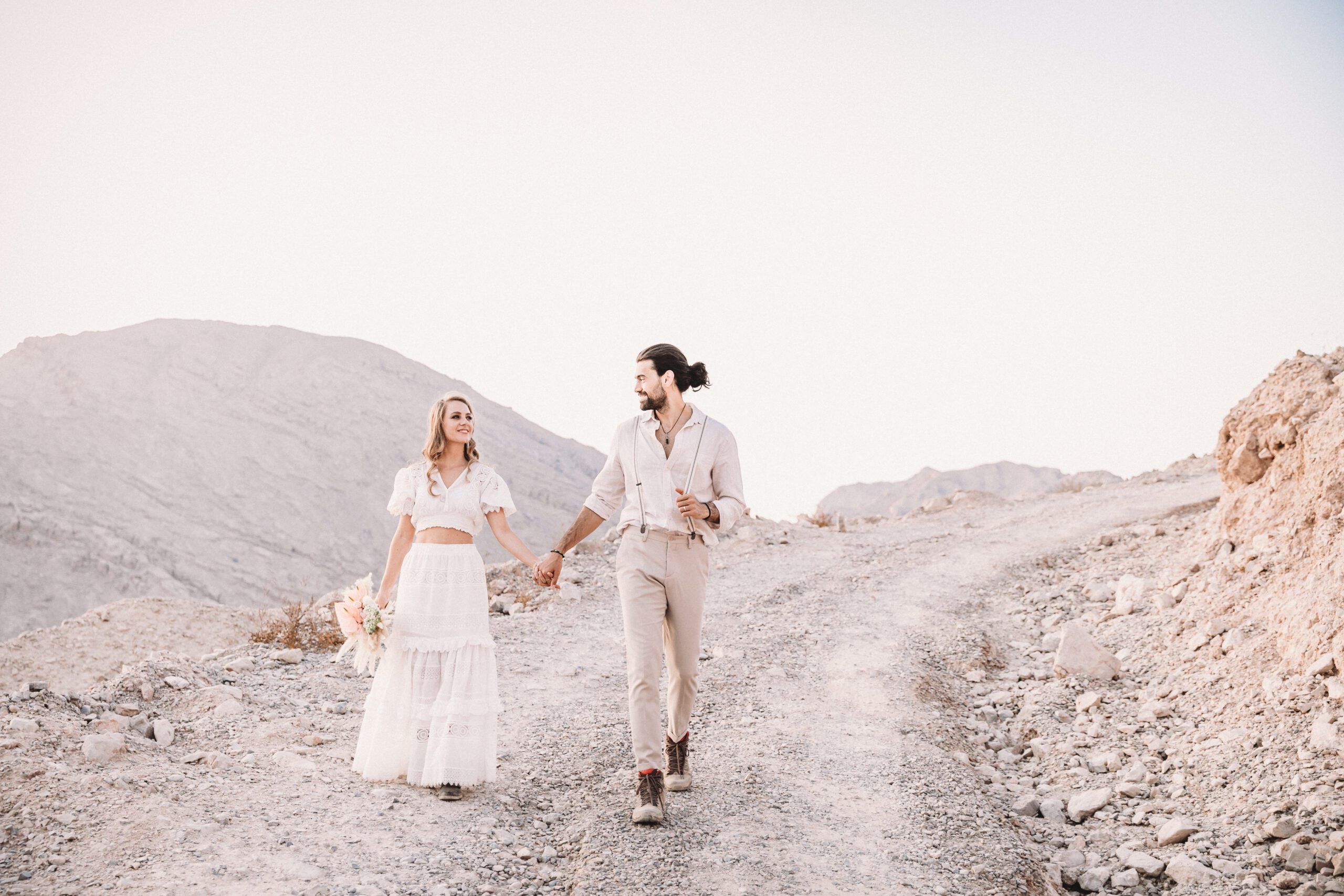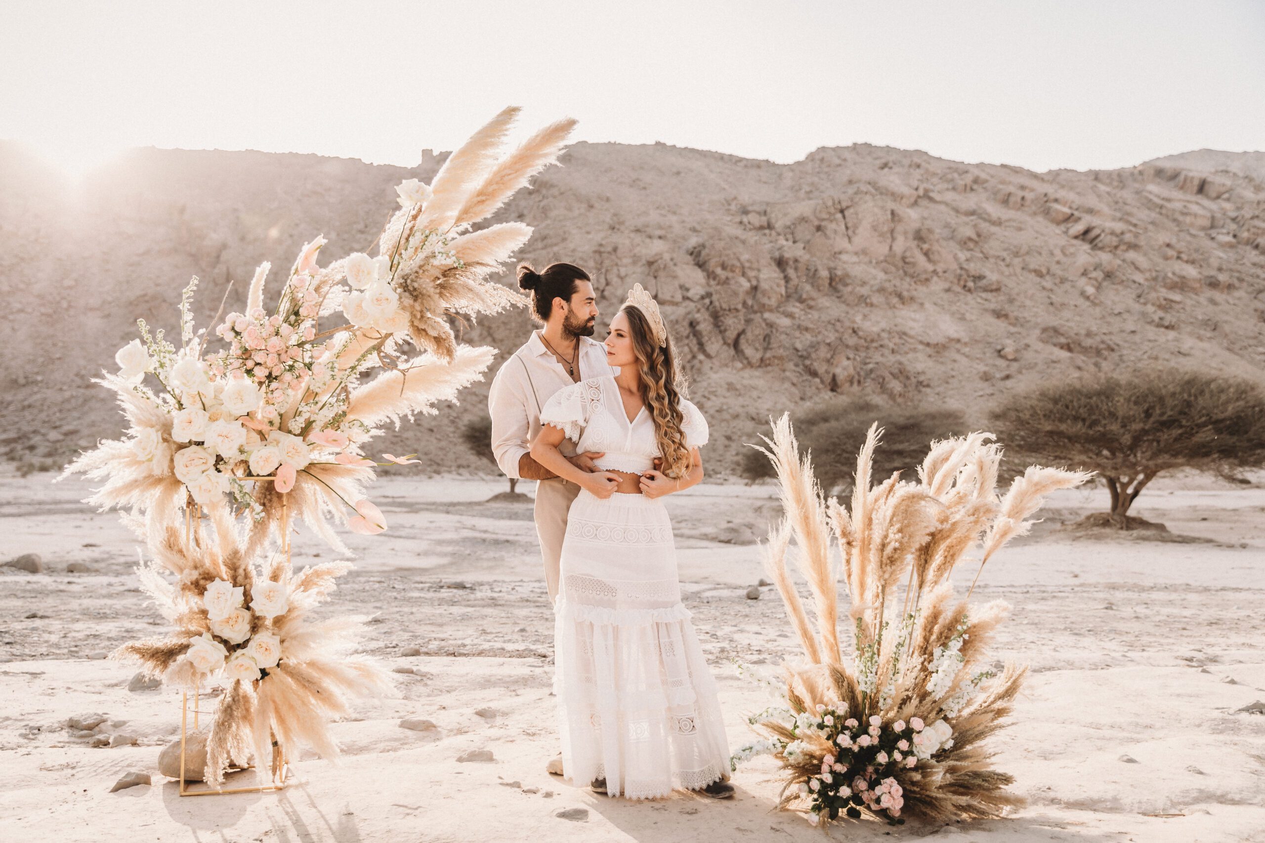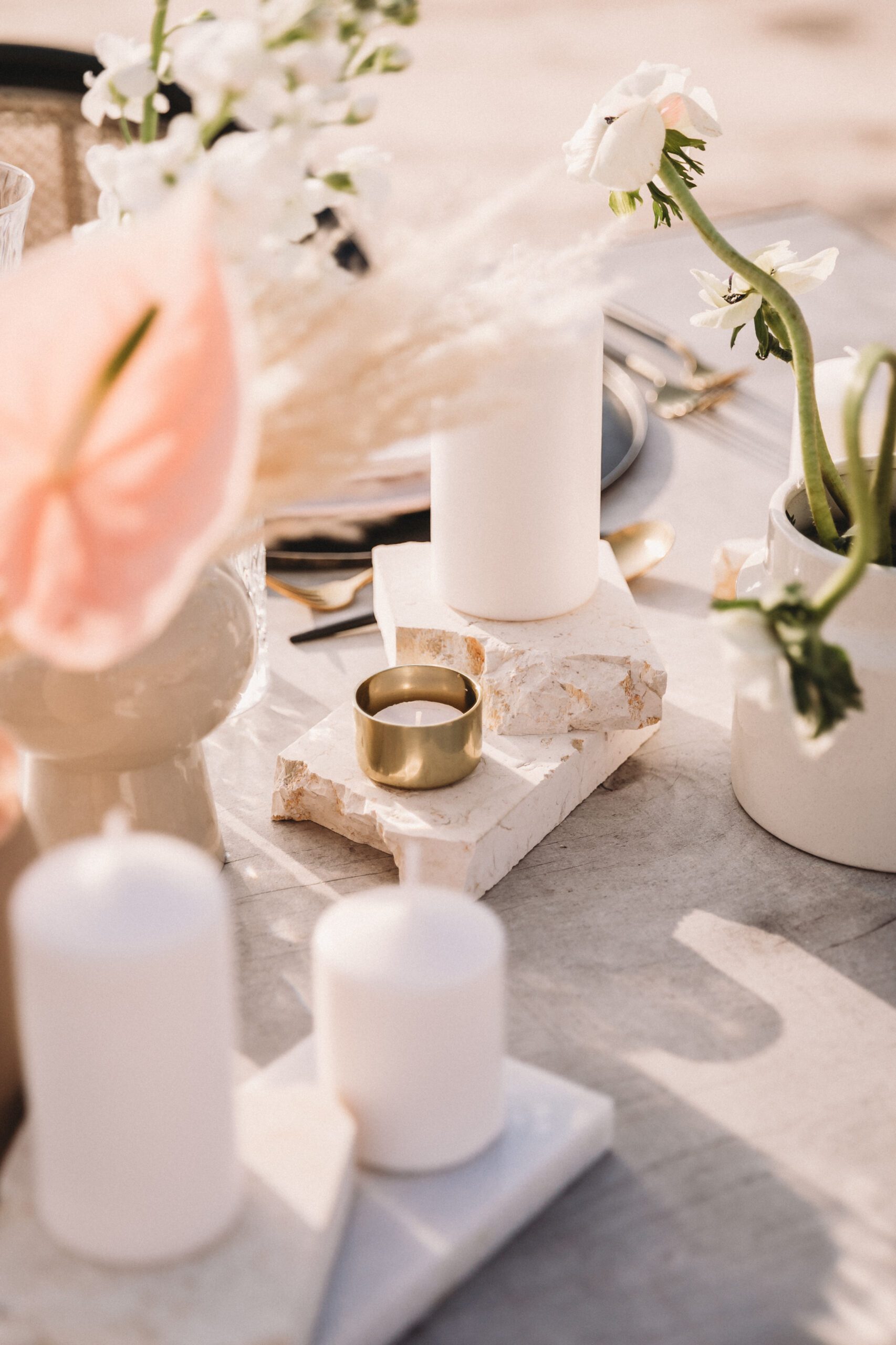 An intimate elopement set against the stunning mountain terrain at the base of Jebel Jais, featuring a minimal yet boho-inspired table décor in pink, white, and black. The design incorporated raw materials like marble slabs for the floral arrangements, metal showplates, and a concrete table, blending natural textures with elegant simplicity for a uniquely stylish celebration.