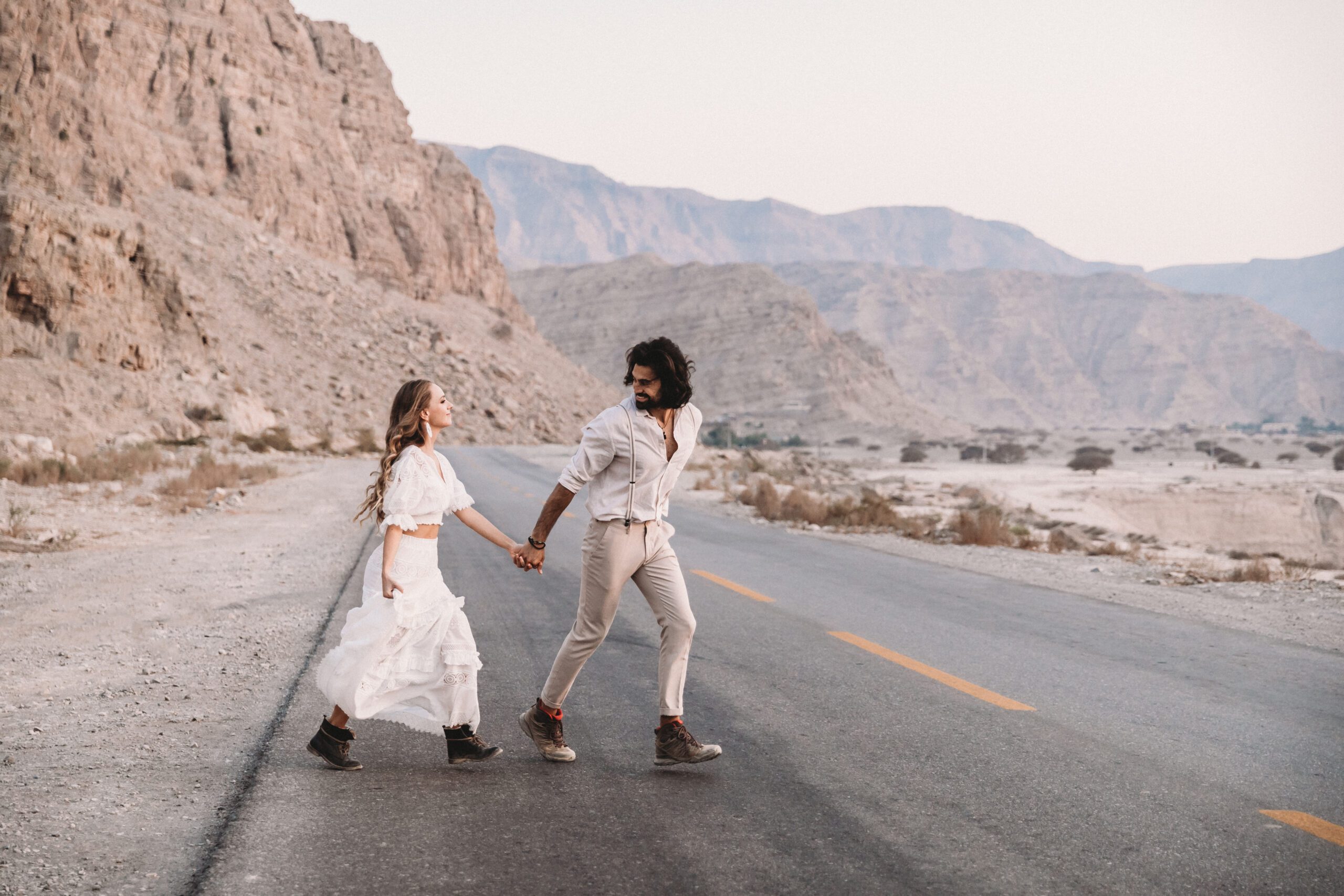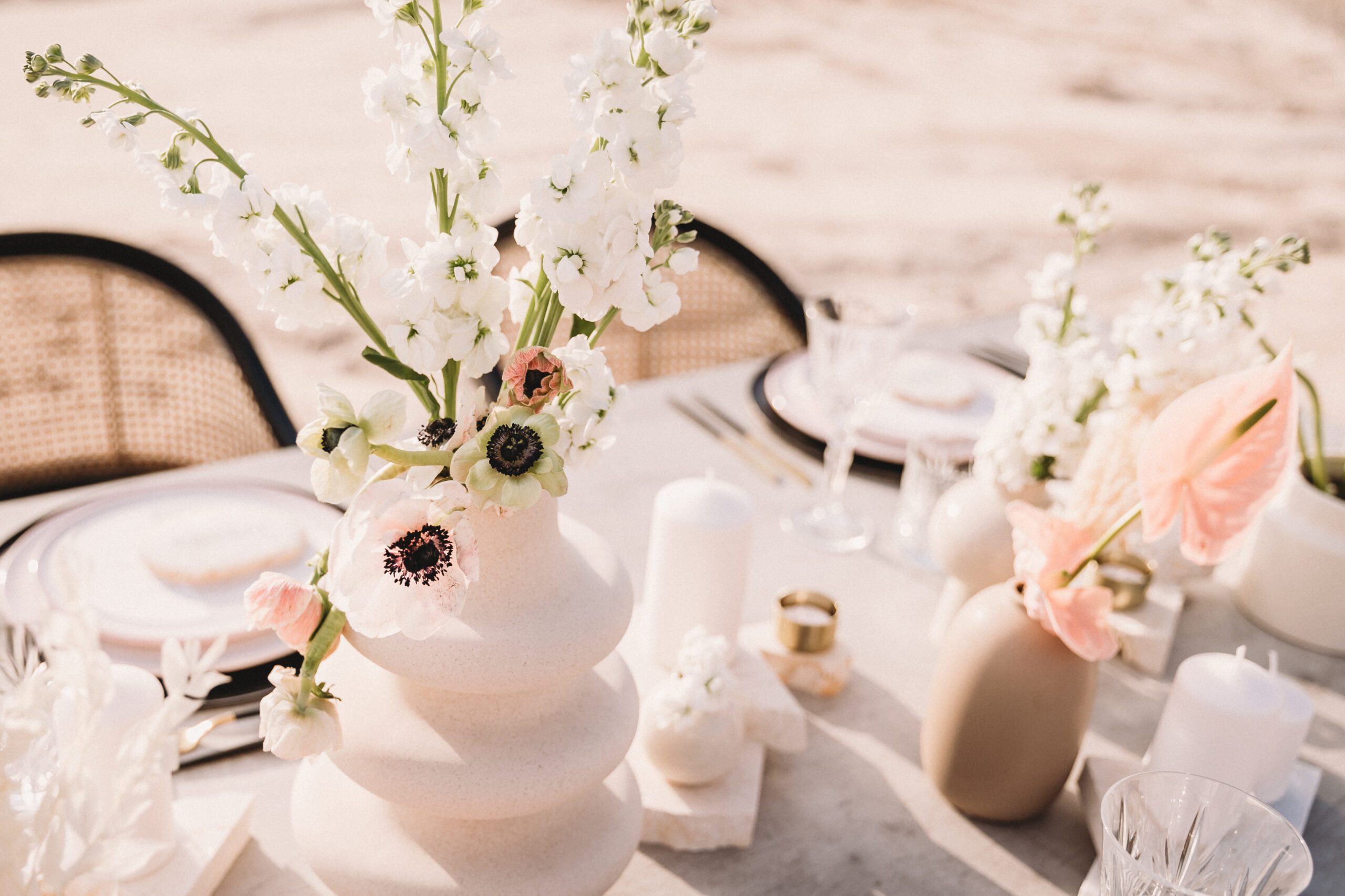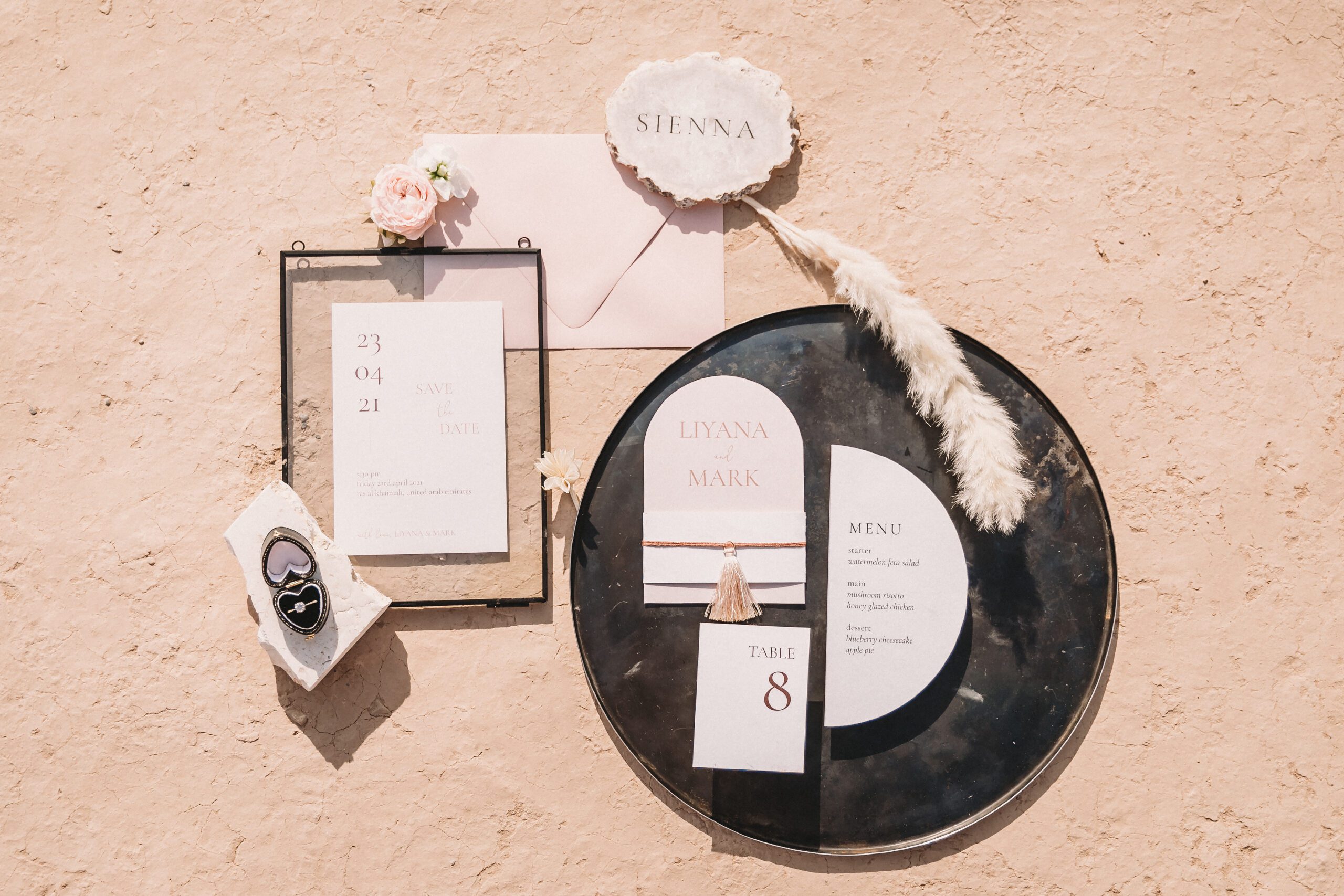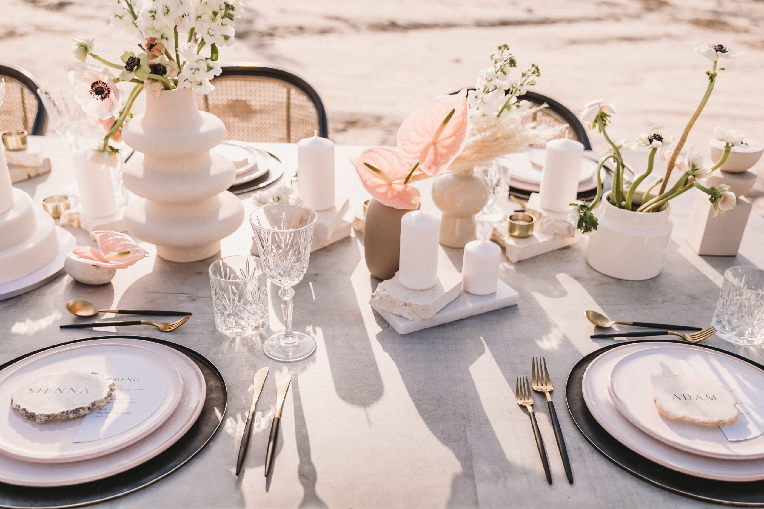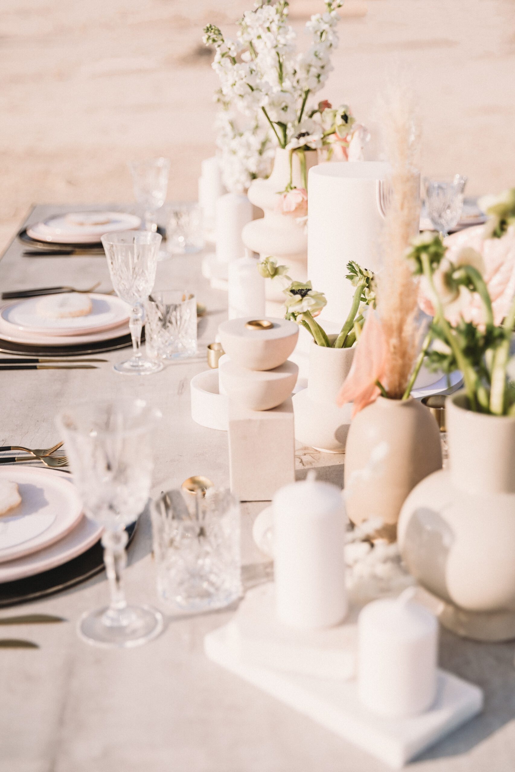 An intimate elopement set against the stunning mountain terrain at the base of Jebel Jais, featuring a minimal yet boho-inspired table décor in pink, white, and black. The design incorporated raw materials like marble slabs for the floral arrangements, metal showplates, and a concrete table, blending natural textures with elegant simplicity for a uniquely stylish celebration.