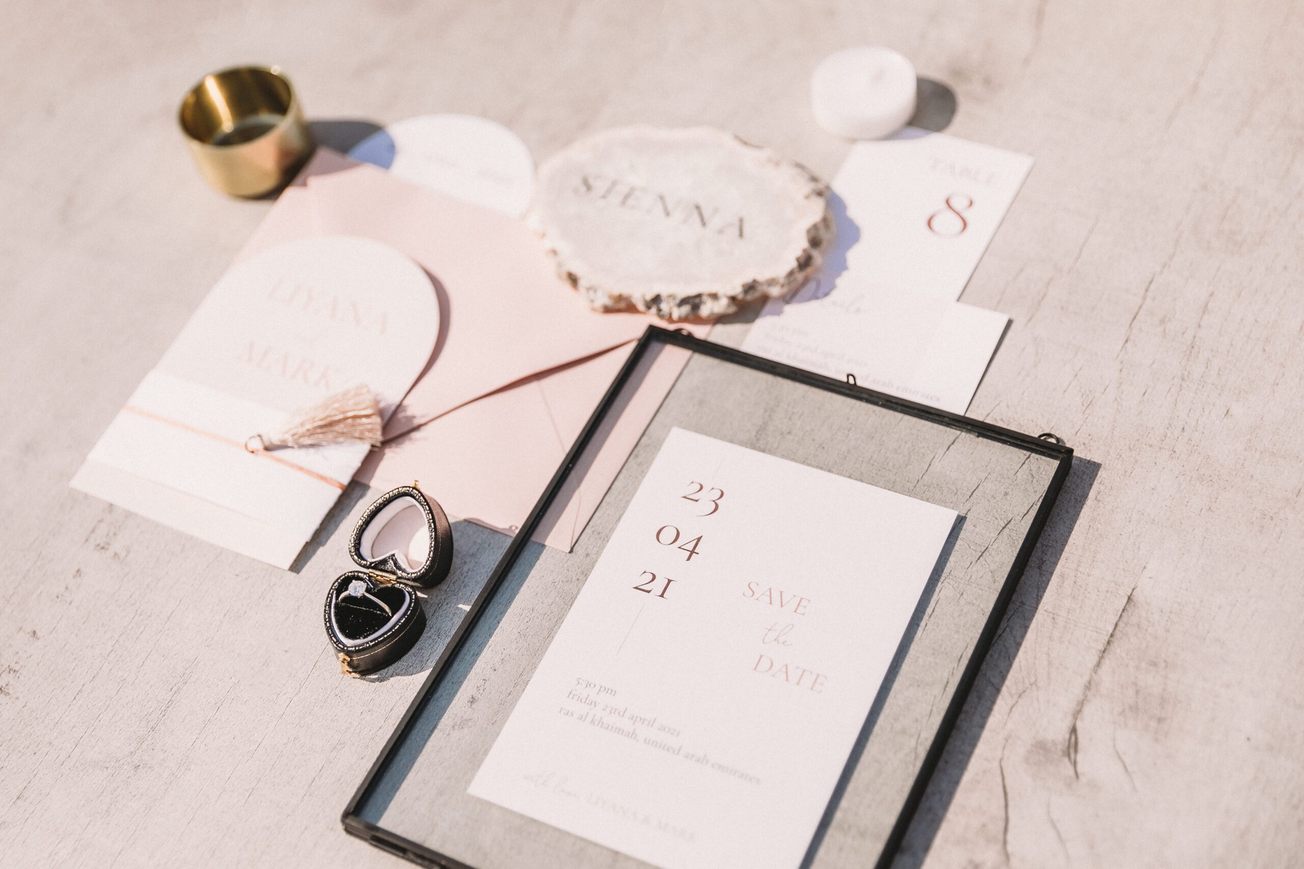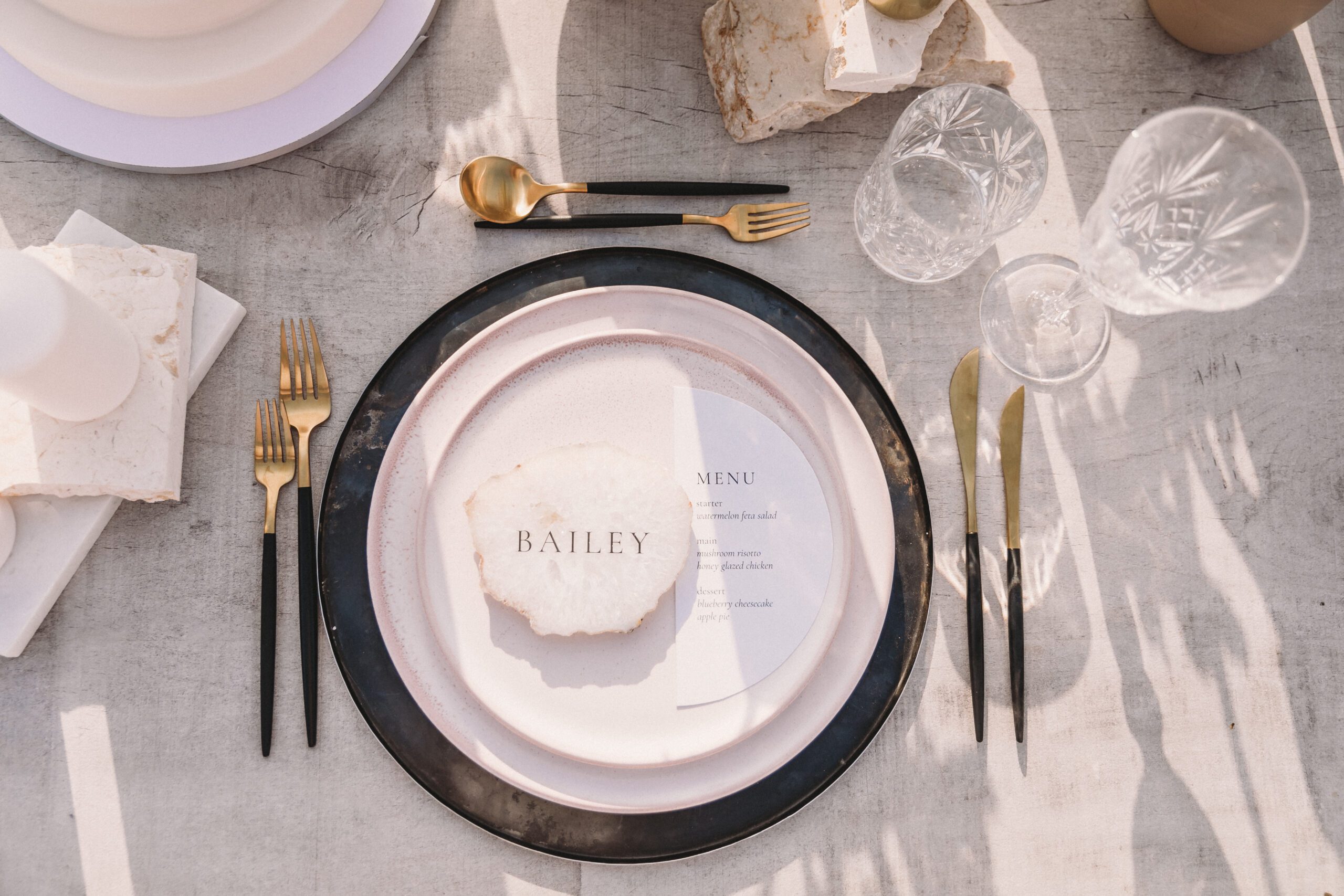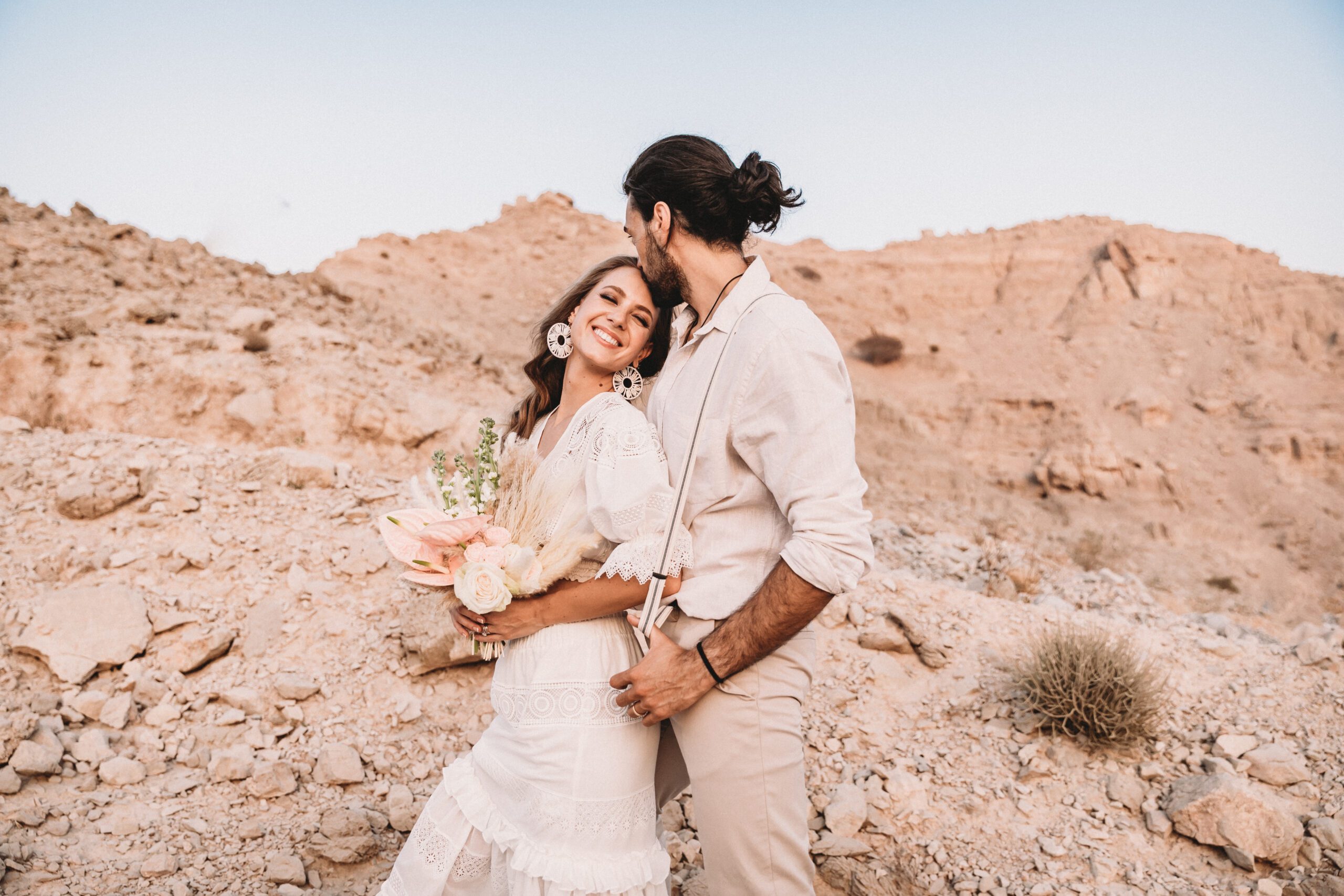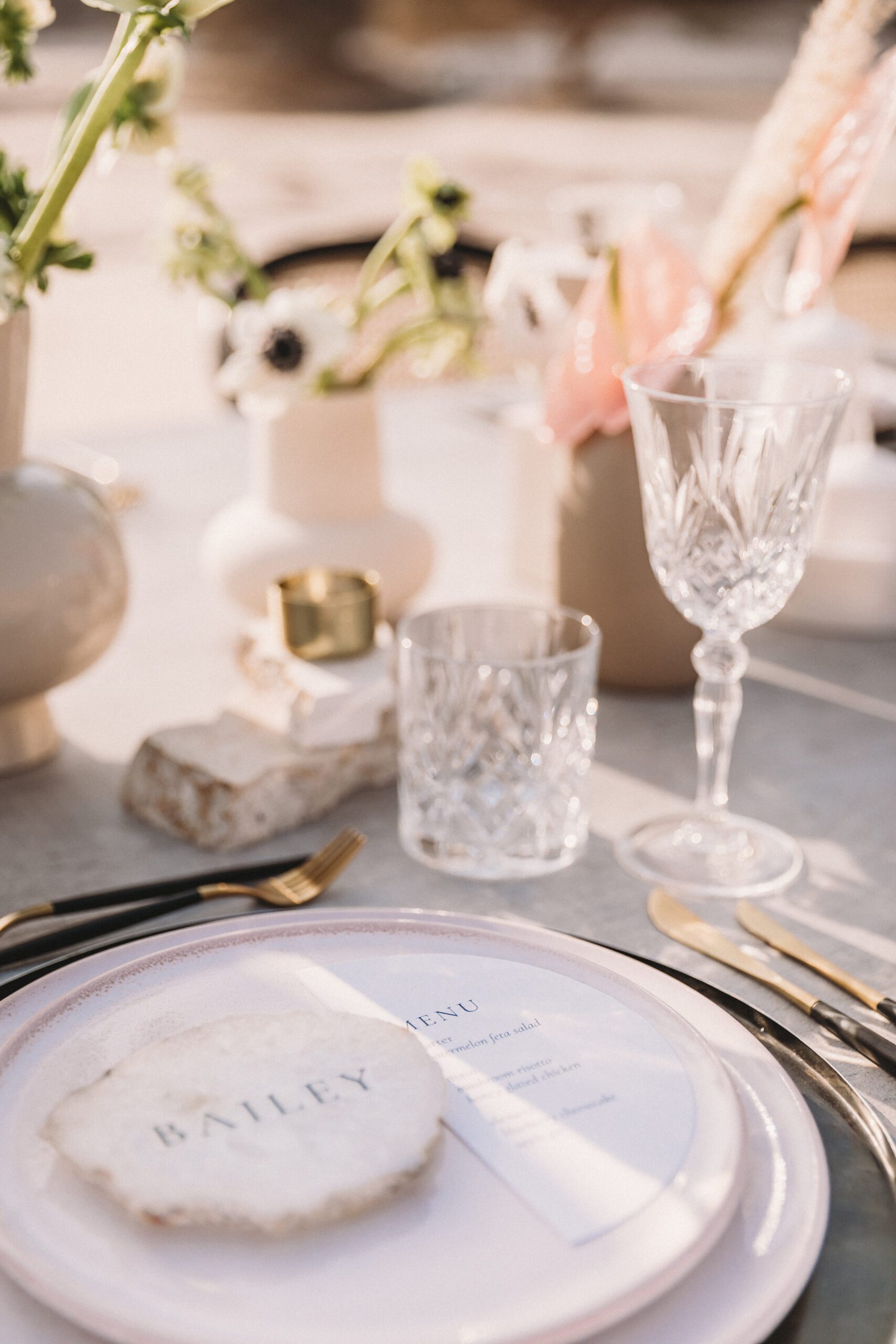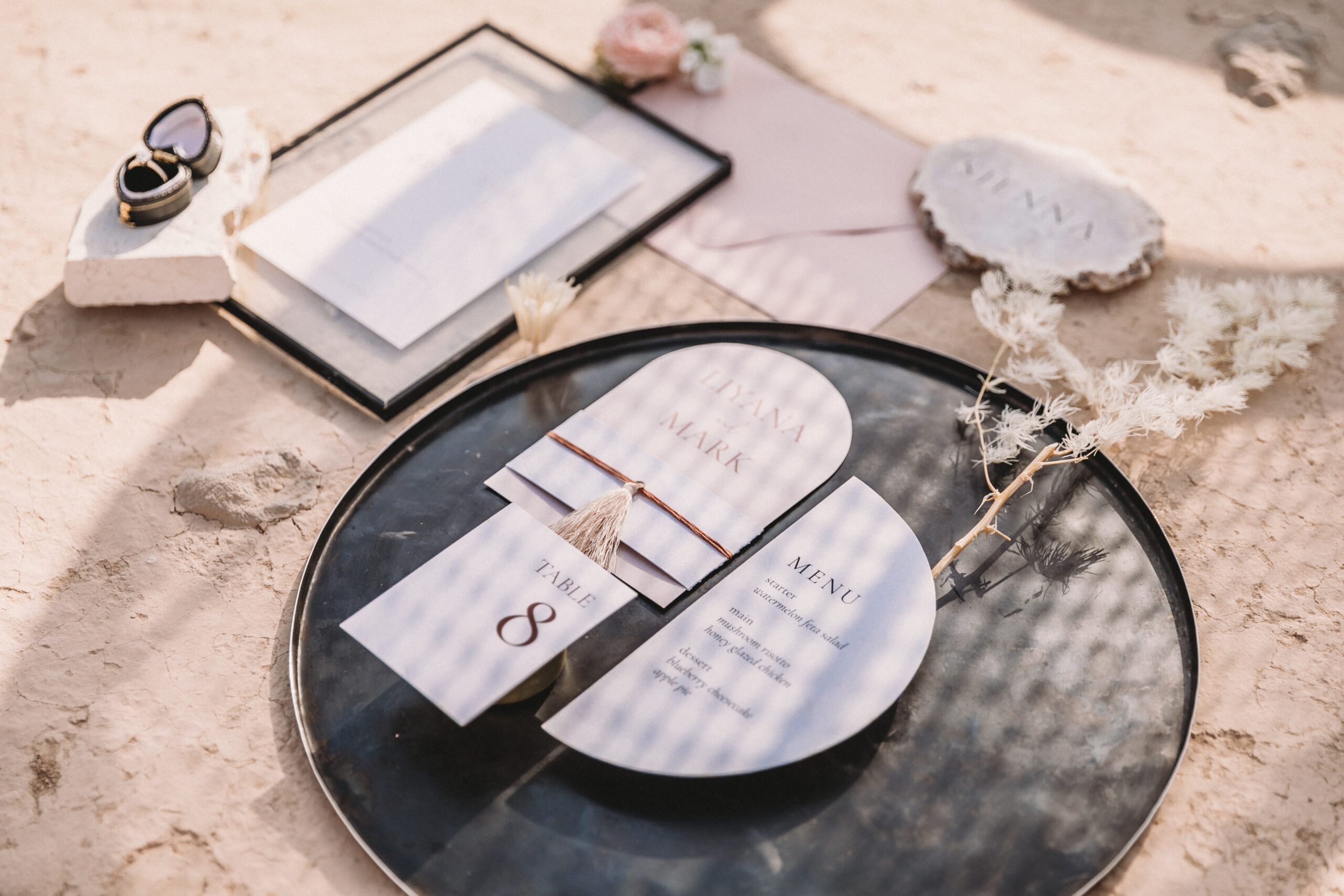An intimate elopement set against the stunning mountain terrain at the base of Jebel Jais, featuring a minimal yet boho-inspired table décor in pink, white, and black. The design incorporated raw materials like marble slabs for the floral arrangements, metal showplates, and a concrete table, blending natural textures with elegant simplicity for a uniquely stylish celebration.