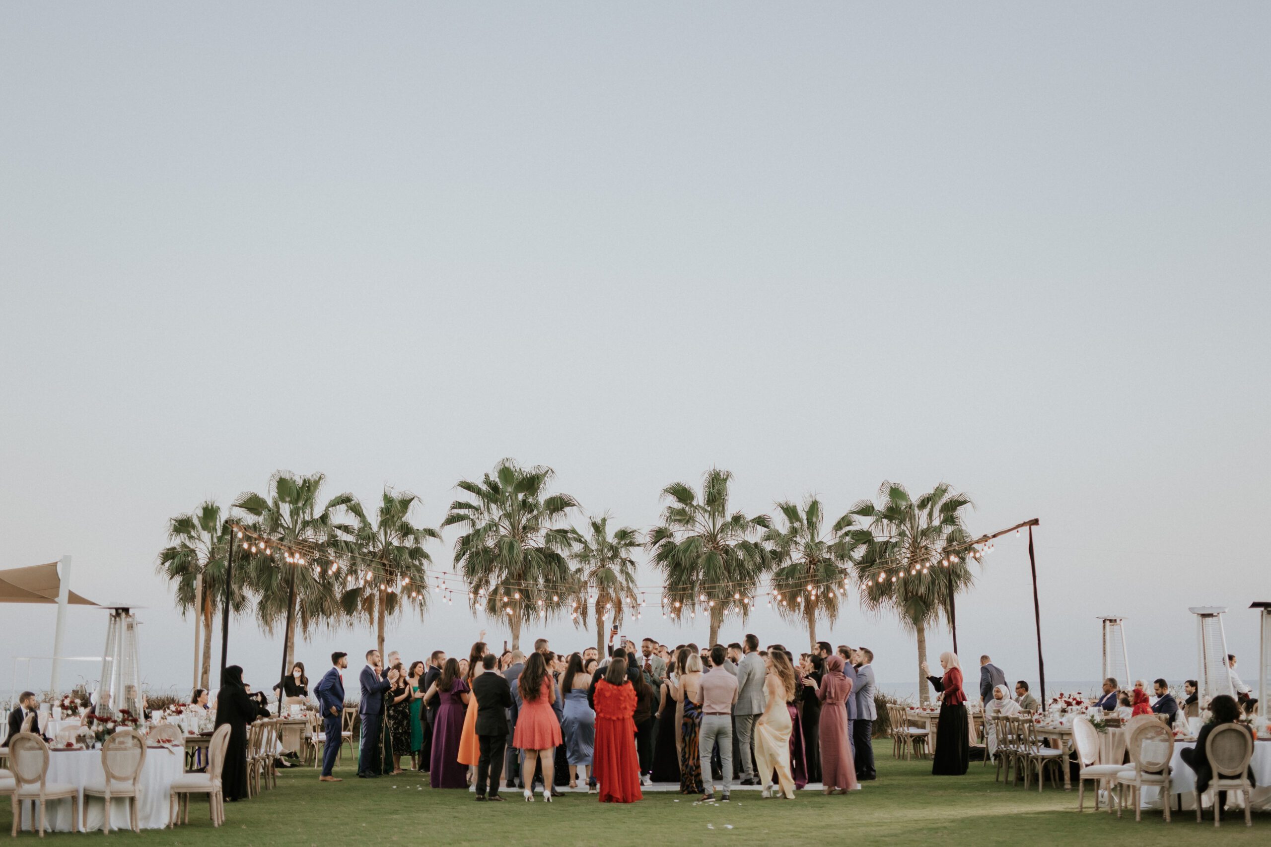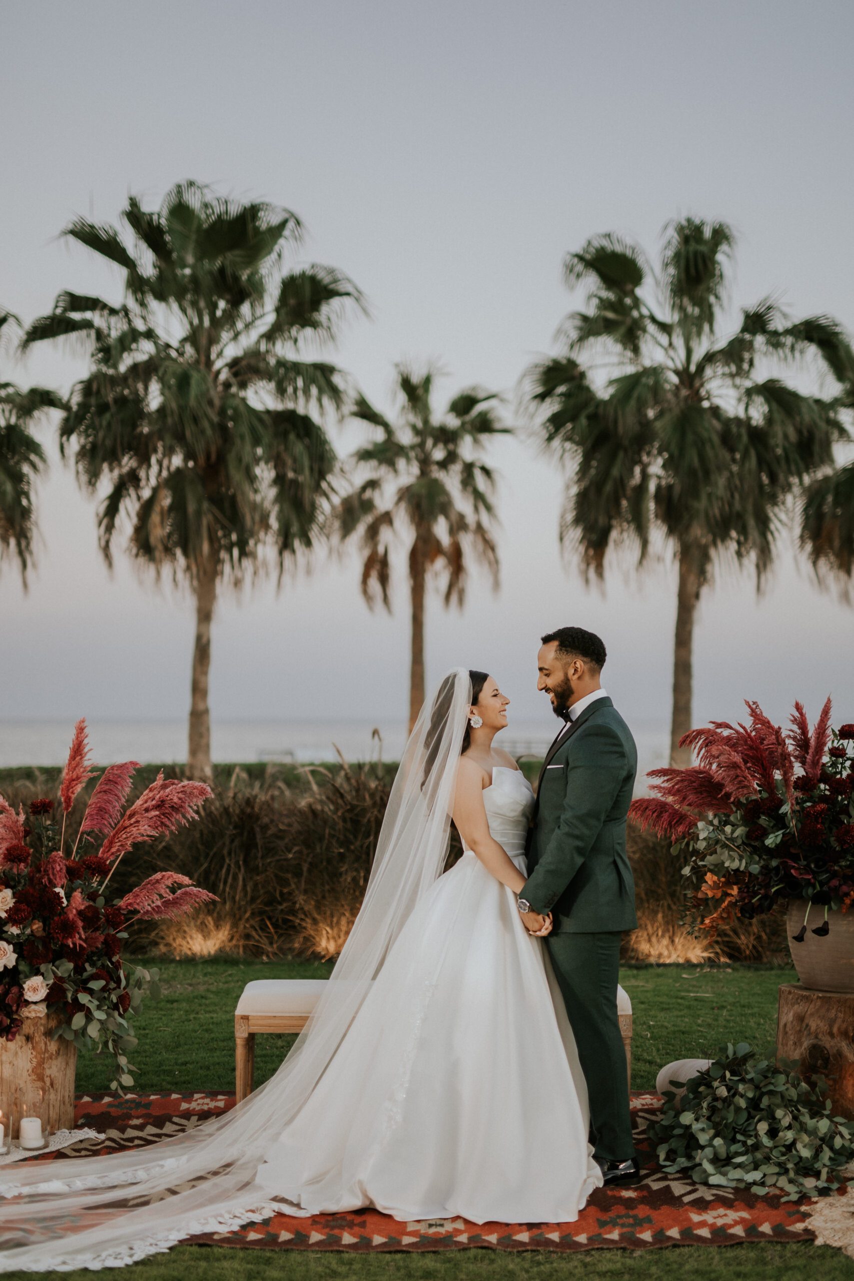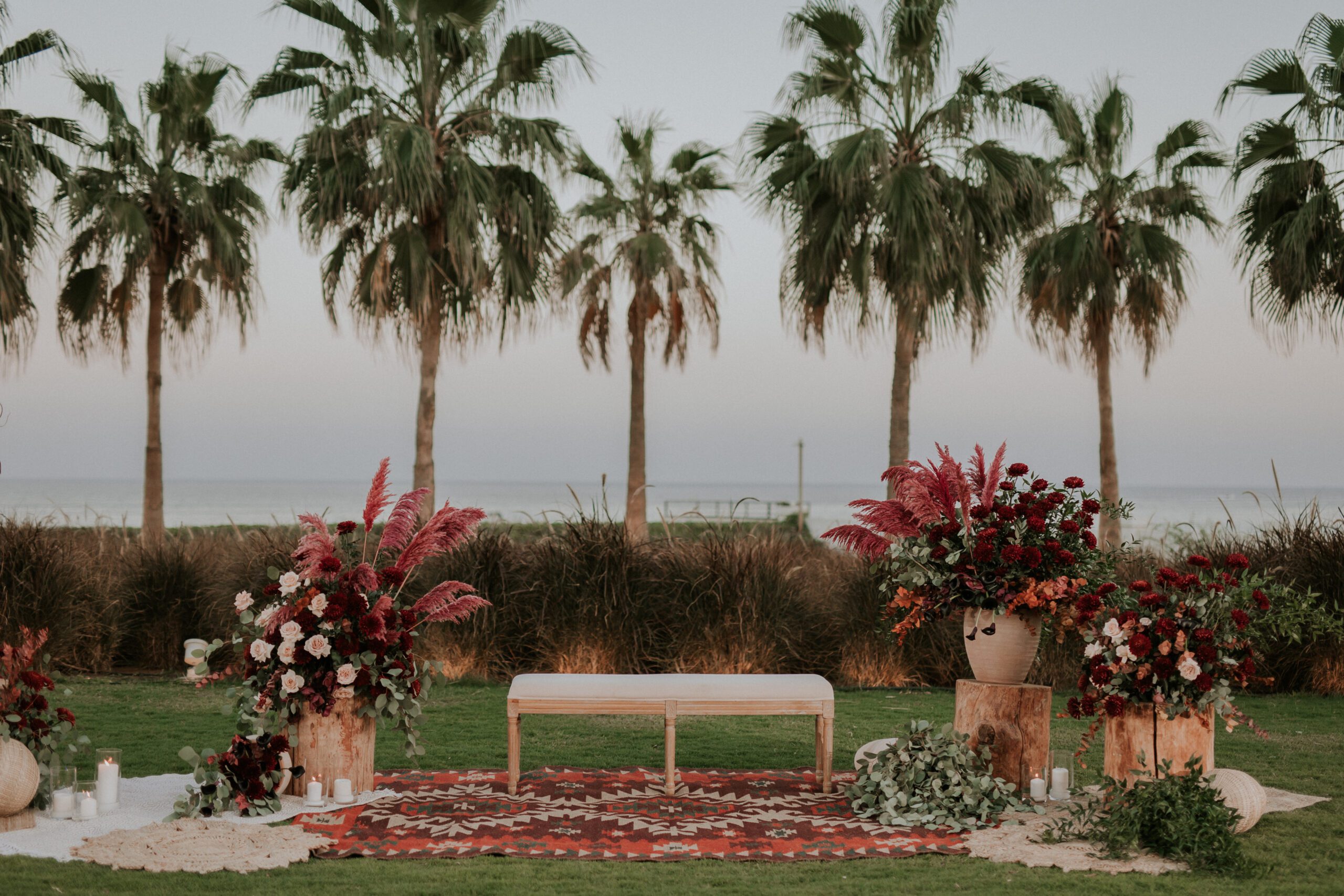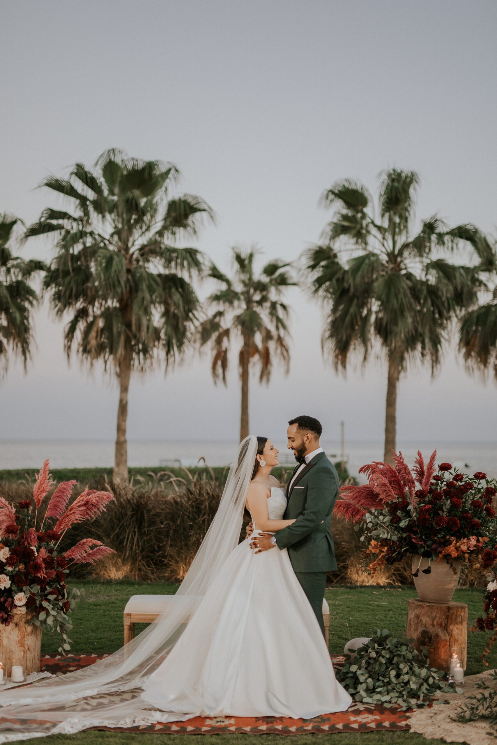 A beautiful Sudani-Algerian wedding that seamlessly blended both cultures and traditions. Set by the beach in Fujairah, the intimate celebration was surrounded by the soothing sound of waves and palm trees. Thoughtful details included clay vases paired with rich burgundy florals, honey jars as guest giveaways, and an array of delicious wedding cakes — a truly unique and heartfelt celebration.