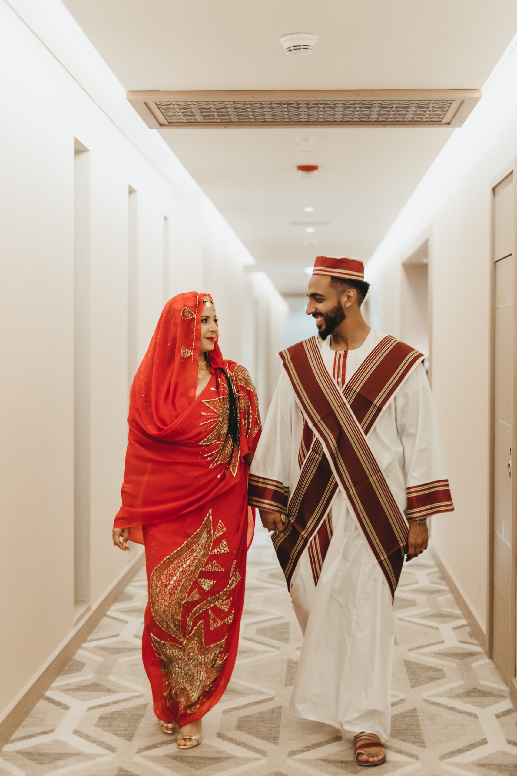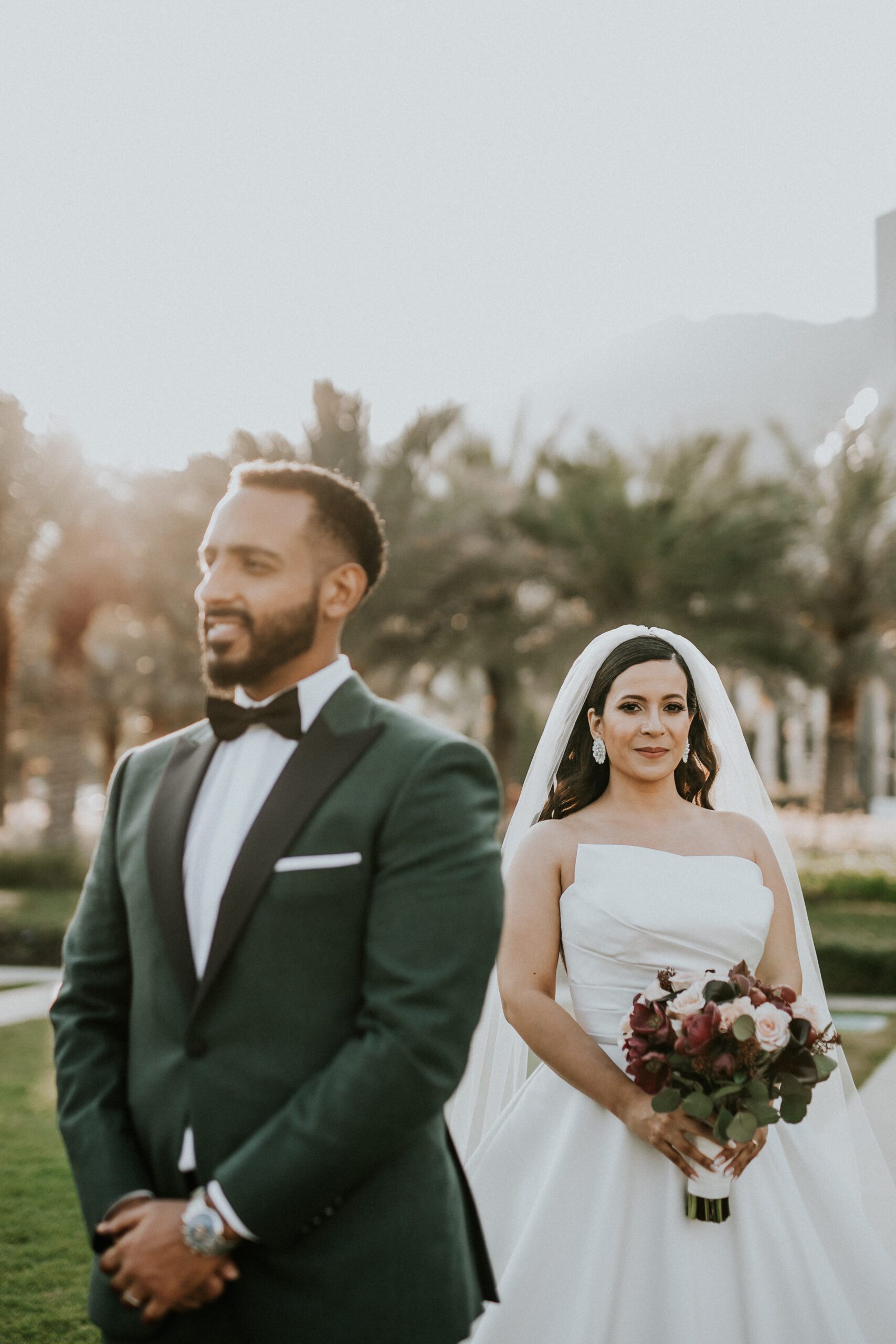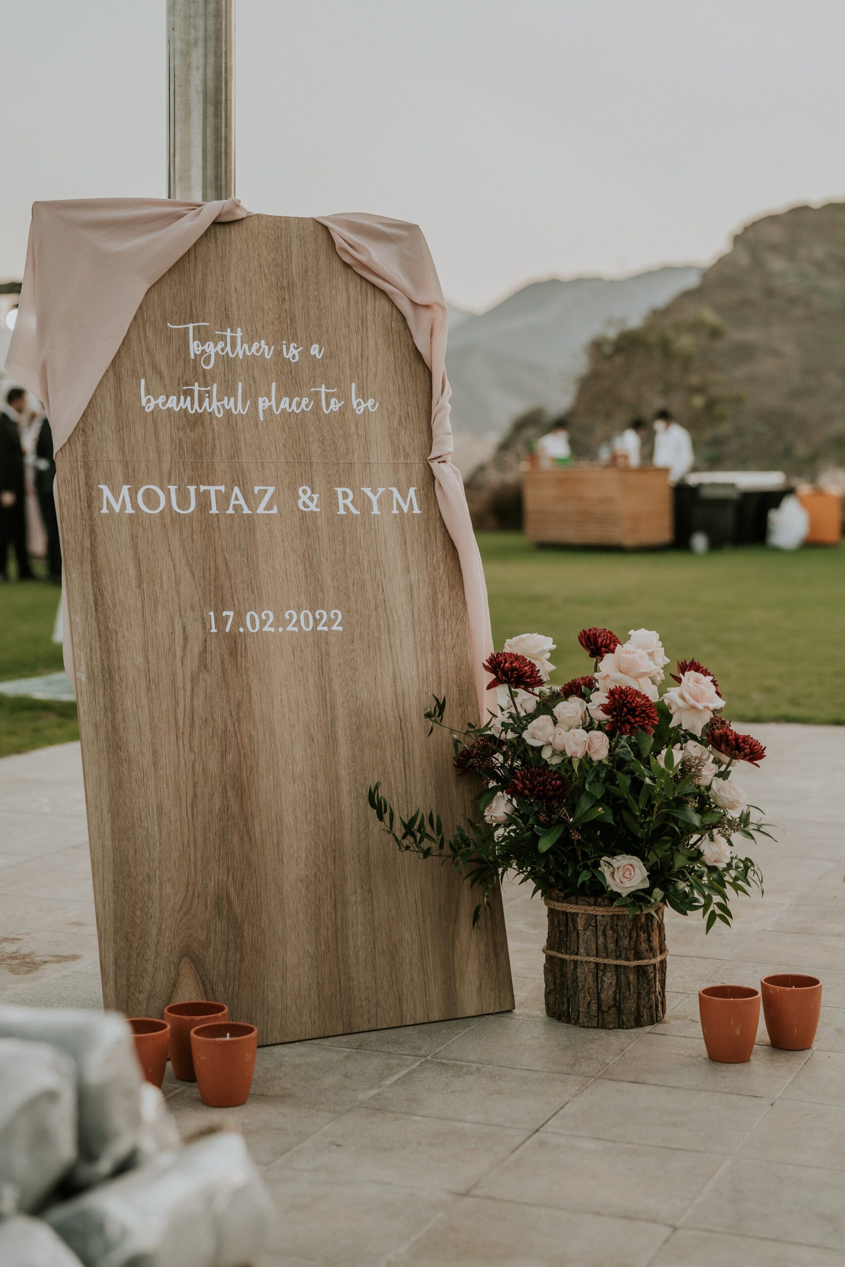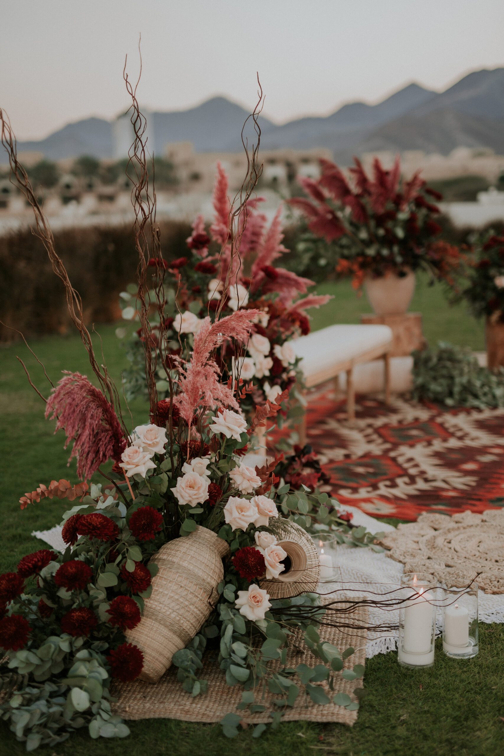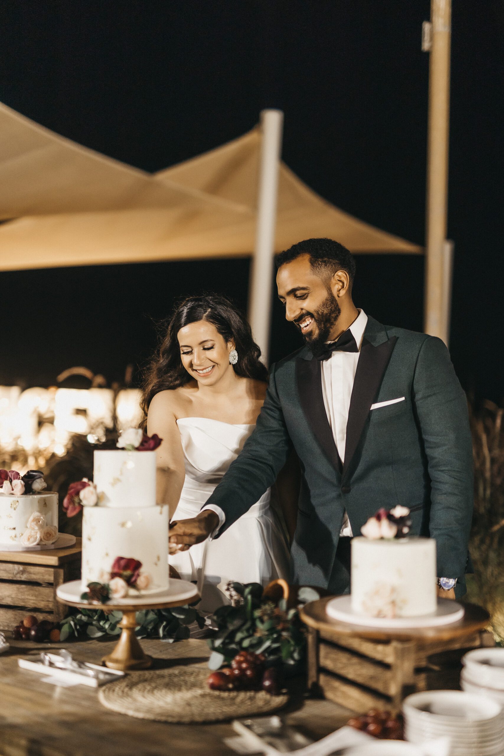 A beautiful Sudani-Algerian wedding that seamlessly blended both cultures and traditions. Set by the beach in Fujairah, the intimate celebration was surrounded by the soothing sound of waves and palm trees. Thoughtful details included clay vases paired with rich burgundy florals, honey jars as guest giveaways, and an array of delicious wedding cakes — a truly unique and heartfelt celebration.