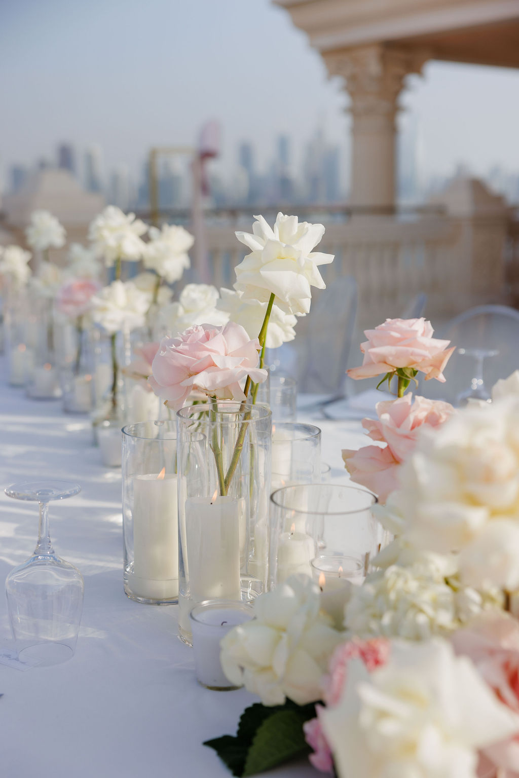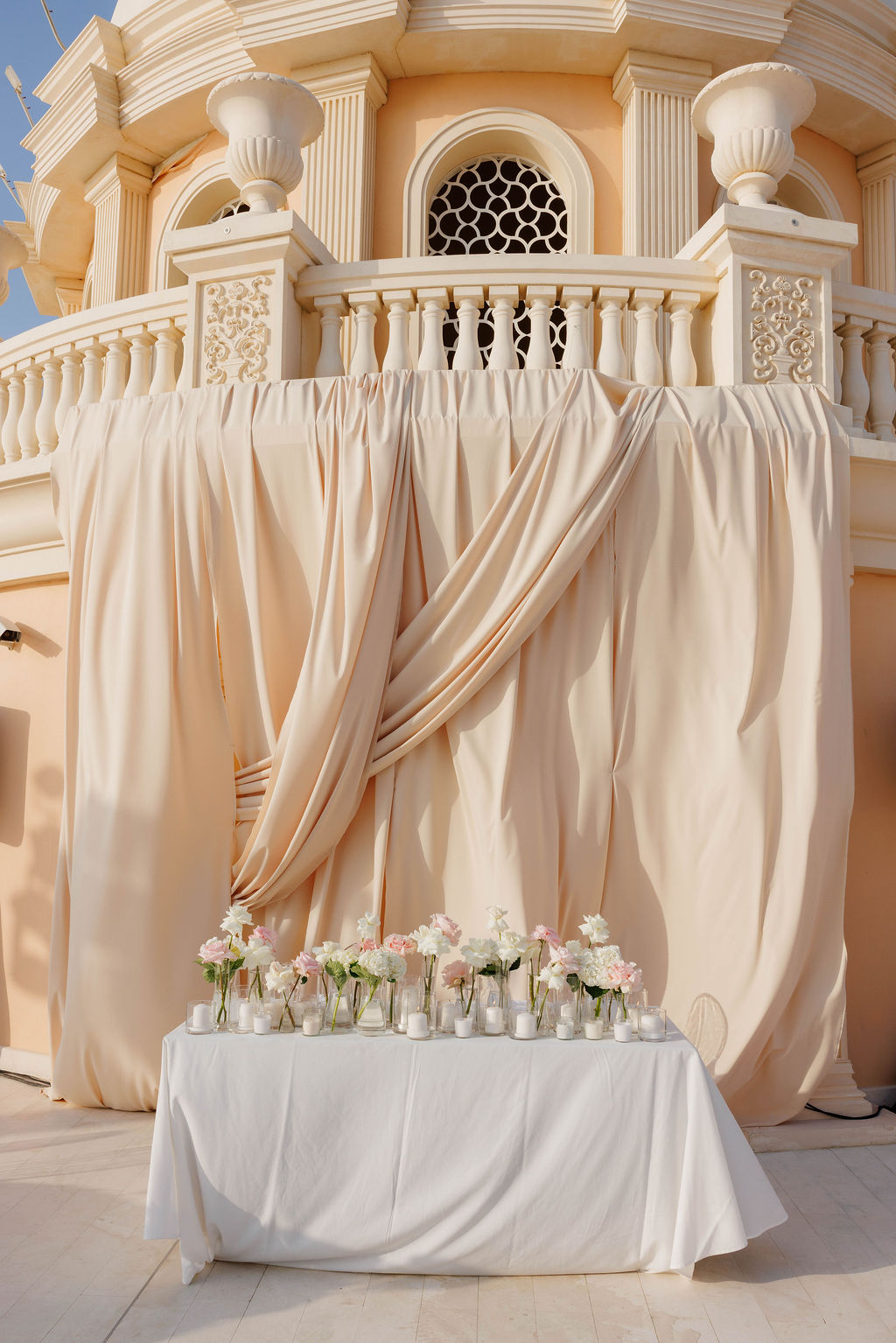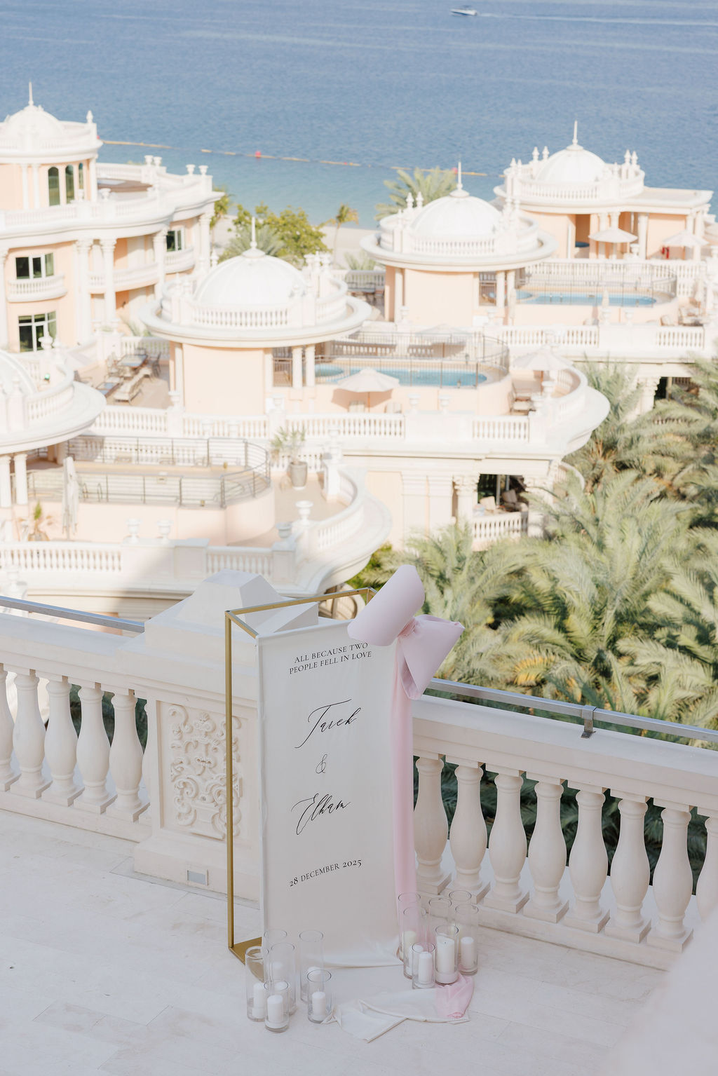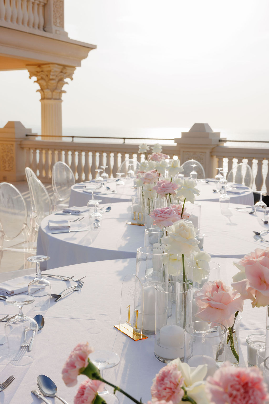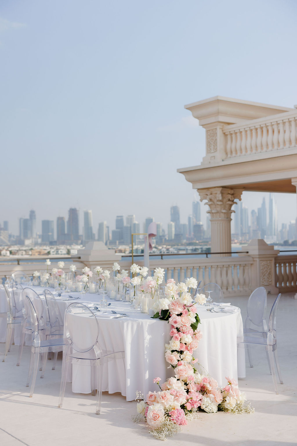 Under the soft glow of a Dubai sunset, guests gathered on a secluded white terrace at the Raffles, The Palm, that felt as though it were floating between the sky and the sea. With the ocean stretching out in every direction, the atmosphere was one of quiet, timeless luxury. We went for a vintage minimal look, blending crisp whites with just a hint of soft pink to keep things effortless and romantic with lines of shimmering candles. It was the perfect mix of timeless elegance and that breezy, coastal magic