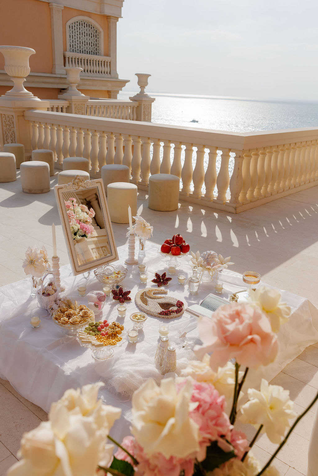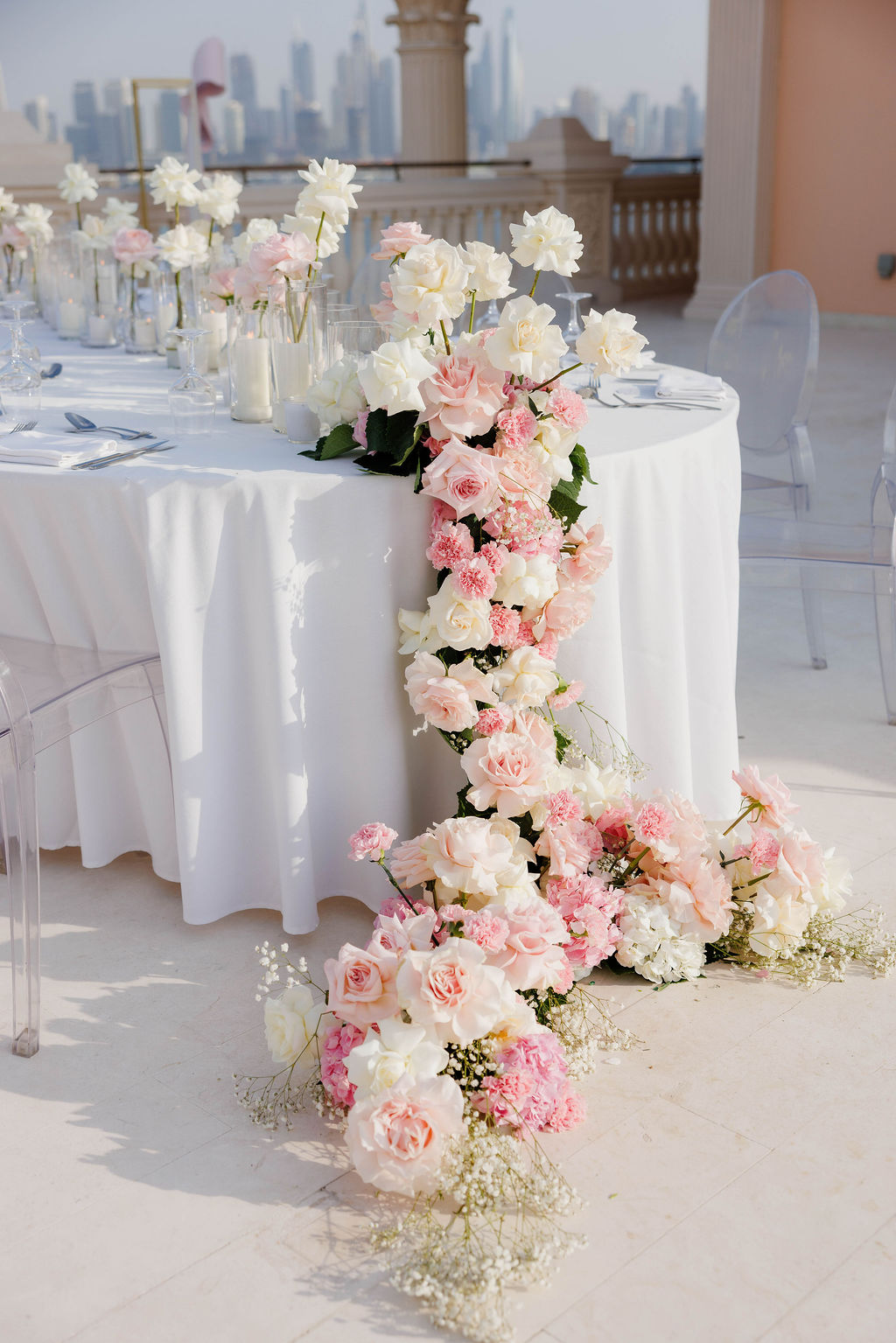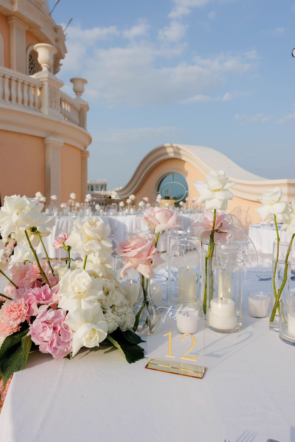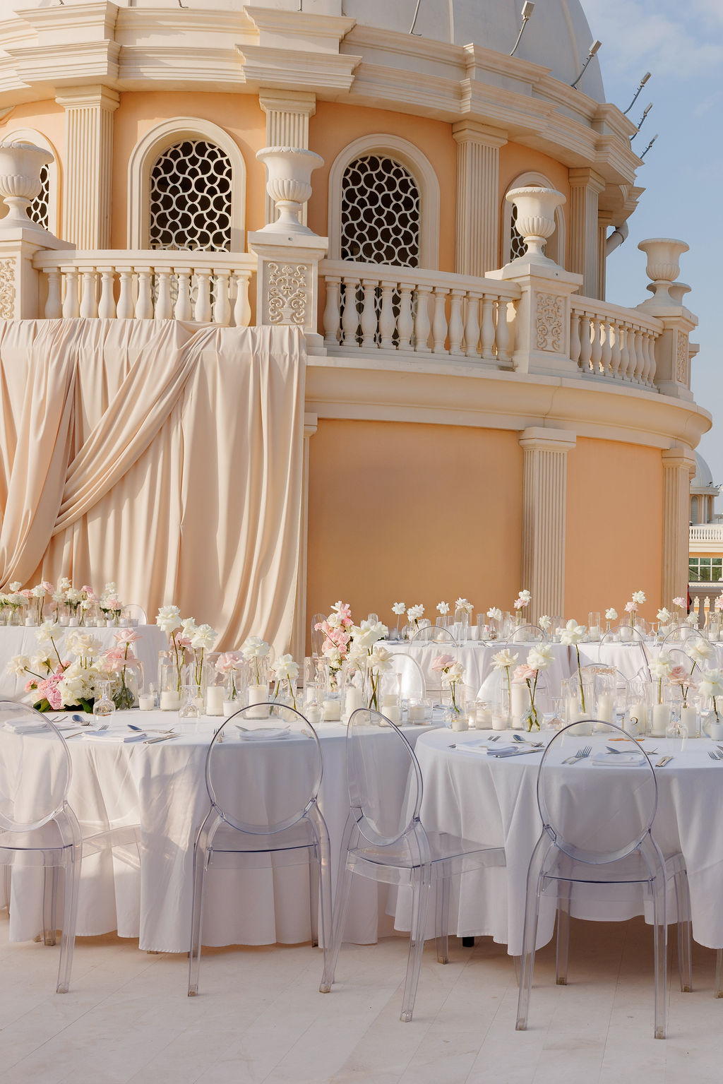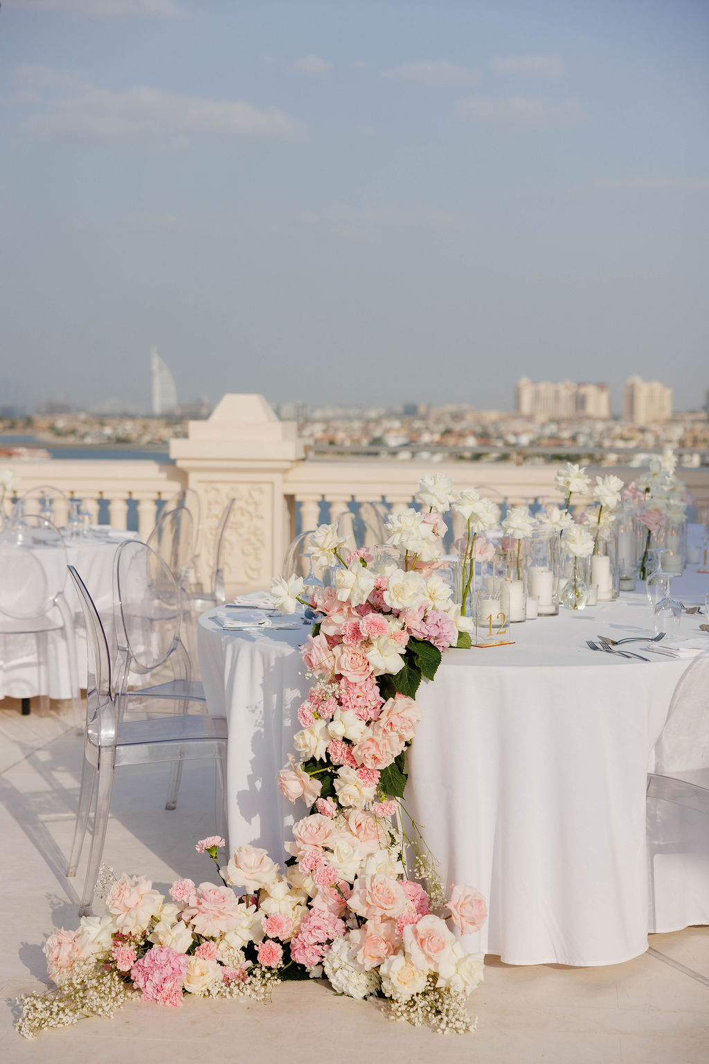 Under the soft glow of a Dubai sunset, guests gathered on a secluded white terrace at the Raffles, The Palm, that felt as though it were floating between the sky and the sea. With the ocean stretching out in every direction, the atmosphere was one of quiet, timeless luxury. We went for a vintage minimal look, blending crisp whites with just a hint of soft pink to keep things effortless and romantic with lines of shimmering candles. It was the perfect mix of timeless elegance and that breezy, coastal magic