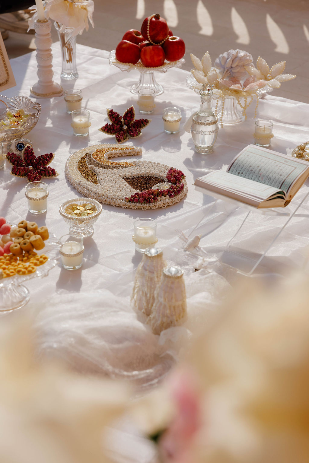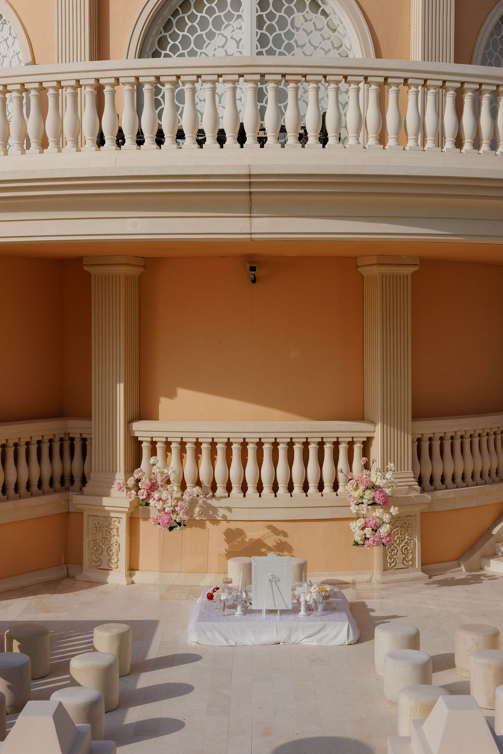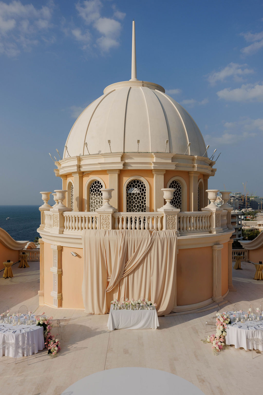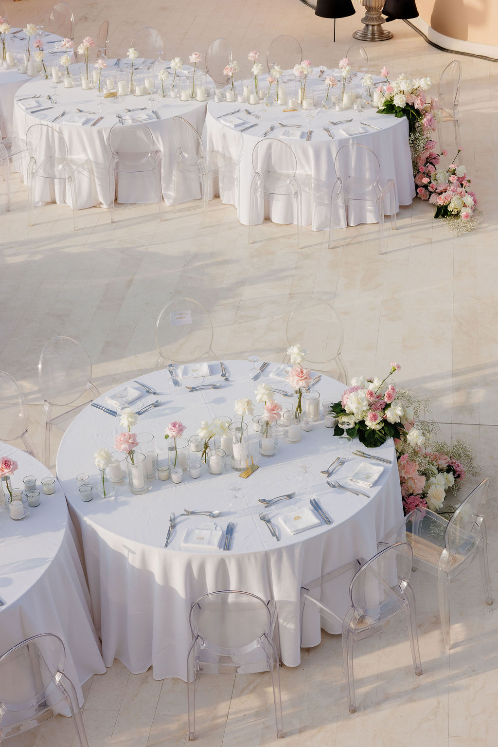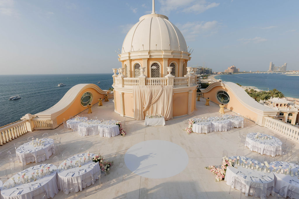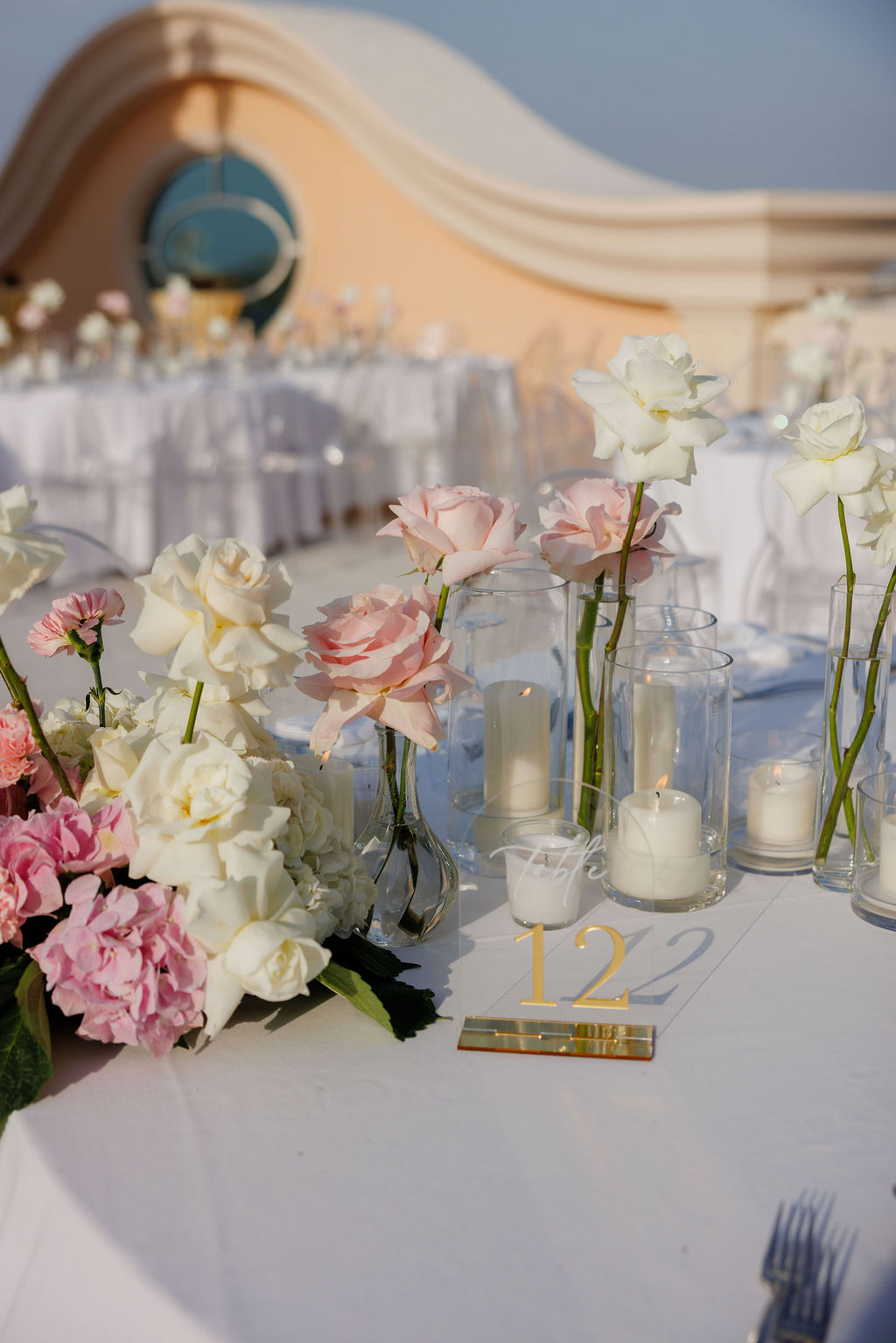 Under the soft glow of a Dubai sunset, guests gathered on a secluded white terrace at the Raffles, The Palm, that felt as though it were floating between the sky and the sea. With the ocean stretching out in every direction, the atmosphere was one of quiet, timeless luxury. We went for a vintage minimal look, blending crisp whites with just a hint of soft pink to keep things effortless and romantic with lines of shimmering candles. It was the perfect mix of timeless elegance and that breezy, coastal magic