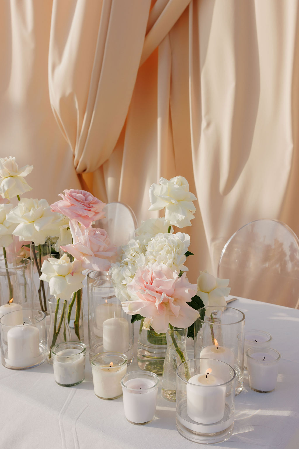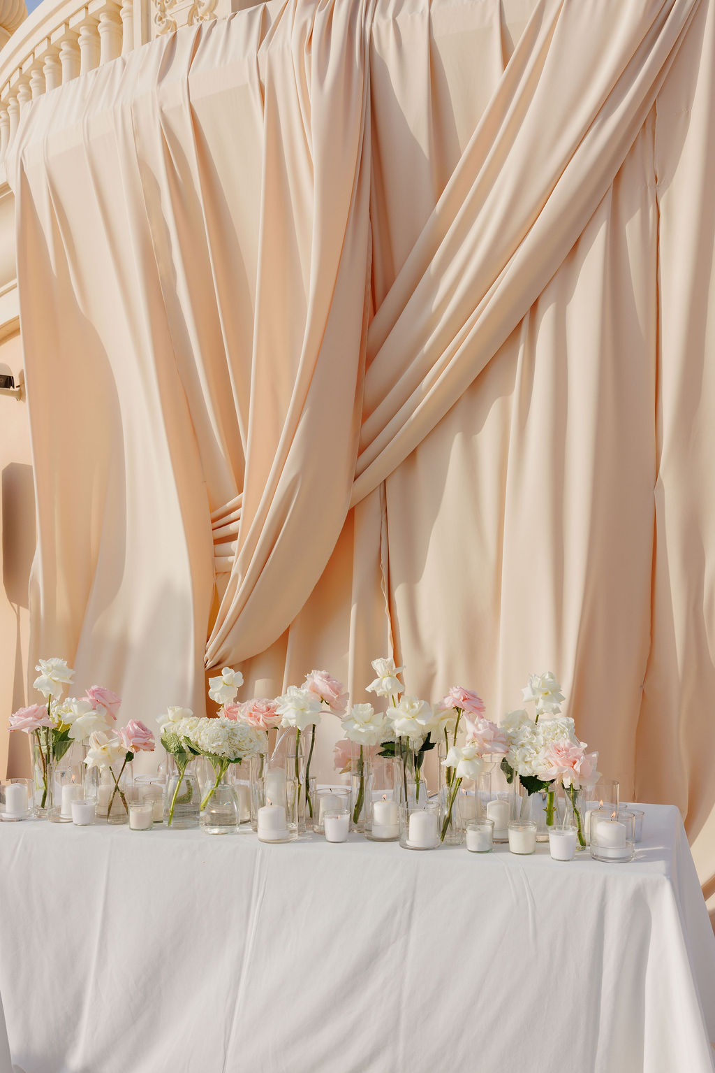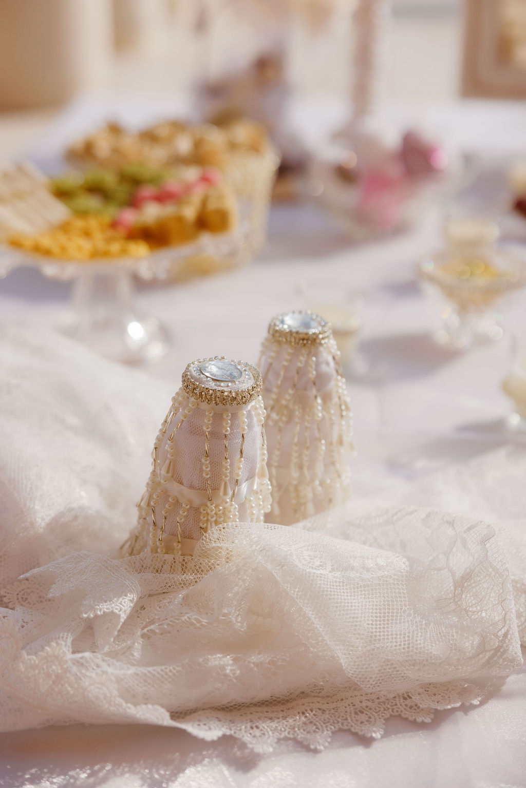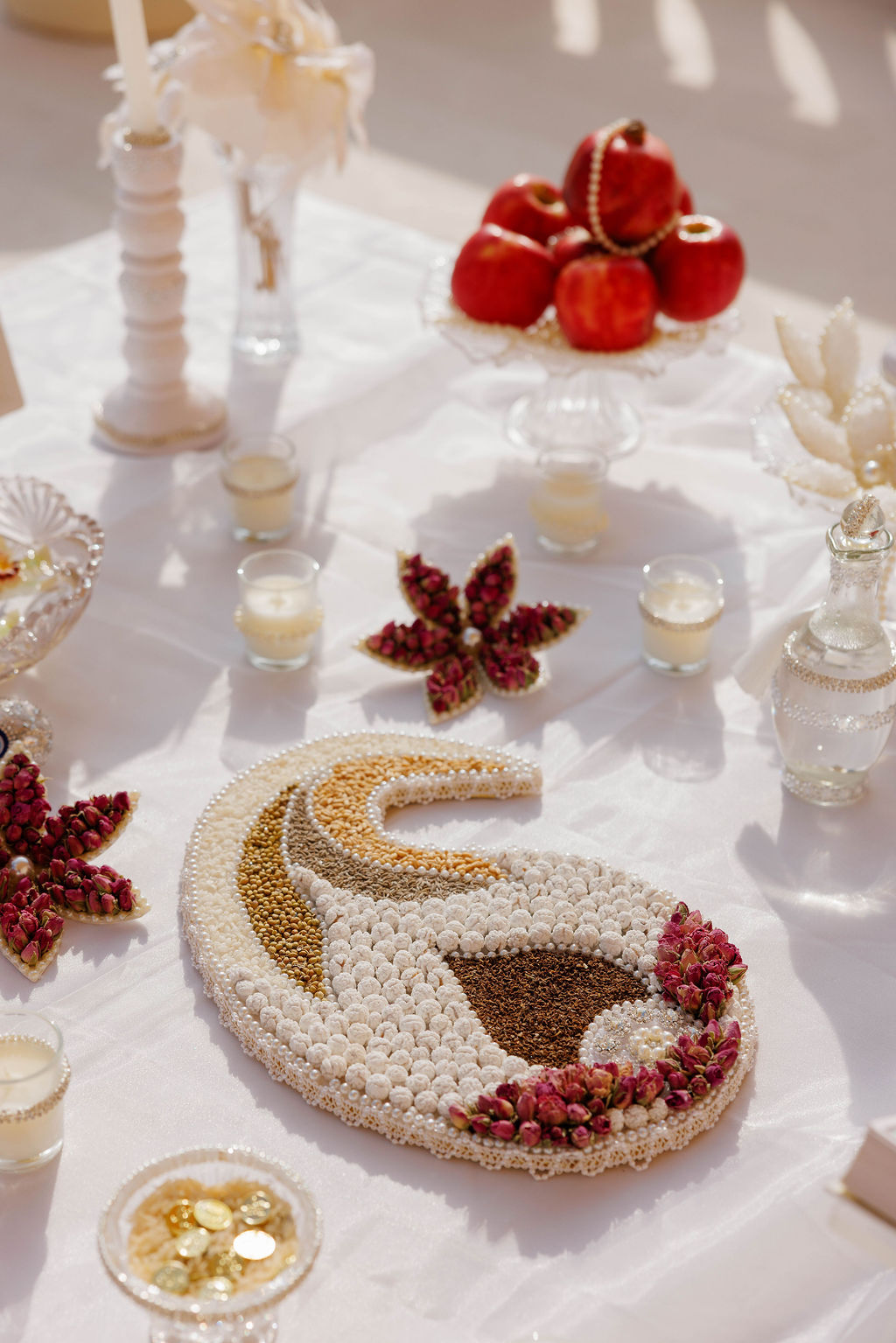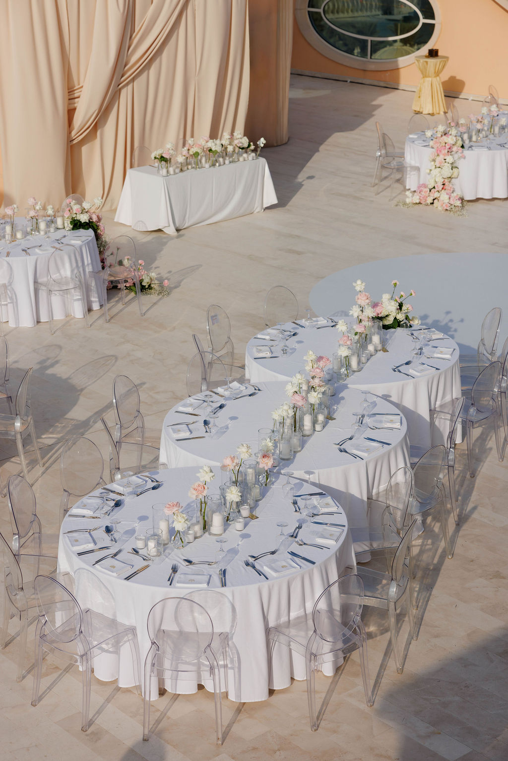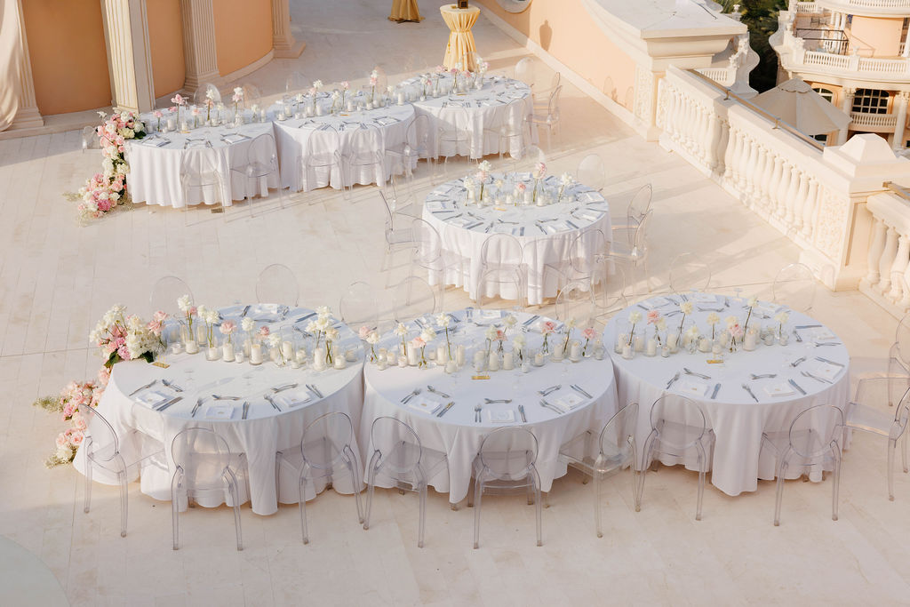 Under the soft glow of a Dubai sunset, guests gathered on a secluded white terrace at the Raffles, The Palm, that felt as though it were floating between the sky and the sea. With the ocean stretching out in every direction, the atmosphere was one of quiet, timeless luxury. We went for a vintage minimal look, blending crisp whites with just a hint of soft pink to keep things effortless and romantic with lines of shimmering candles. It was the perfect mix of timeless elegance and that breezy, coastal magic