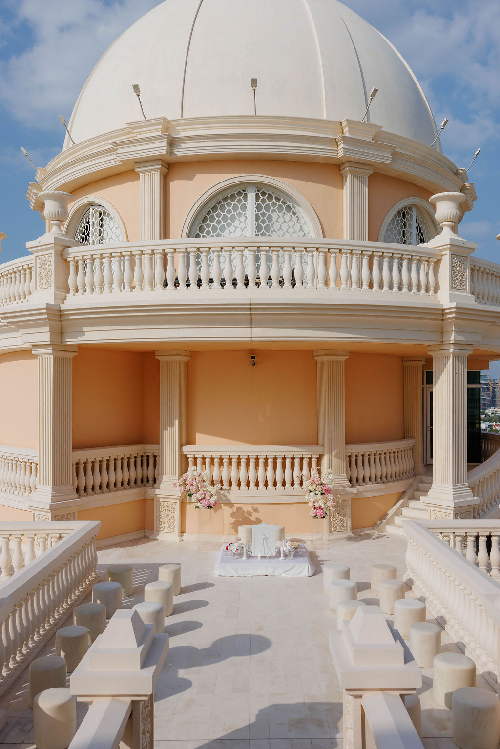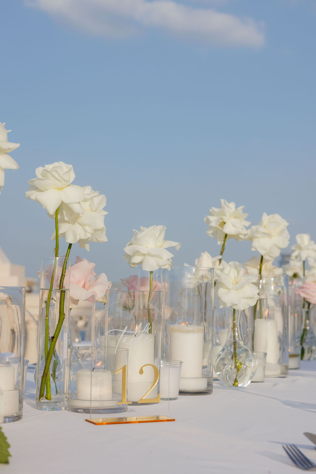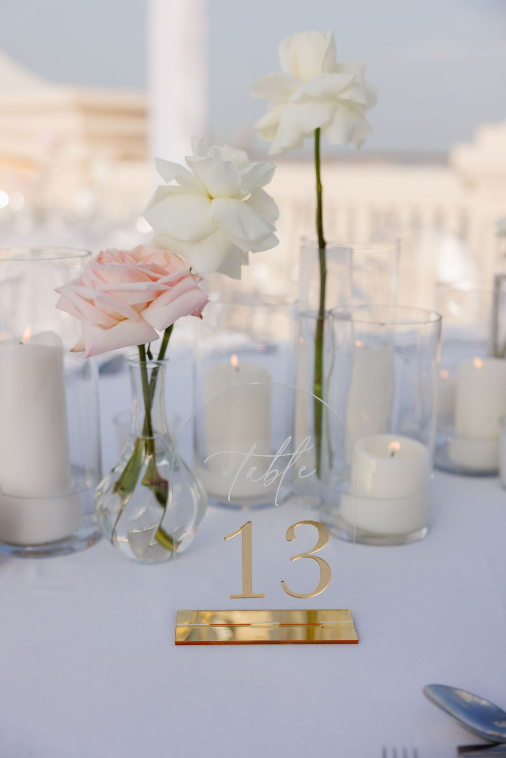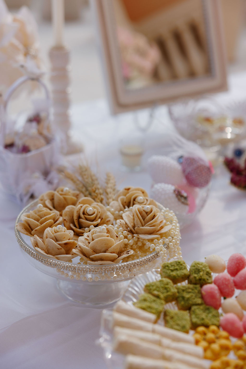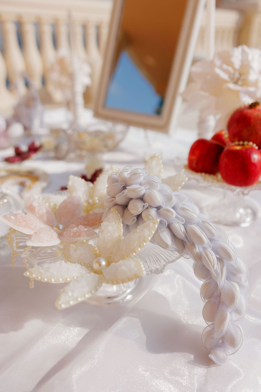 Under the soft glow of a Dubai sunset, guests gathered on a secluded white terrace at the Raffles, The Palm, that felt as though it were floating between the sky and the sea. With the ocean stretching out in every direction, the atmosphere was one of quiet, timeless luxury. We went for a vintage minimal look, blending crisp whites with just a hint of soft pink to keep things effortless and romantic with lines of shimmering candles. It was the perfect mix of timeless elegance and that breezy, coastal magic