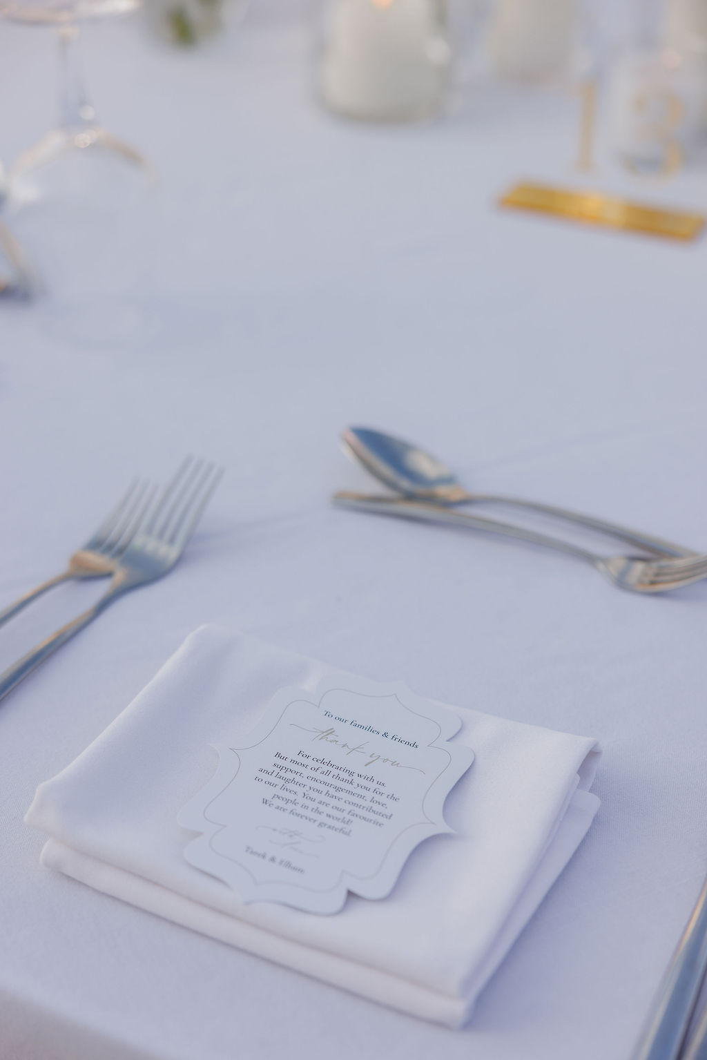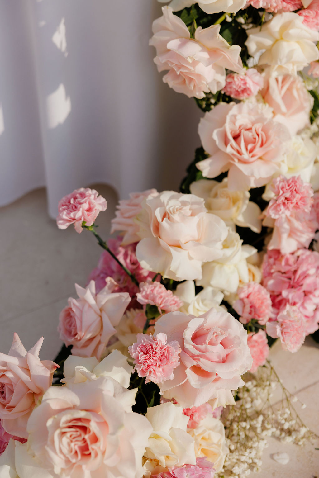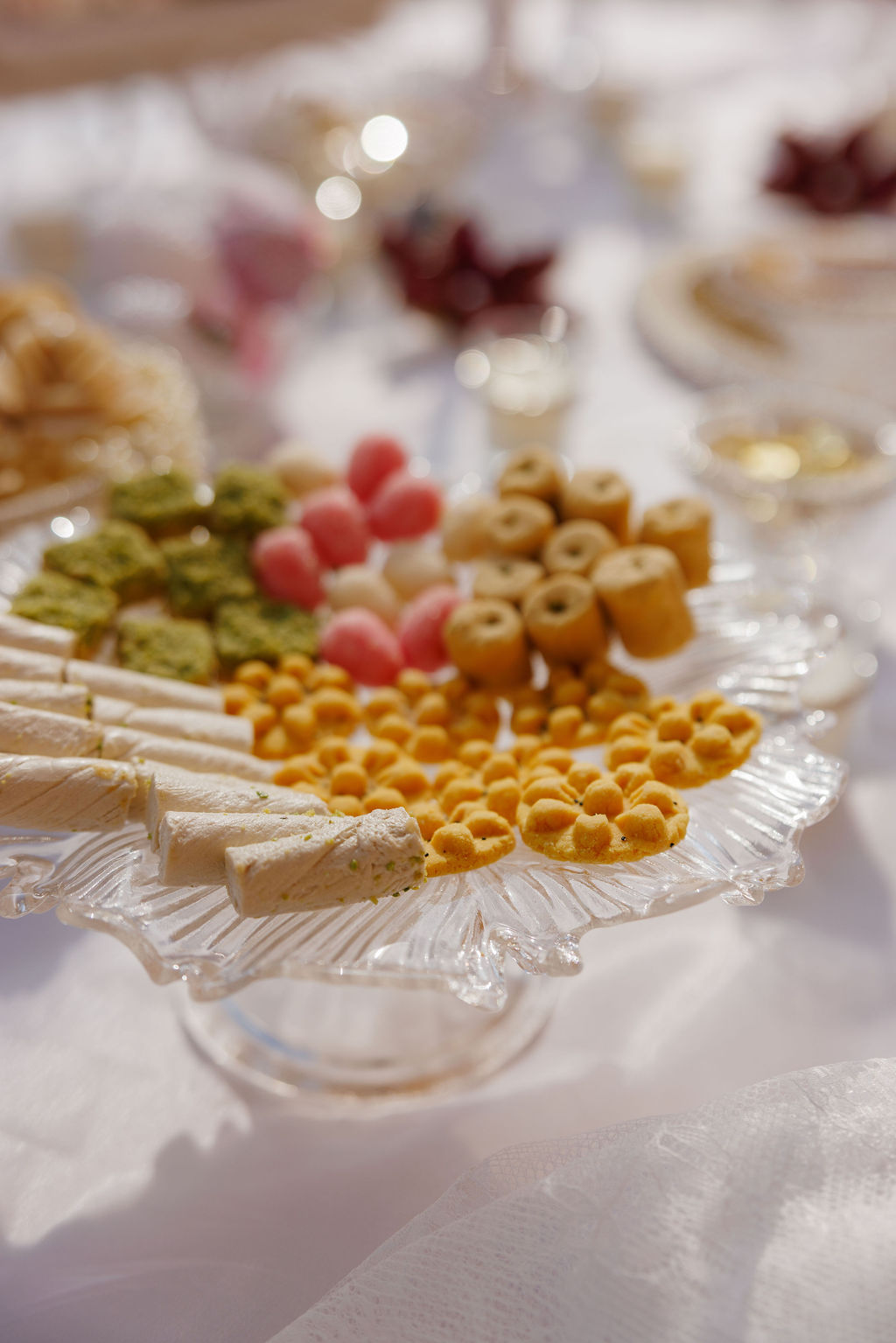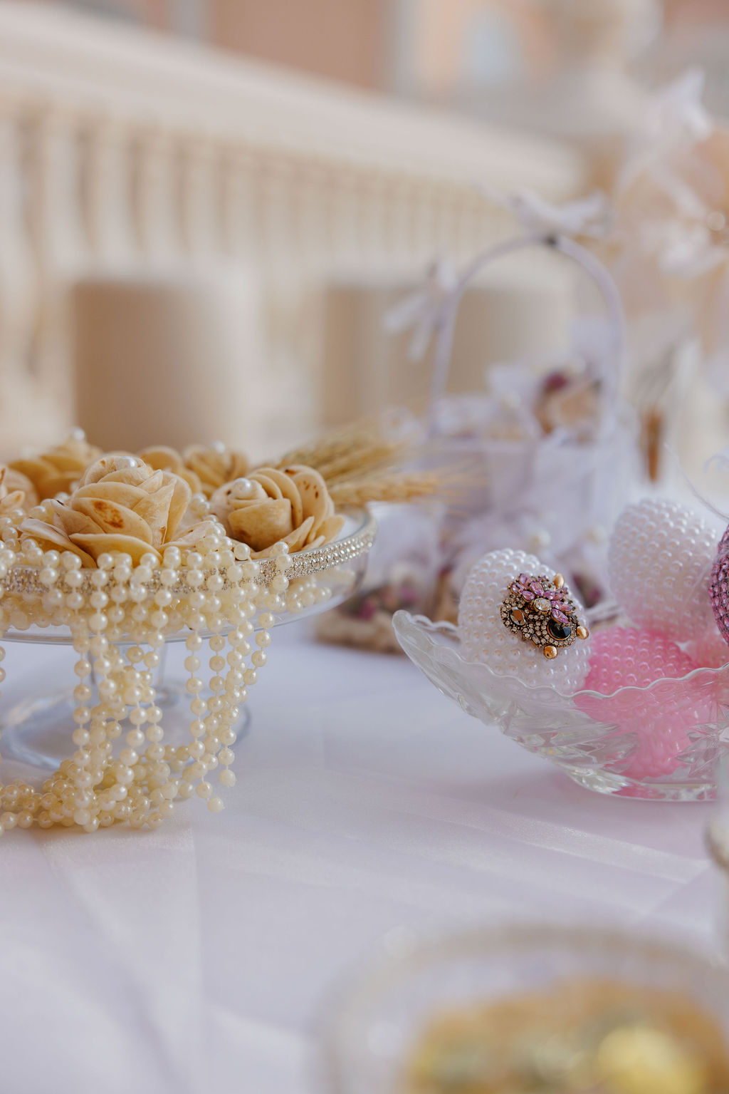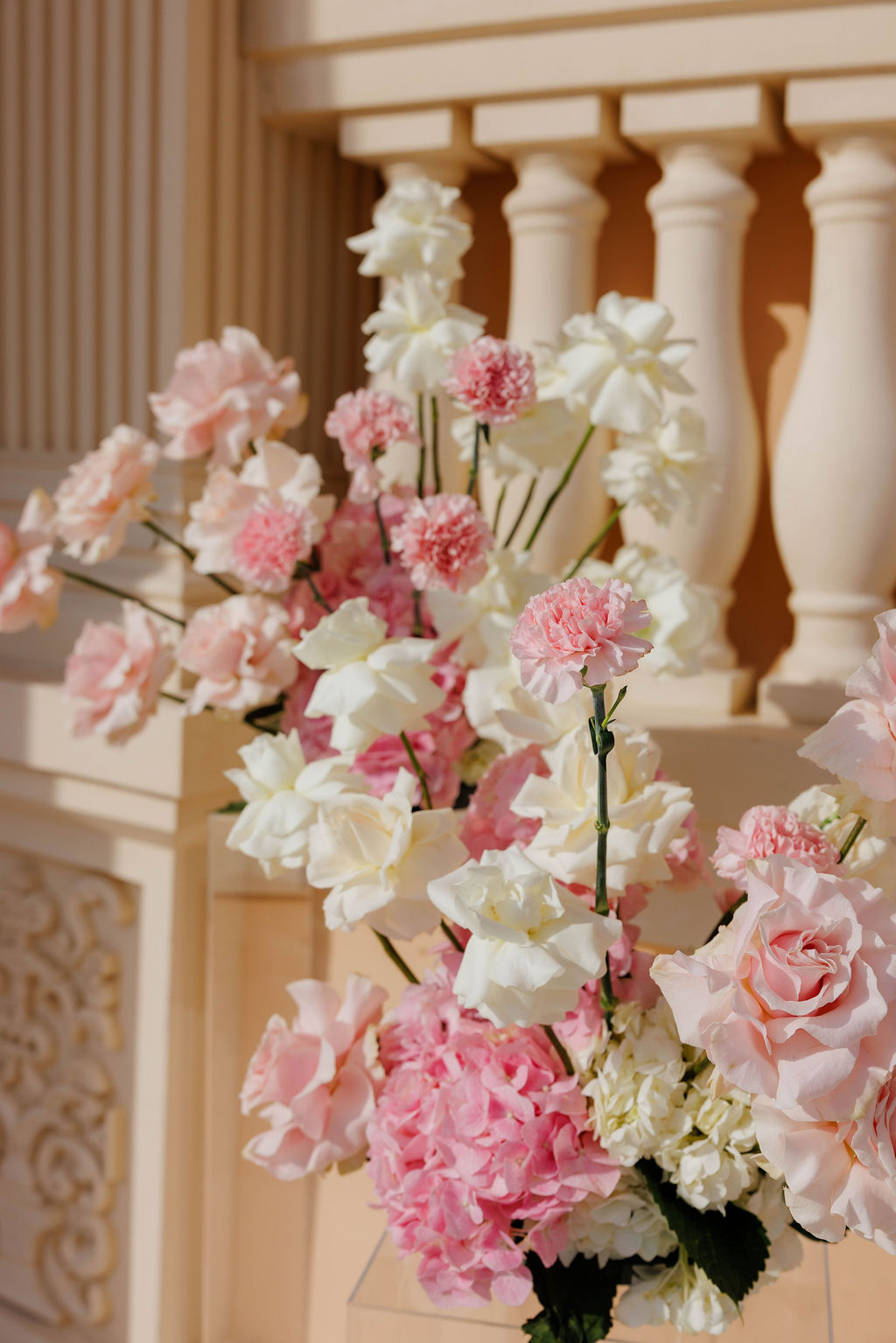 Under the soft glow of a Dubai sunset, guests gathered on a secluded white terrace at the Raffles, The Palm, that felt as though it were floating between the sky and the sea. With the ocean stretching out in every direction, the atmosphere was one of quiet, timeless luxury. We went for a vintage minimal look, blending crisp whites with just a hint of soft pink to keep things effortless and romantic with lines of shimmering candles. It was the perfect mix of timeless elegance and that breezy, coastal magic